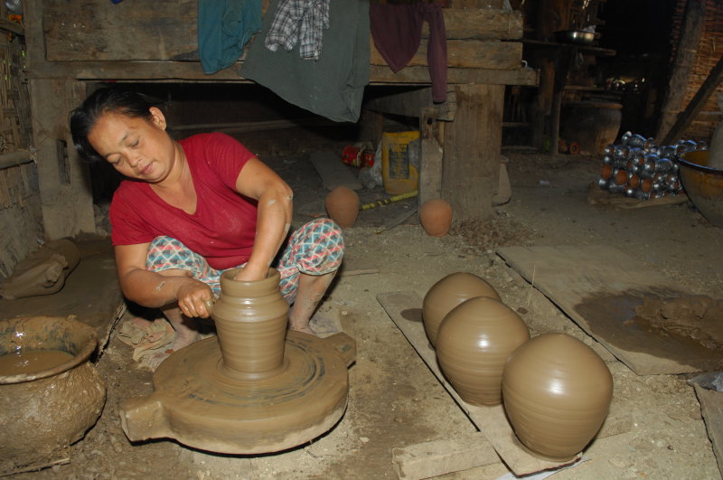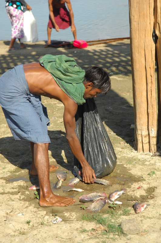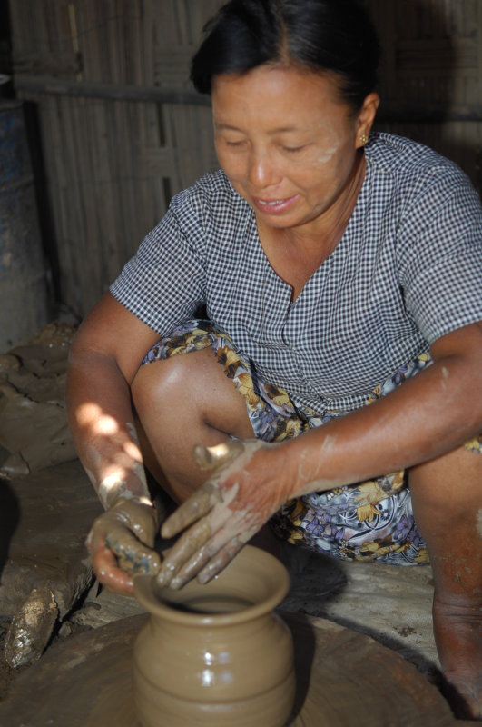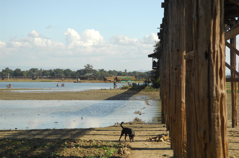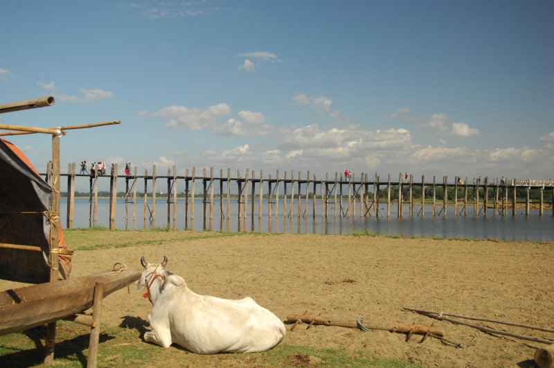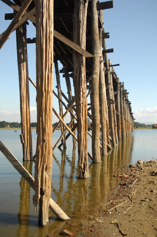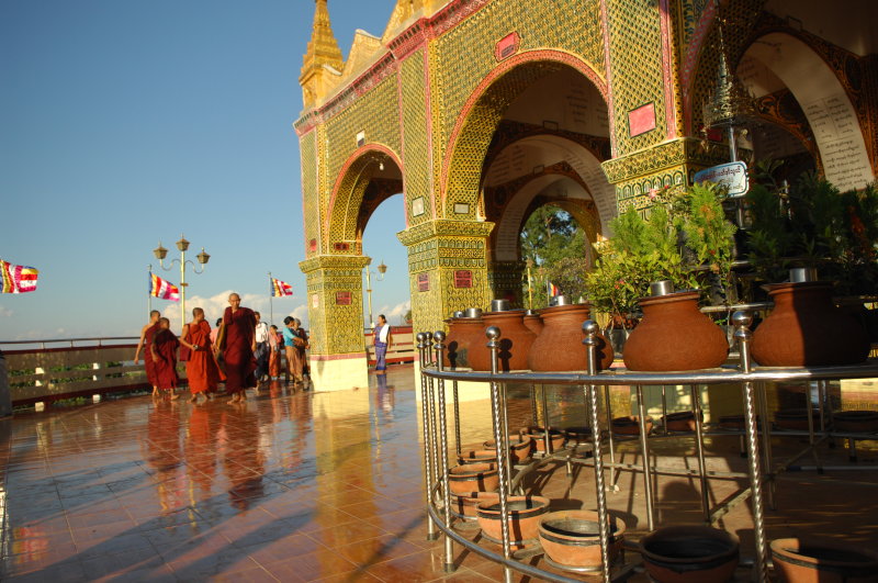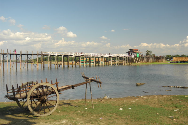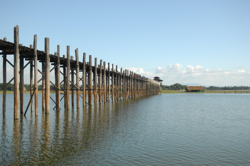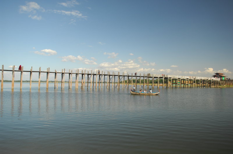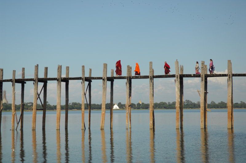 Auf dem Weg zur U Bain Brücke liegt ein Dorf, in dem jede Hütte eine Töpferei ist. Hier werden die Drehscheiben noch von Hand gedreht und das Rohmaterial kommt aus dem Irrawaddy. Weiter geht’s zur berühmtesten Brücke Myanmars. Die U Bain Brücke ist mit 2 Kilometern die längste Teakholzbrücke der Welt. Wenn man allerdings in Richtung Fluss marschiert, merkt man schnell, dass der Zahn der Zeit in den letzten 120 Jahren seinen Tribut gefordert hat. Mit einer Sanierung wurde angeblich bereits an der anderen Uferseite begonnen. Da diese aber aus eigener Kraft und bislang ohne internationale Unterstützung erfolgt, geht es nur langsam voran. Der Zustand einiger Stelzen lässt nichts Gutes erahnen.