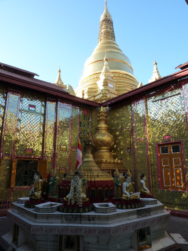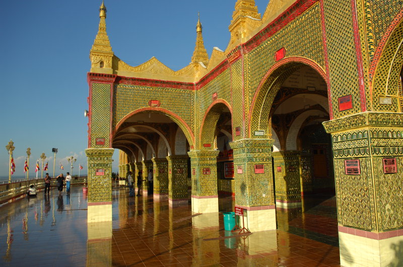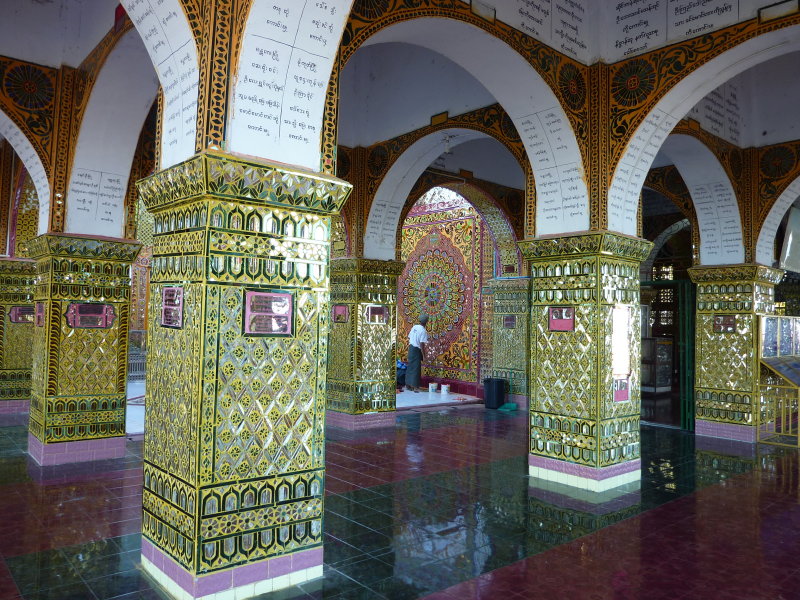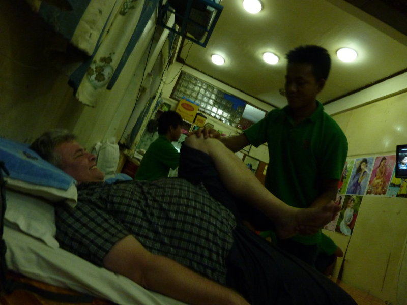 Zum Sonnenuntergang fahren wir auf den Mandalay Hill. Die Su Taung Pyai Pagode hatten wir vor zwei Jahren auch nur im Regen gesehen. Jetzt blitzten und blinkten die Spiegelfassaden im Abendlicht. Es ist bereits dunkel geworden, als uns So So zu seiner Lieblingsmassage bringt. Zu unserer Überraschung kennen wir diesen Platz bereits. Ein weiteres Indiz für die Qualität unseres Guides, der unserer Meinung nach für Sightseeing in Mandalay ist. Leider verbietet ihm seine Frau längere Abwesenheiten vom heimischen Herd.