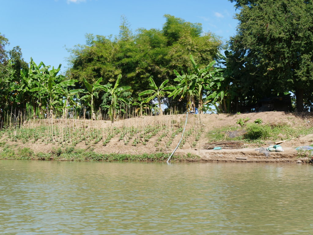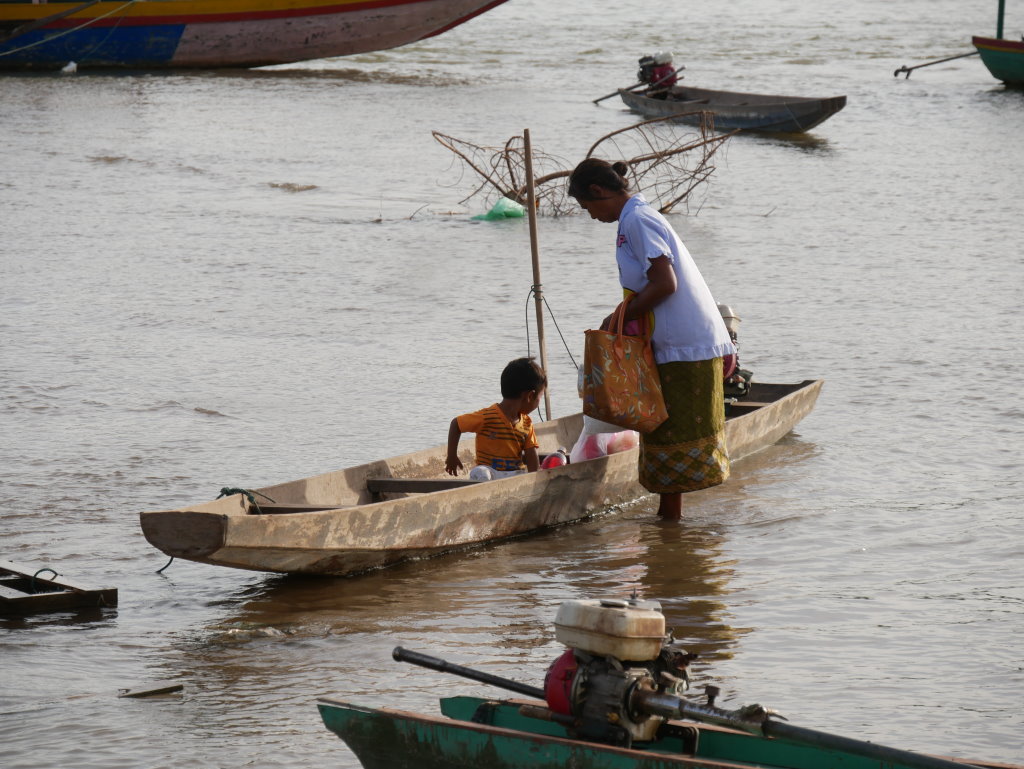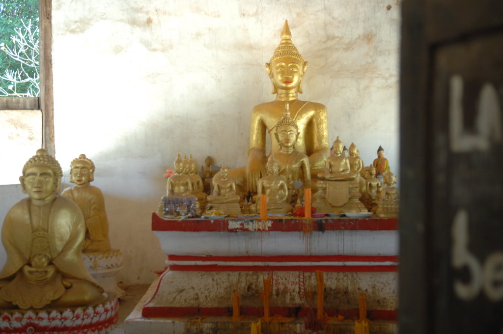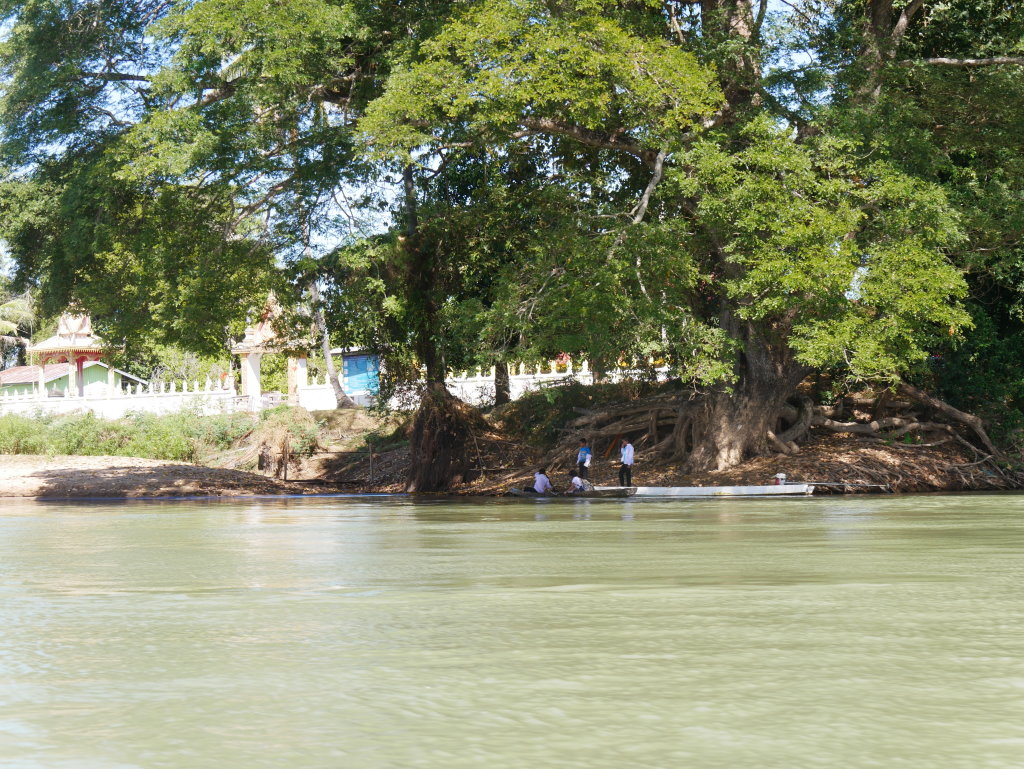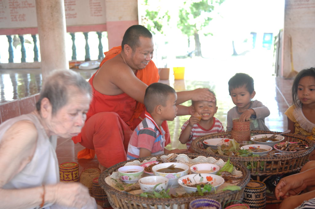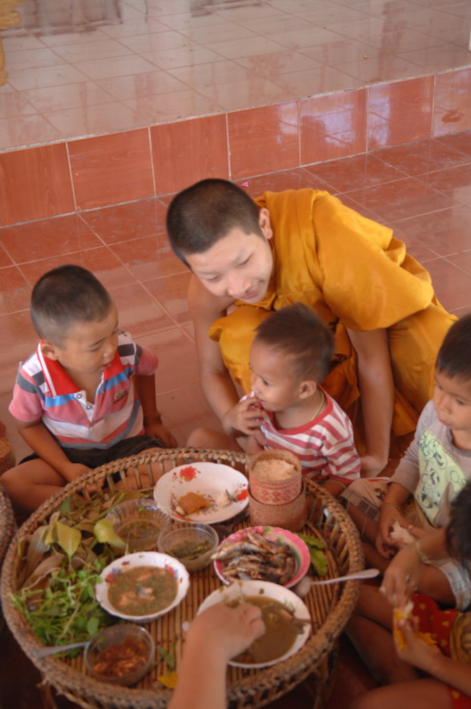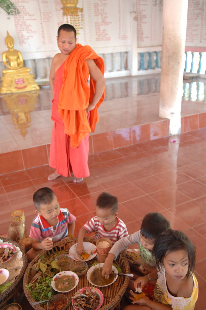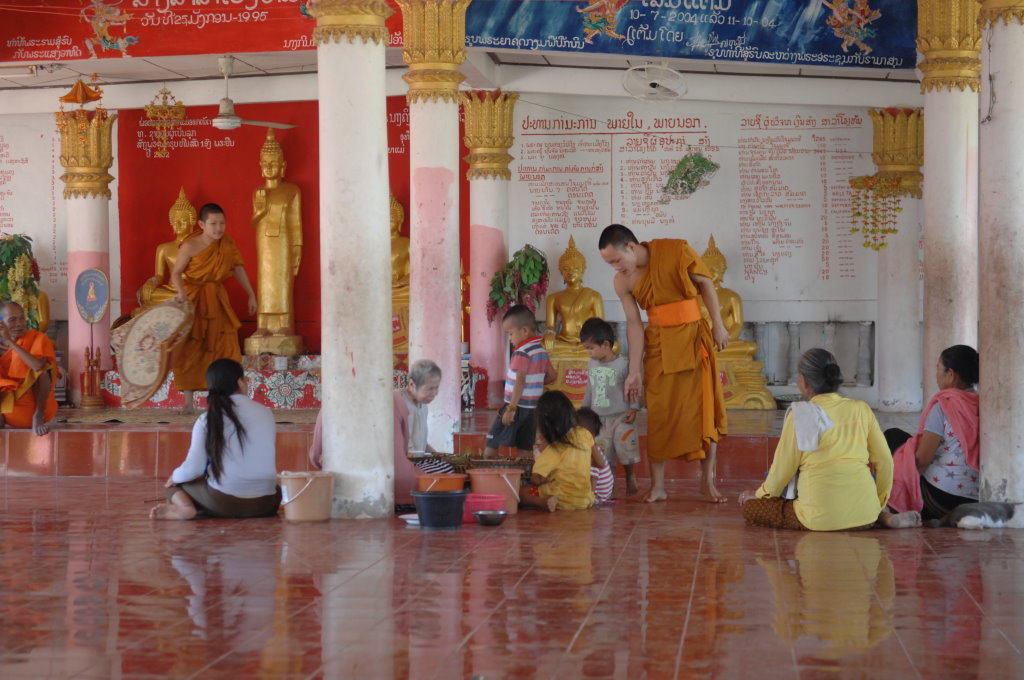 Vor der Abfahrt mit dem schmalen Einbaum ist noch Zeit für einen zweiten Besuch im Kloster am Ortsende. Die Mönche haben gerade ihr Essen beendet, das sie am Vormittag im Dorf in ihre schwarzen Sammeltrommeln gespendet bekamen. Das ist jedes Mal mehr als genug, weshalb anschließend Kinder und Alte in den Genuss der restlichen Speisen kommen.