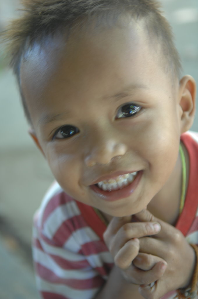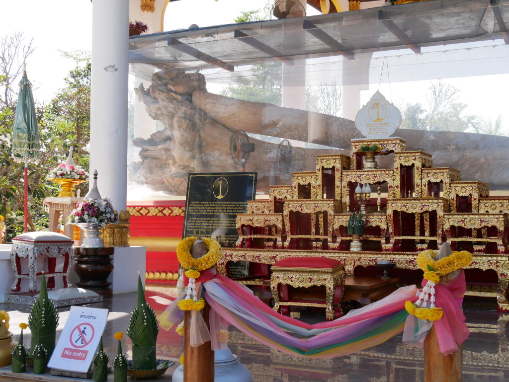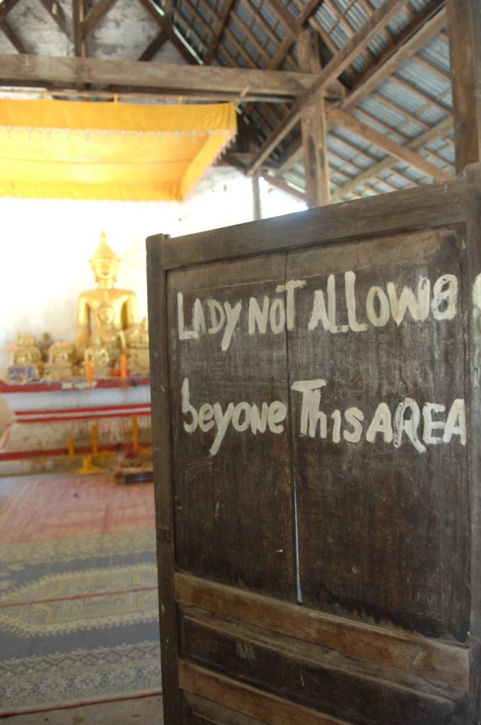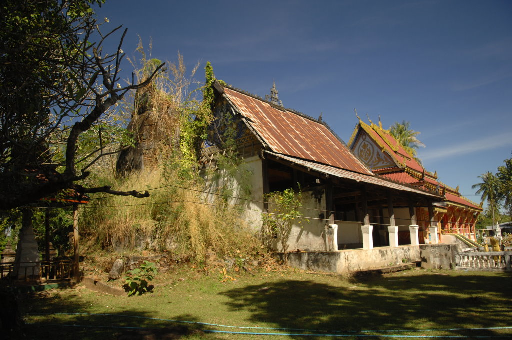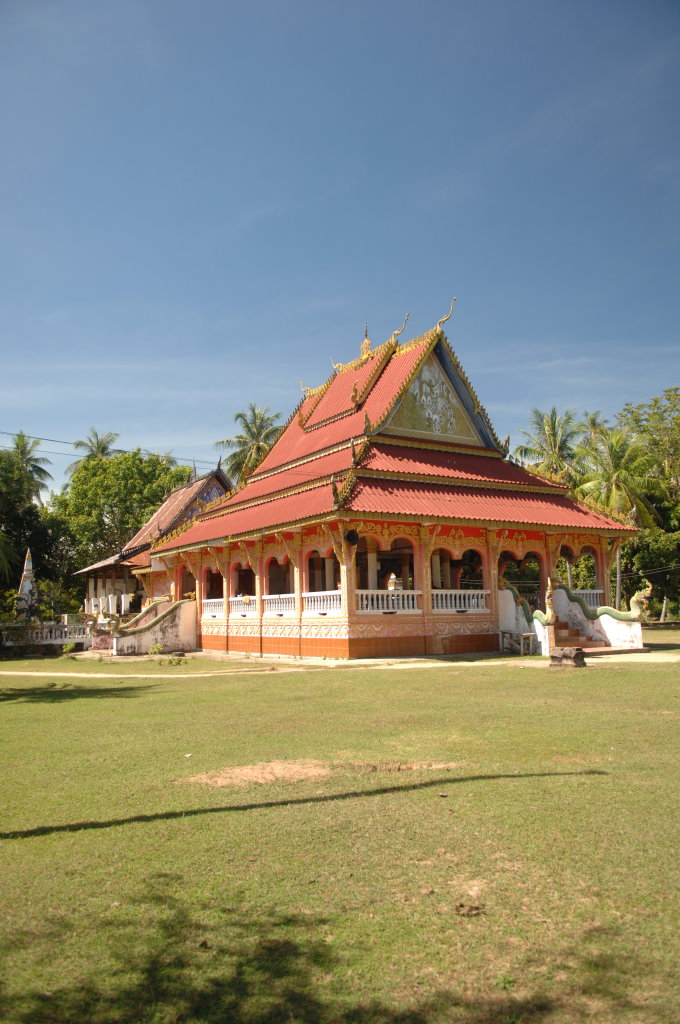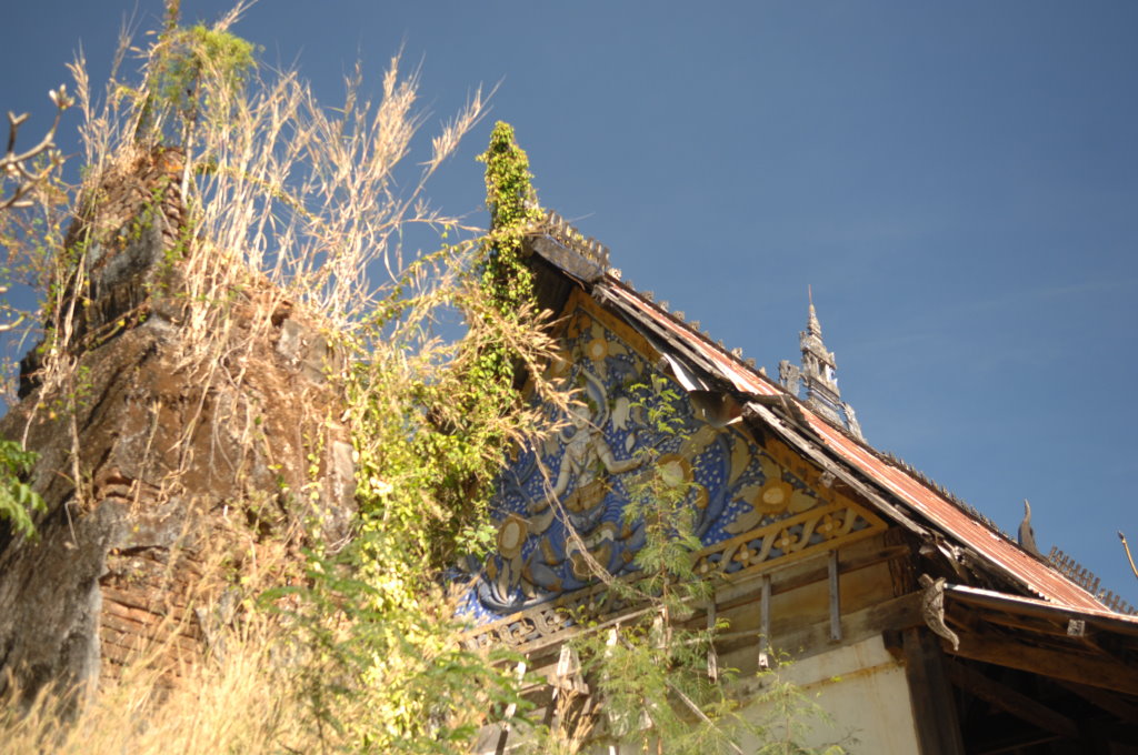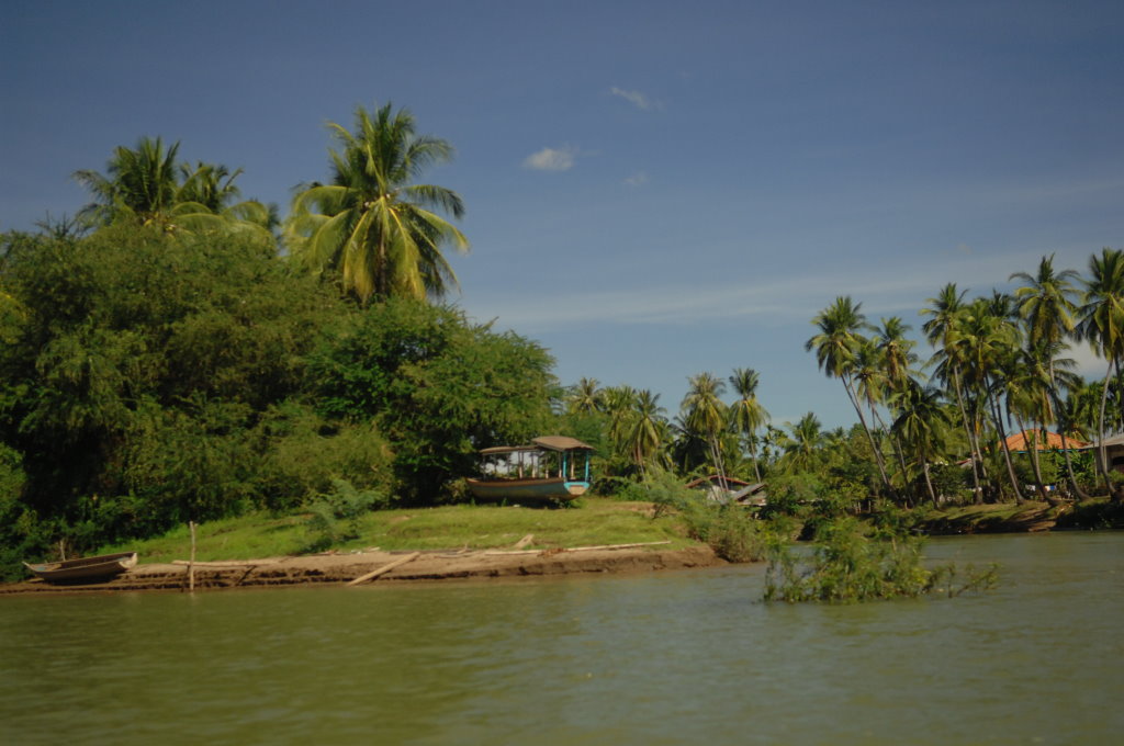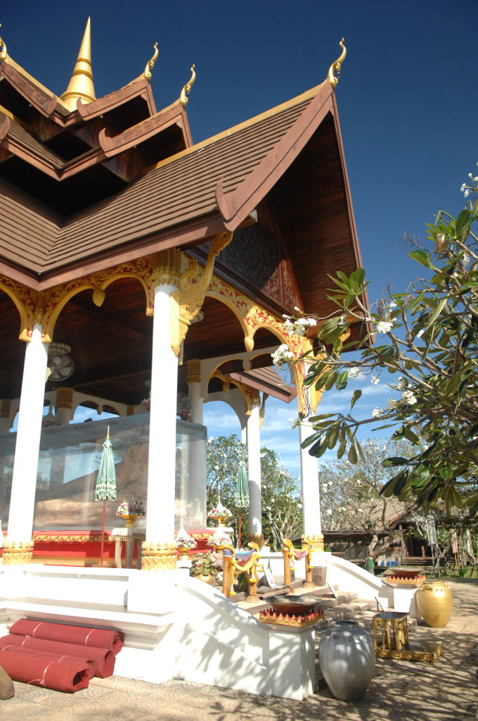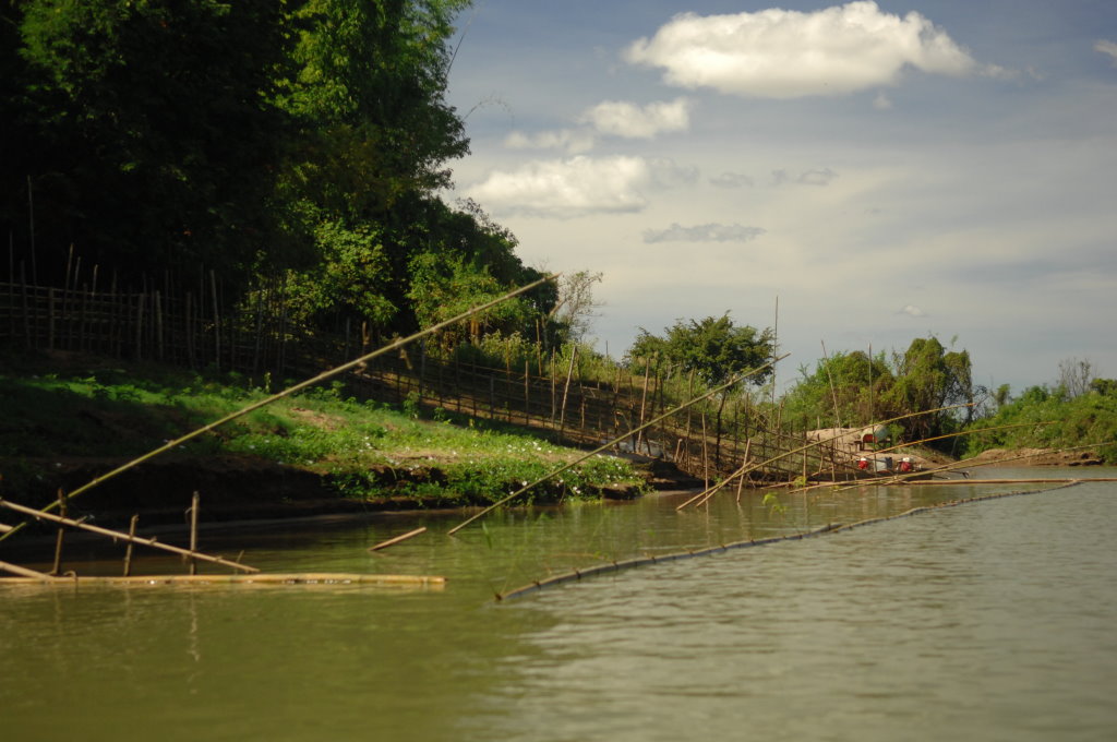 Vor der Abfahrt mit dem schmalen Einbaum ist noch Zeit für einen zweiten Besuch im Kloster am Ortsende. Die Mönche haben gerade ihr Essen beendet, das sie am Vormittag im Dorf in ihre schwarzen Sammeltrommeln gespendet bekamen. Das ist jedes Mal mehr als genug, weshalb anschließend Kinder und Alte in den Genuss der restlichen Speisen kommen.
