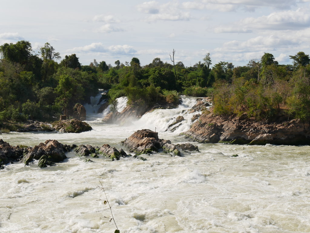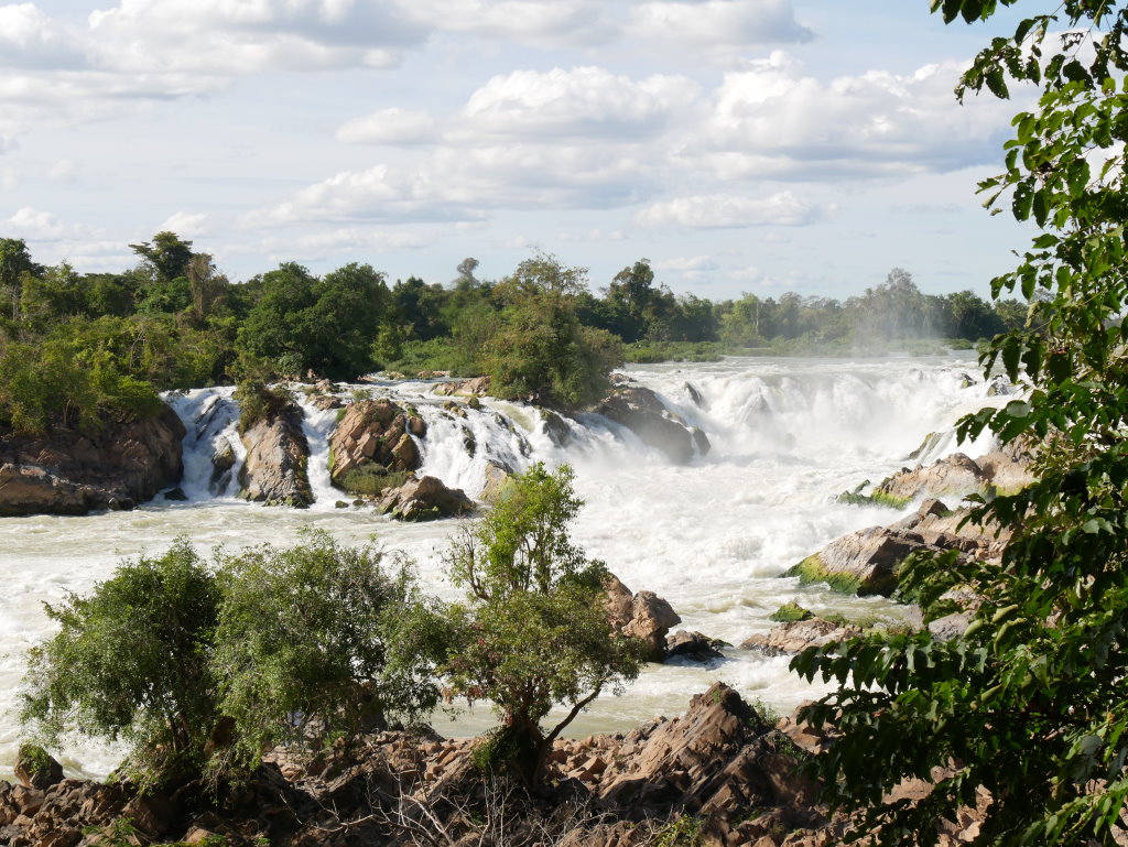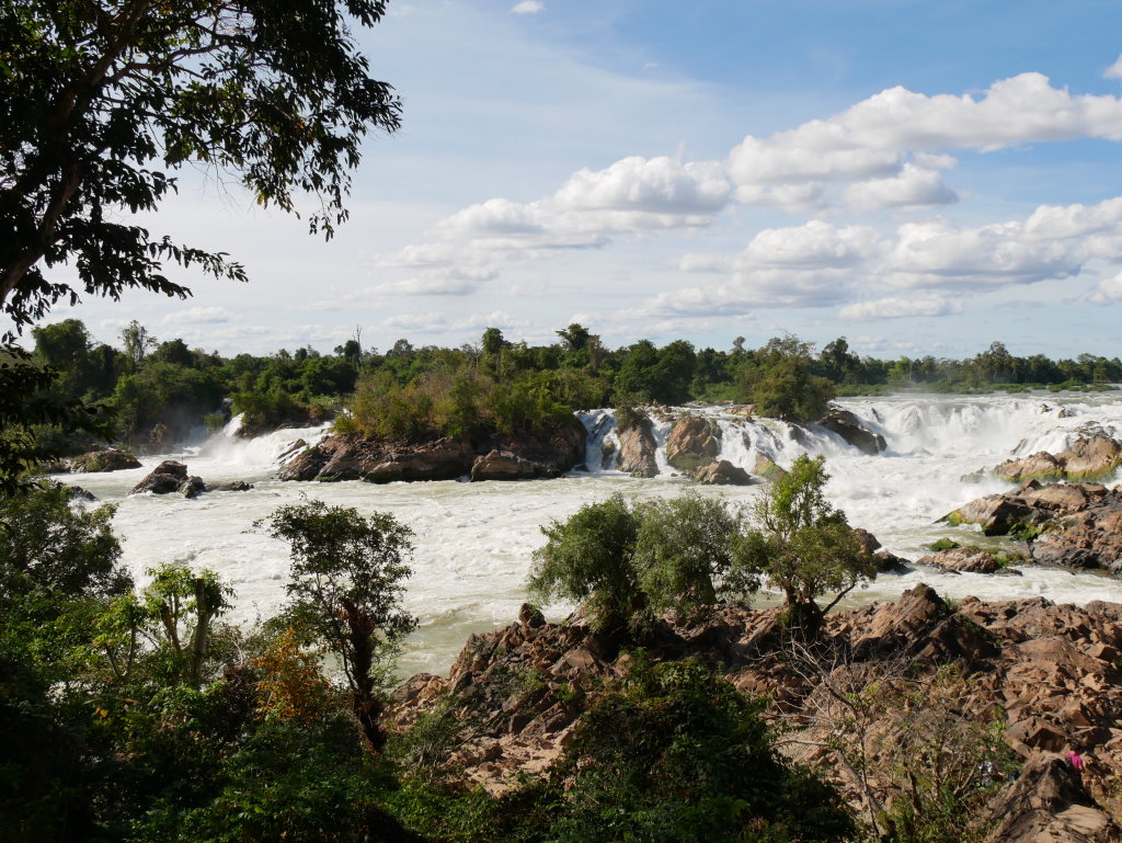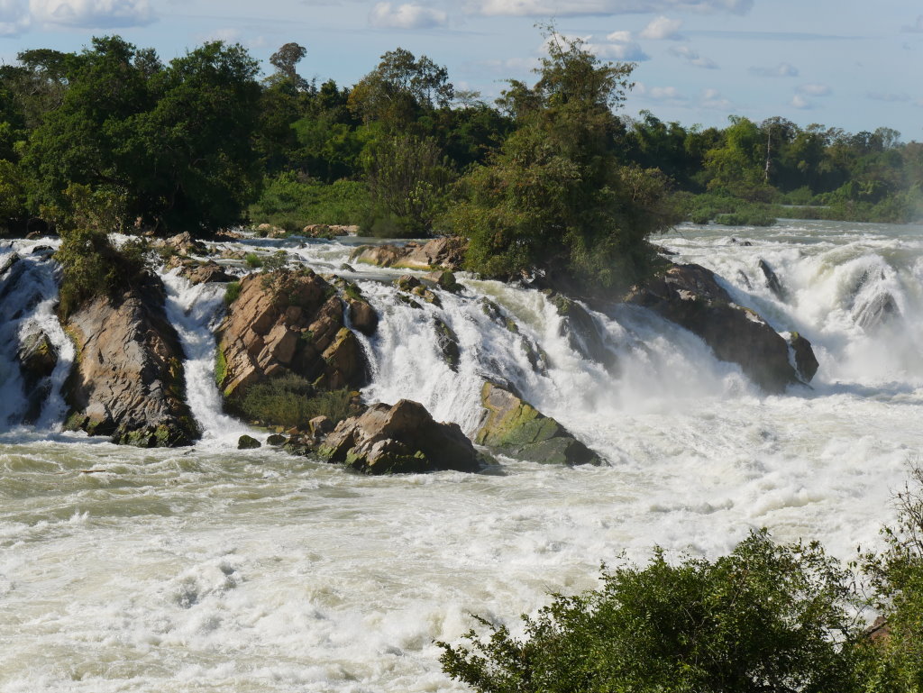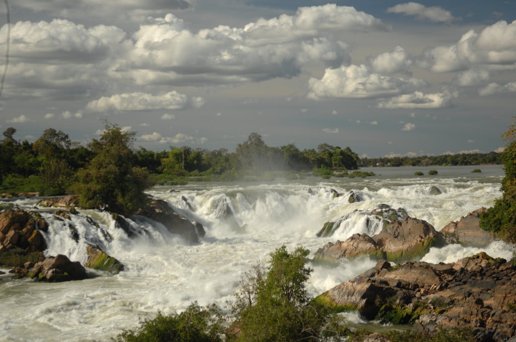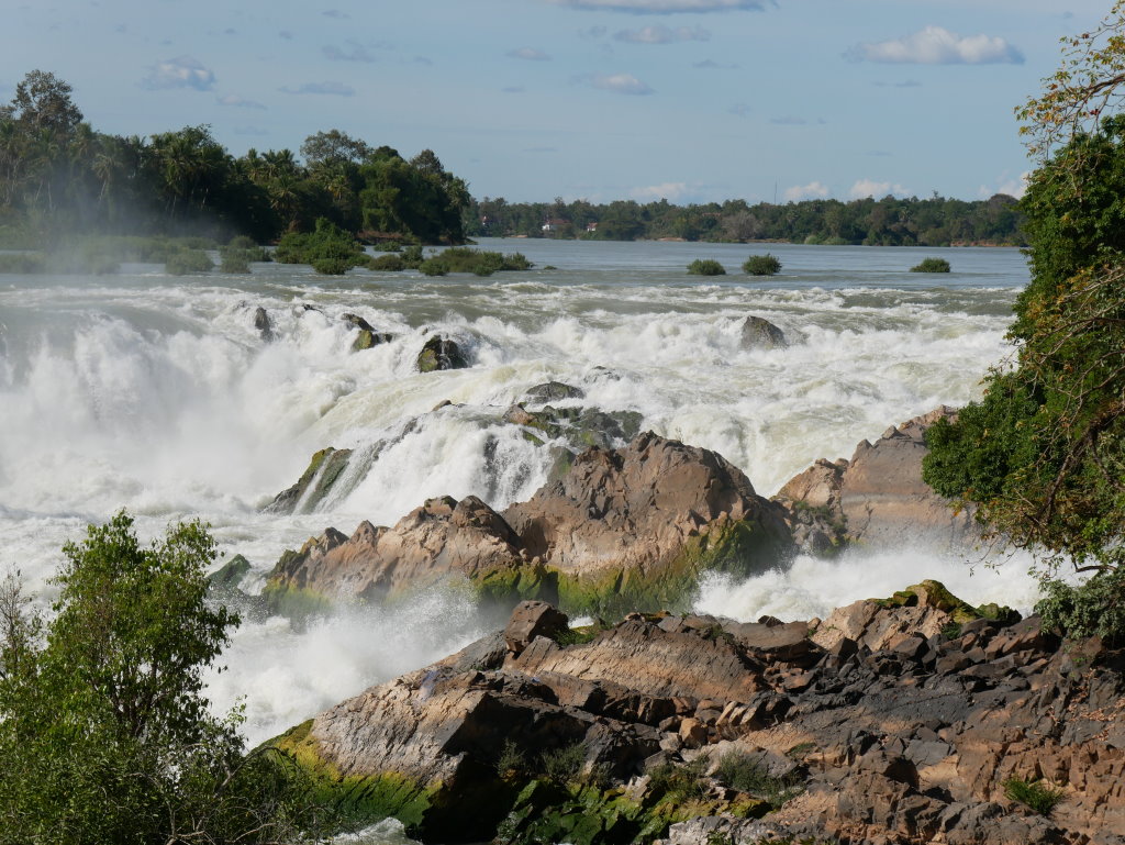 Der zuvor noch ruhig und breit dahin mäandernde Strom stürzt auf einer Breite von rund 10 Kilometern in Kaskaden bis zu 21 Meter in die Tiefe. Damit halten die Mekongfälle den Rekord als weltweit breitester Wasserfall.