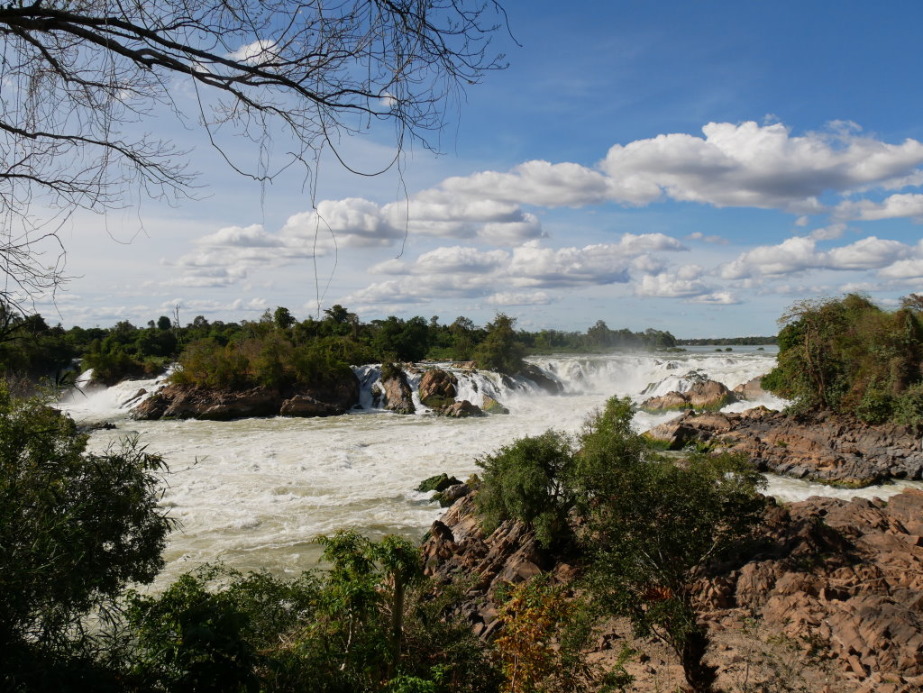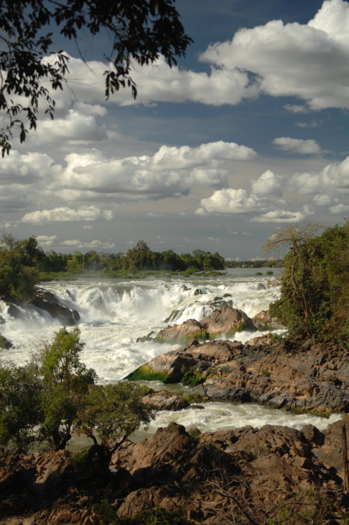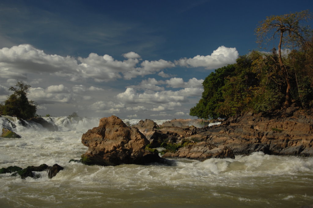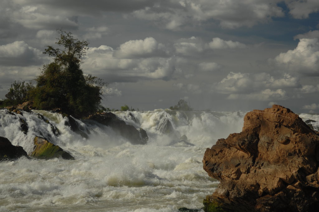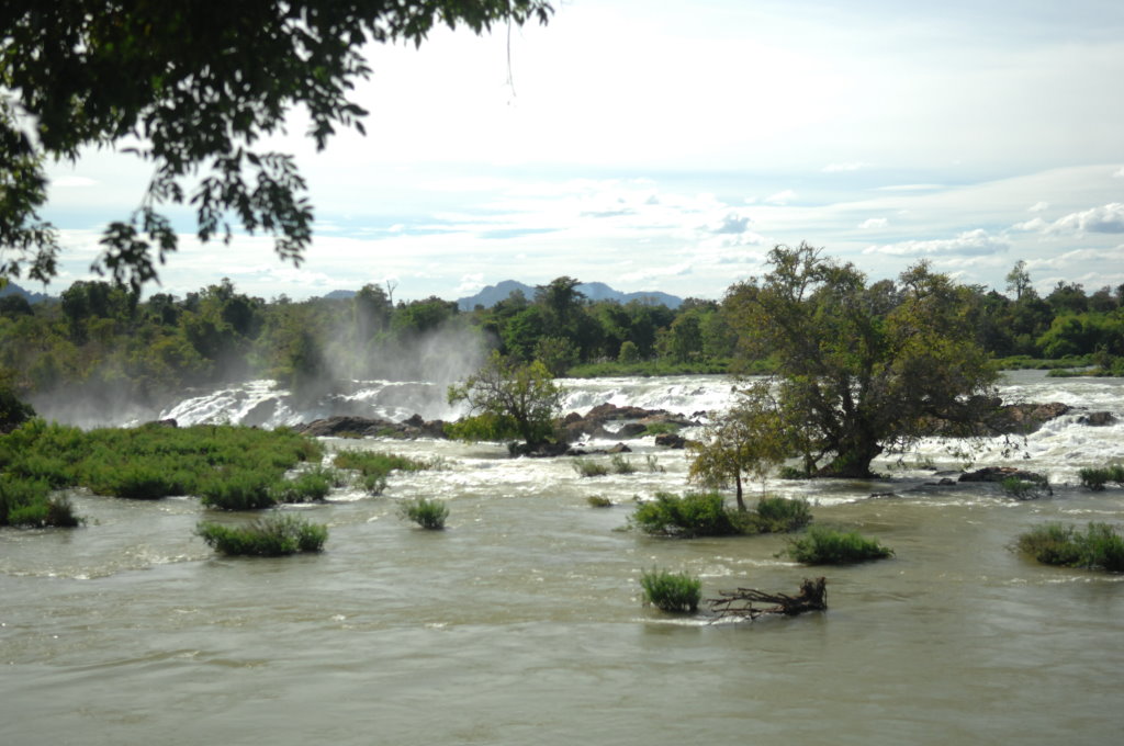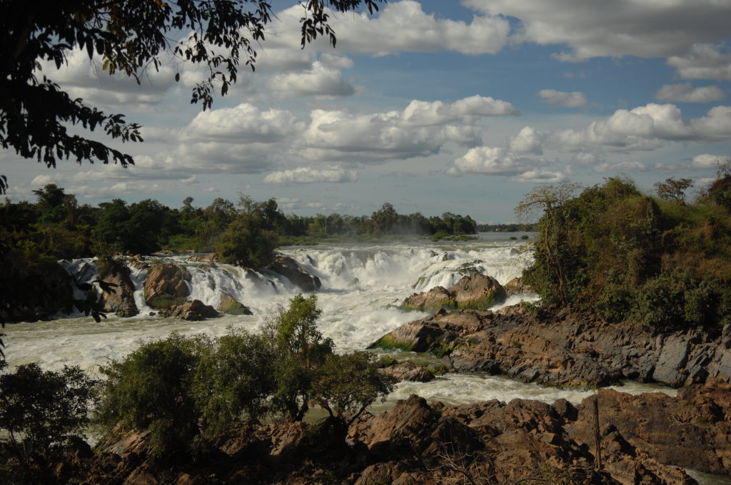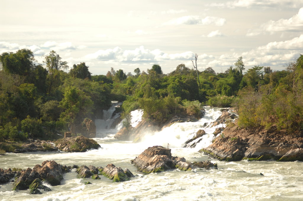 Der zuvor noch ruhig und breit dahin mäandernde Strom stürzt auf einer Breite von rund 10 Kilometern in Kaskaden bis zu 21 Meter in die Tiefe. Damit halten die Mekongfälle den Rekord als weltweit breitester Wasserfall.