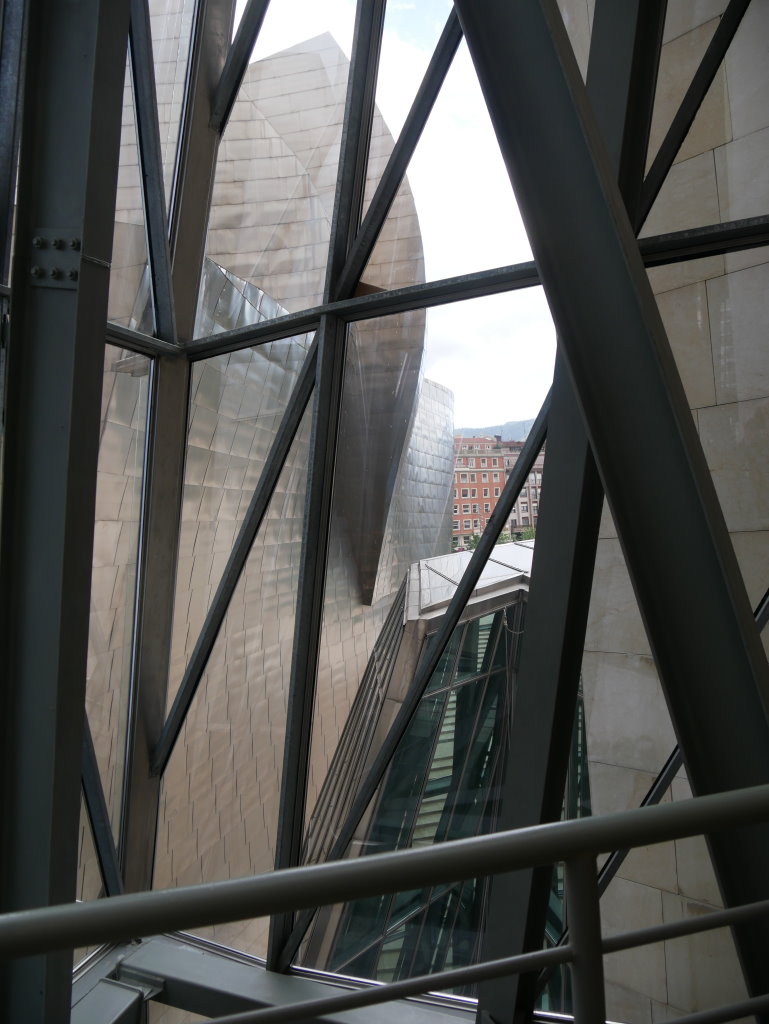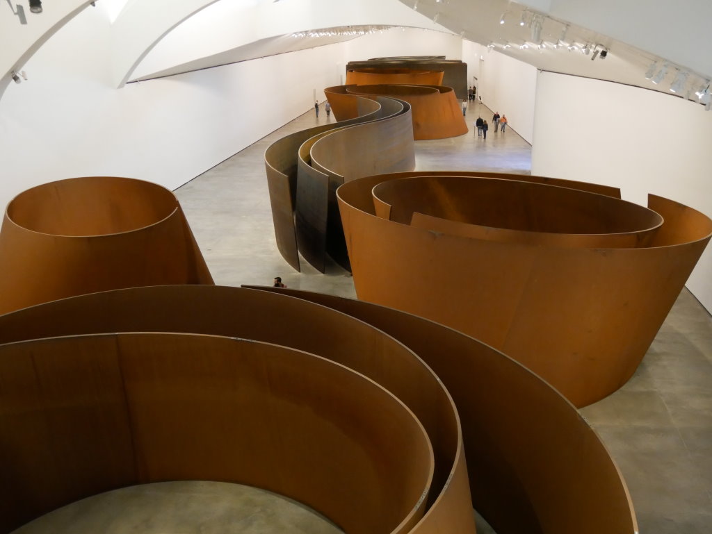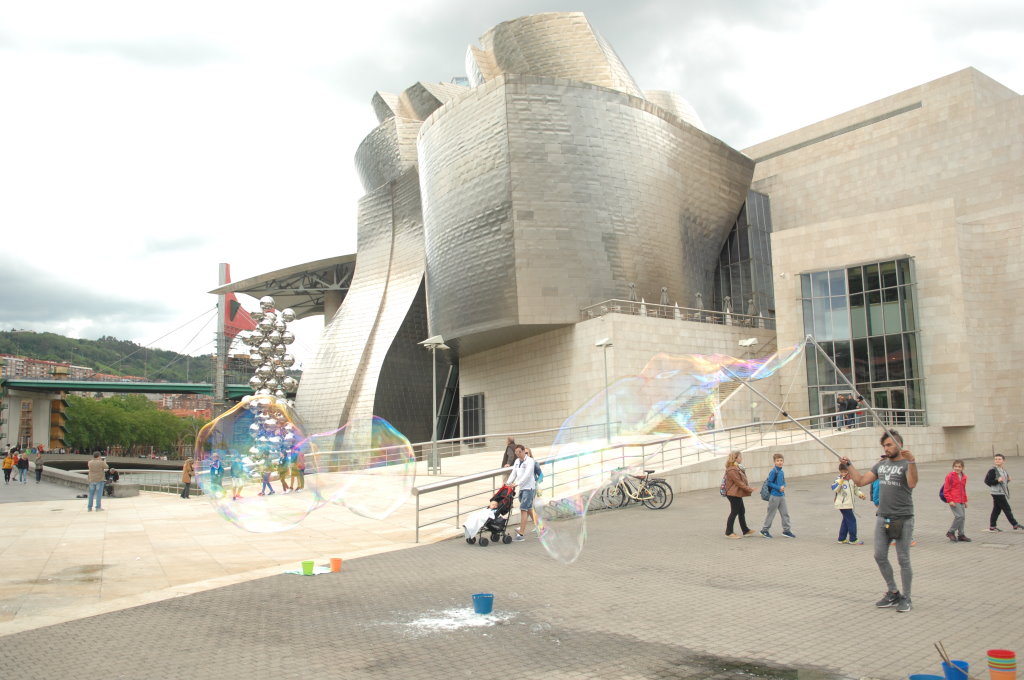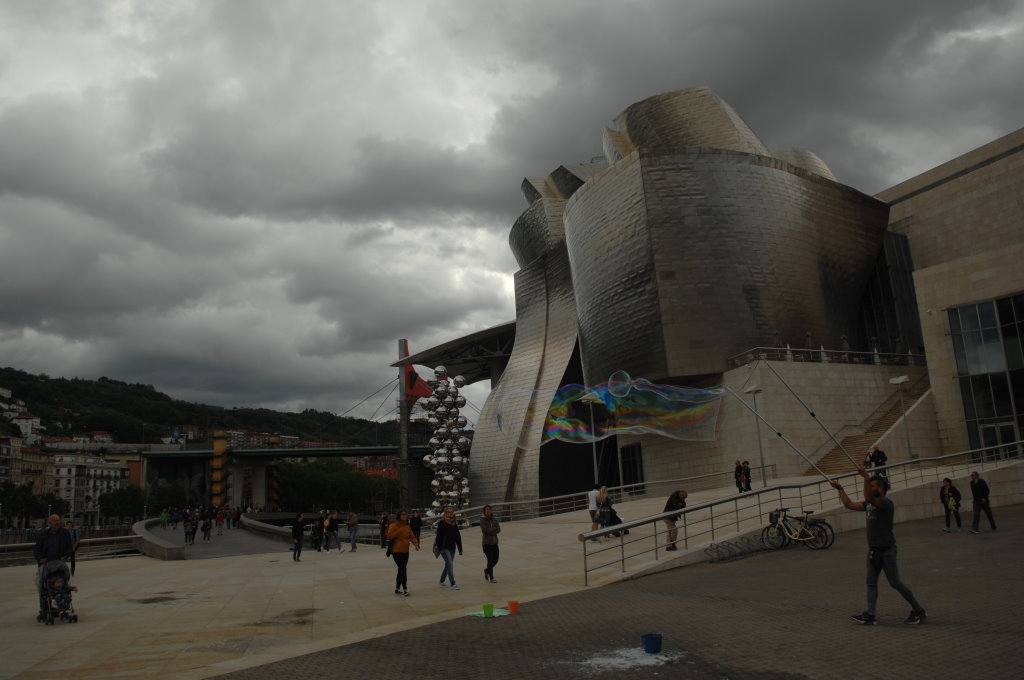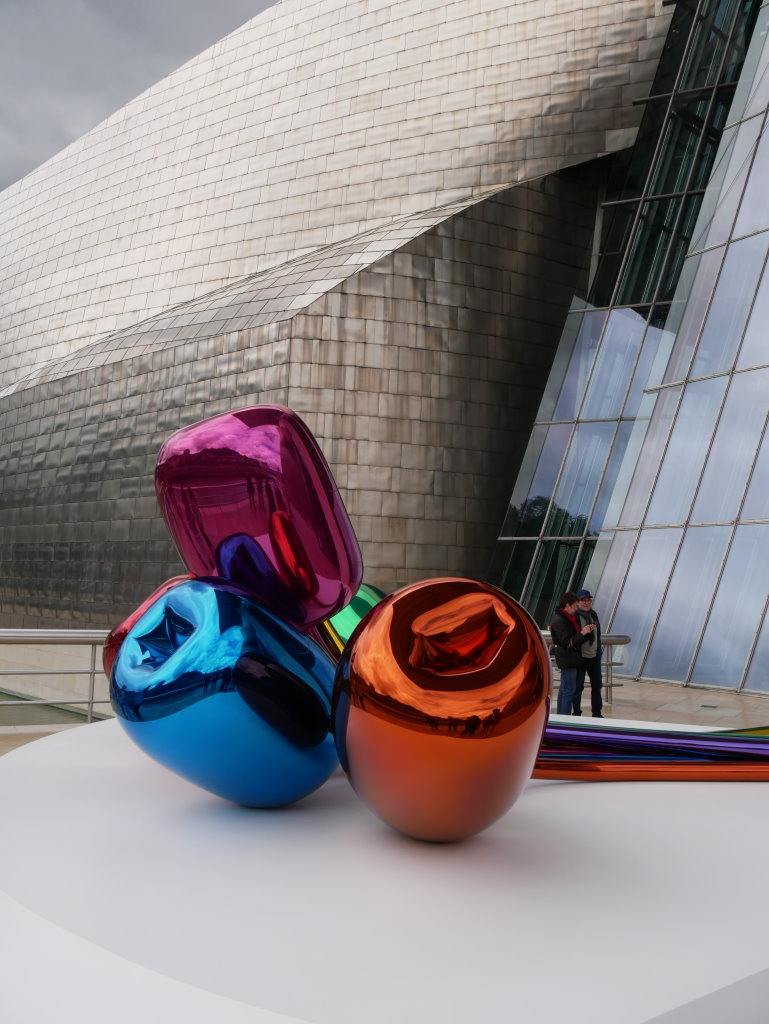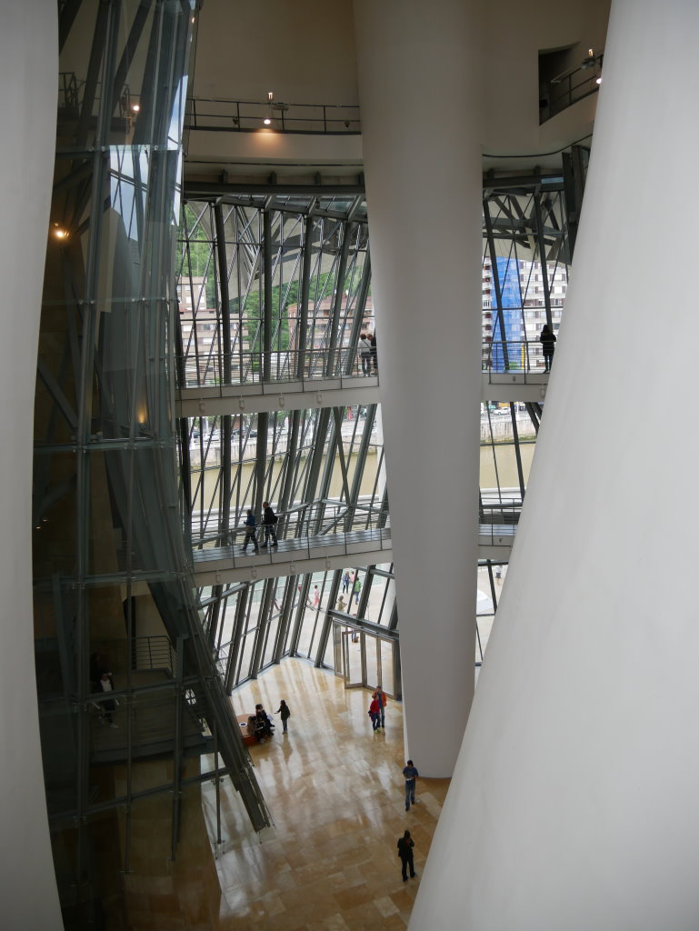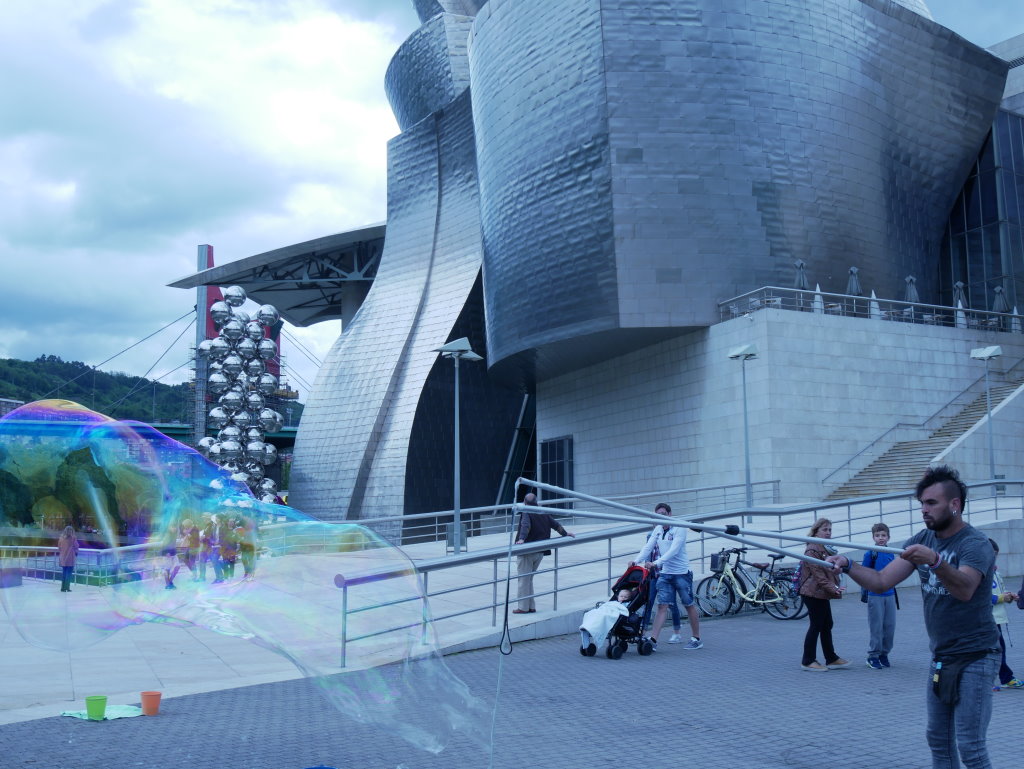 Mittlerweile hat die Sonne sich endgültig durch die Wolken gekämpft. Mit der Straßenbahn geht’s am Fluss entlang zum Guggenheim Museum. Allein die Architektur des Gebäudekomplexes aus Glas, Titan und Kalkstein ist überwältigend – außen wie innen.