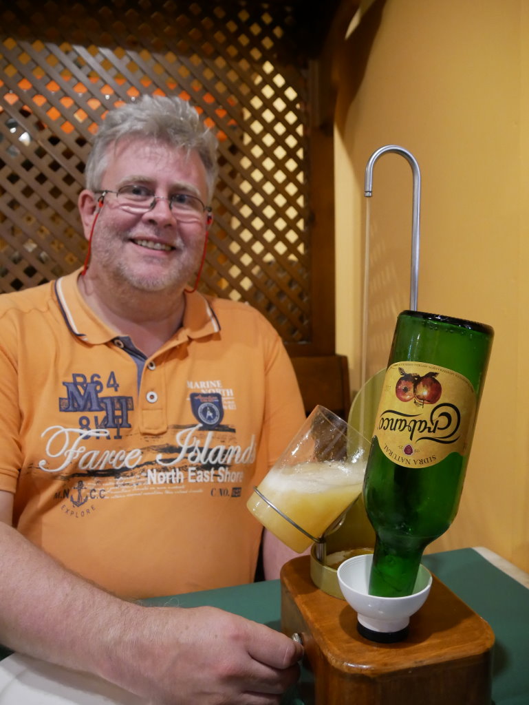 Für das leibliche Wohl sorgen die zahlreichen Ciderias. Damit der Apfelwein so richtig in den Gläsern schäumt, kann er entweder in hohem Bogen aus der Flasche eingegossen werden oder mit Hilfe einer speziellen Konstruktion mit dem gewissen Quäntchen Sauerstoff versetzt werden.