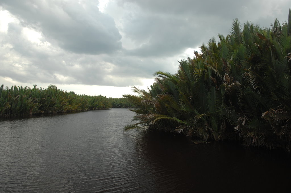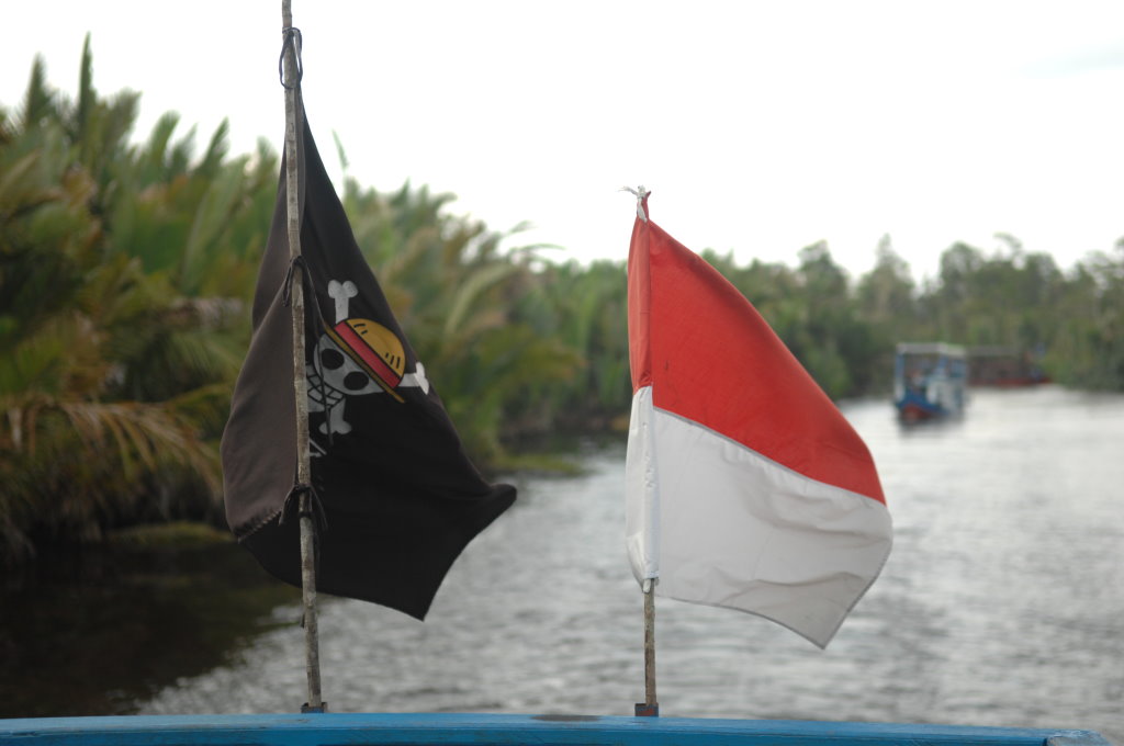 Neben der indonesischen Flagge flattert eine Piratenflagge, eine Reminiszenz an die Anime-Serie, die dem Boot ihren Namen gab. Bereits nach wenigen Minuten biegt die „One Piece Star“ in den Sekonyer-Fluss ein – links die (versteckten) Plantagen, rechts der Tanjung Puting Nationalpark. Der Name des Flusses leitet sich von der „Sikunir“ ab, einem Piratenschiff, das hier 1832 gesunken ist.