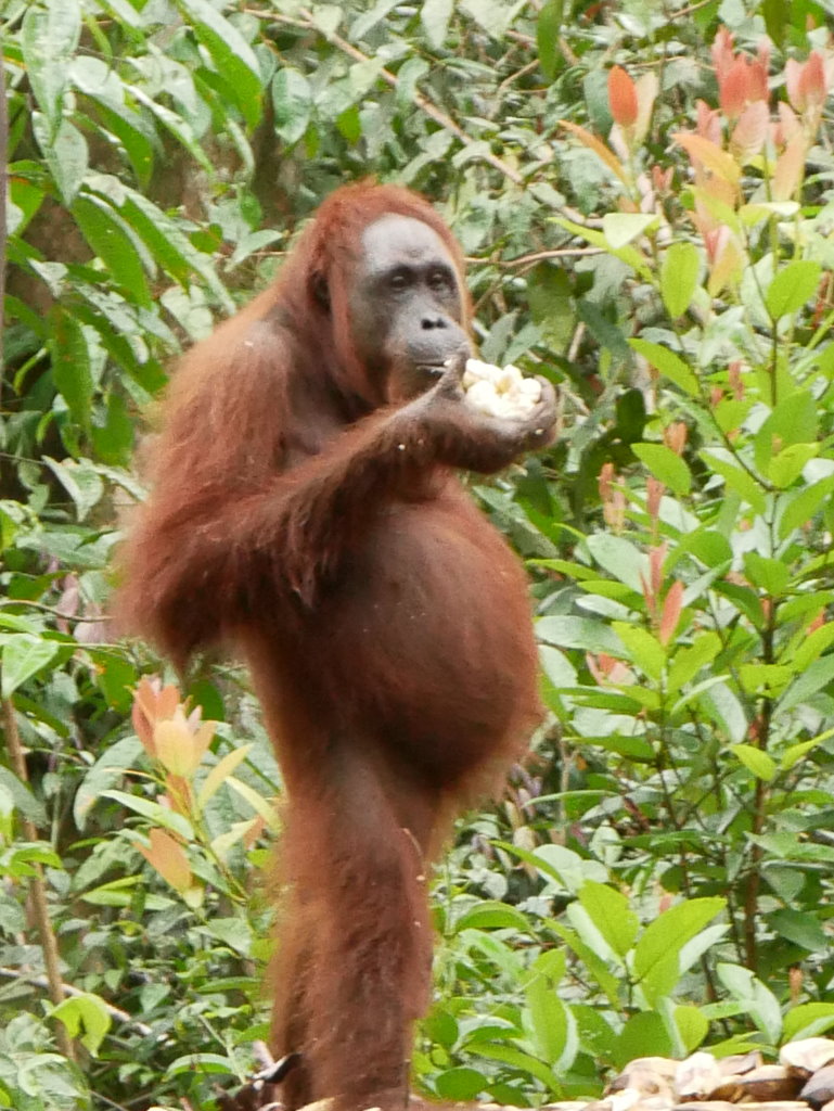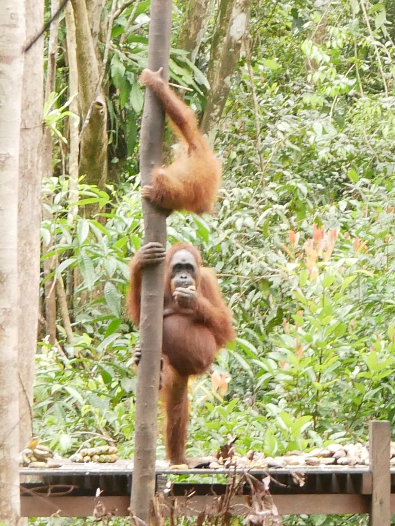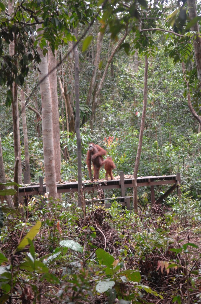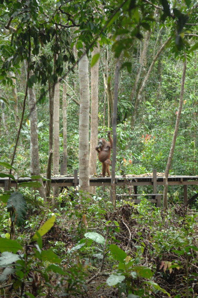 Gegen drei Uhr erreichen wir das erste der drei Camps. Nach einem kurzen viertelstündigen Fußmarsch durch den Urwald kommen wir zu einer Fütterungsplattform. Eine Orang-Utan-Familie mit Kind macht sich bereits über die hier ausgelegten Bananen her. Erste Regentropfen kündigen die nächste Dschungelattraktion an: Sekunden später rauscht urplötzlich heftiger Regen über uns herab. Eine Regenwalddusche, bei der es kein Entkommen gibt. Schnell noch ein paar Fotos und dann treten wir den Rückzug an.