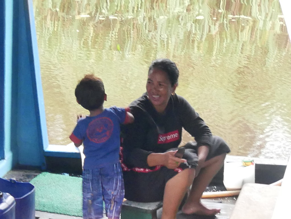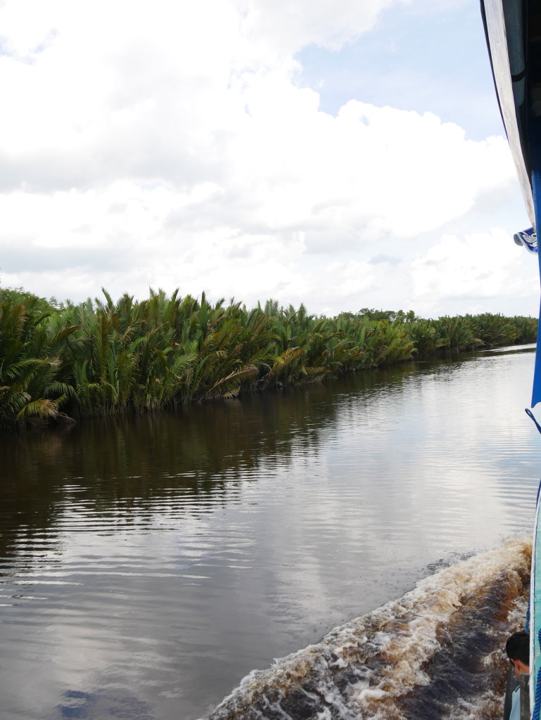 Es ist Freitag und der Markt über Mittag geschlossen. Die Abfahrt des Klotok verzögert sich ein wenig, da die Köchin Botet noch Nachschub besorgen muss. Als dann noch ein zusätzlicher „Assistent“ auftaucht, ist die vierköpfige Besatzung komplett. Wir sind die einzigen Passagiere an Bord. Unser Guide Zaky erzählt uns bei einem kleinen Snack, dass er vorher als „Bad Guy“ bei einer örtlichen Abholzungsfirma gearbeitet habe. Damals war er für die optische Aufforstung eines schmalen Uferstreifens zuständig, der den Touristen Urwald vorgaukeln und die dahinterliegenden weiten Palmölplantagen verstecken soll.