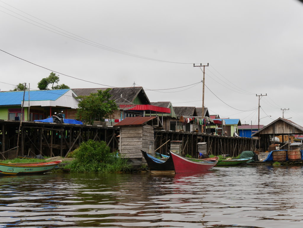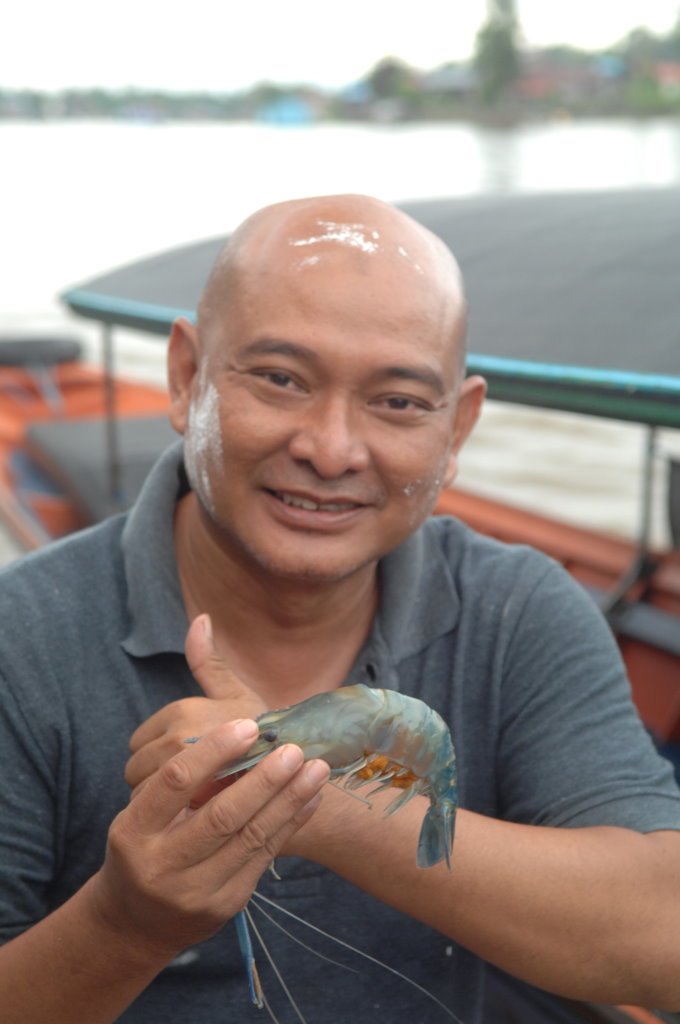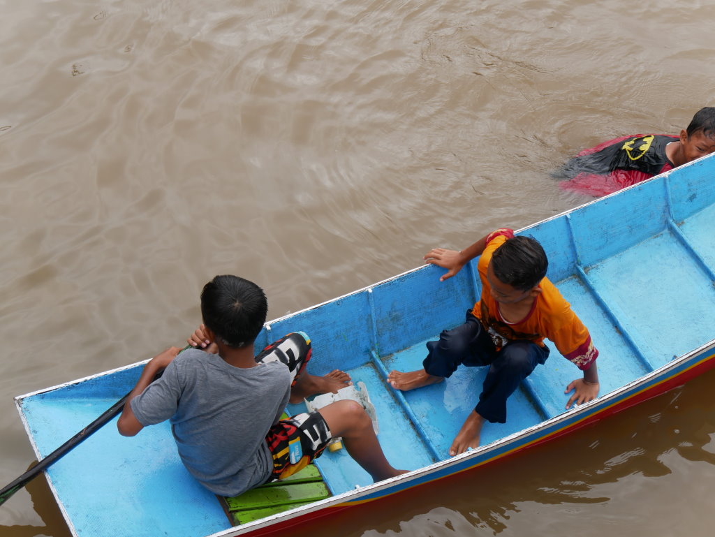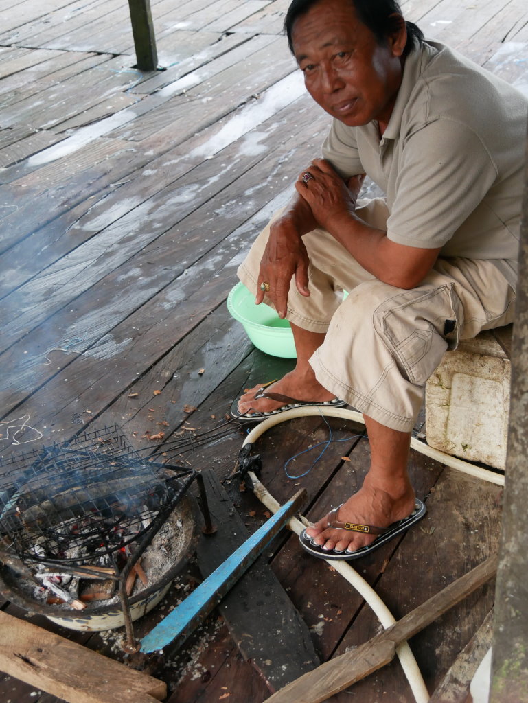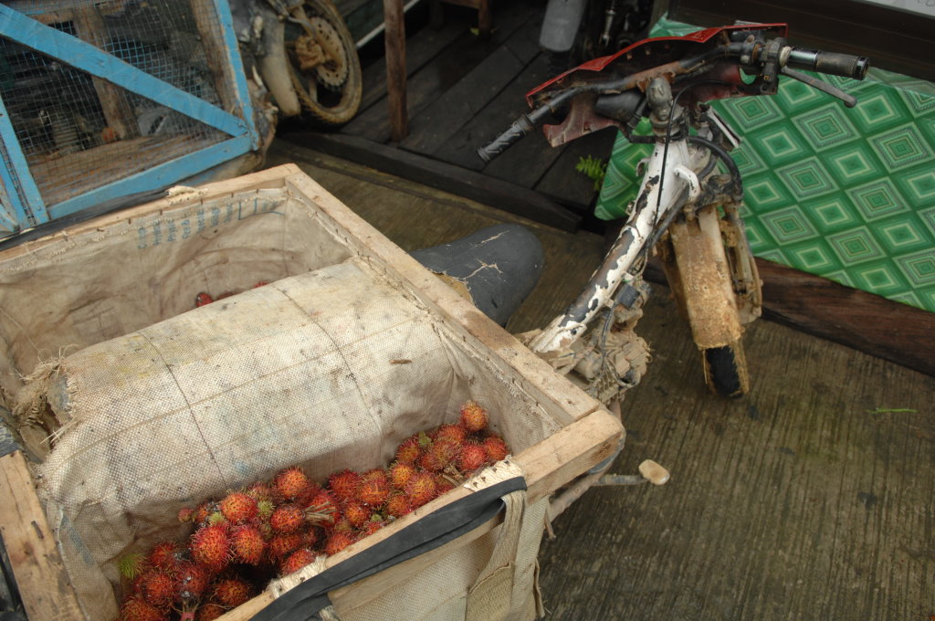Bevor es wieder mit Odins Boot zum Ausgangspunkt unserer heutigen Tour in Muara Muntai geht, wartet in einem Warung am Pier unser Mittagessen: frischer, frittierter Fisch sowie Mangos und Ananas. Überflüssig zu erwähnen, dass wir auf dem Rückweg wieder bei einem Fischhändler anhalten müssen. Dieses Mal ersteht Sarkani einige Flusskrabben für das Abendessen.