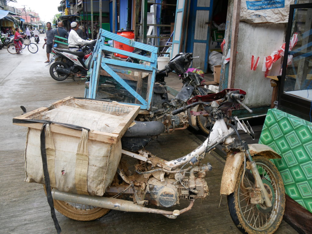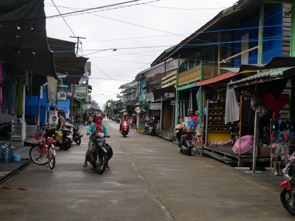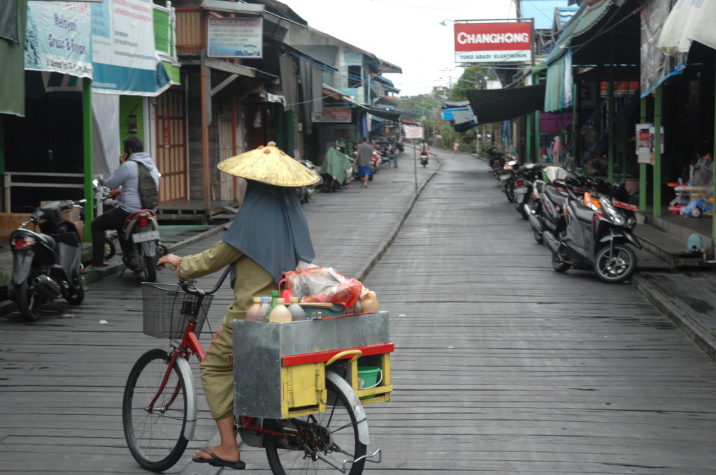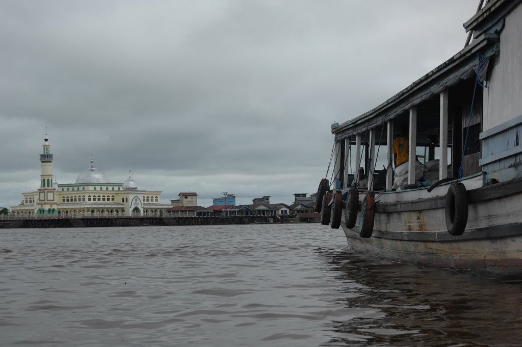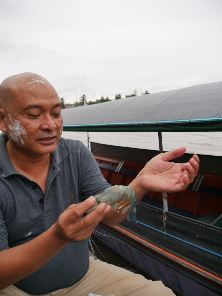 Bevor es wieder mit Odins Boot zum Ausgangspunkt unserer heutigen Tour in Muara Muntai geht, wartet in einem Warung am Pier unser Mittagessen: frischer, frittierter Fisch sowie Mangos und Ananas. Überflüssig zu erwähnen, dass wir auf dem Rückweg wieder bei einem Fischhändler anhalten müssen. Dieses Mal ersteht Sarkani einige Flusskrabben für das Abendessen.