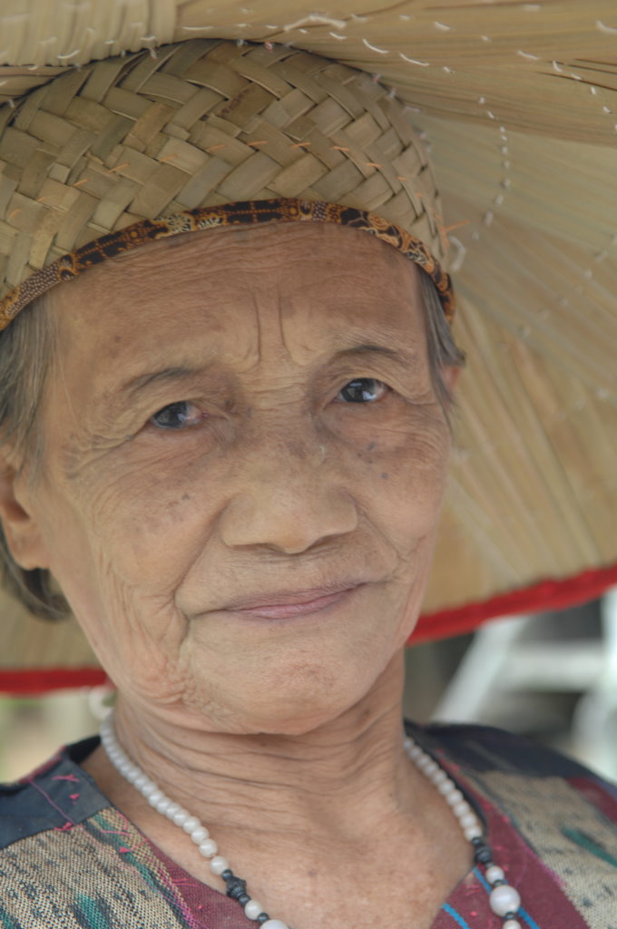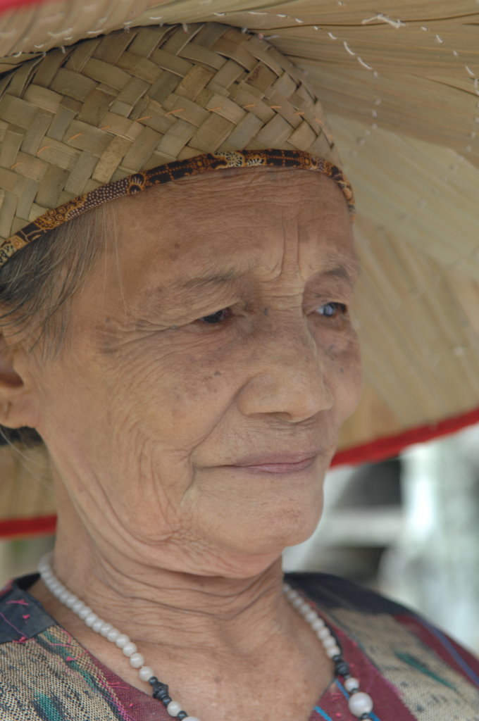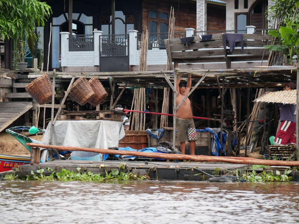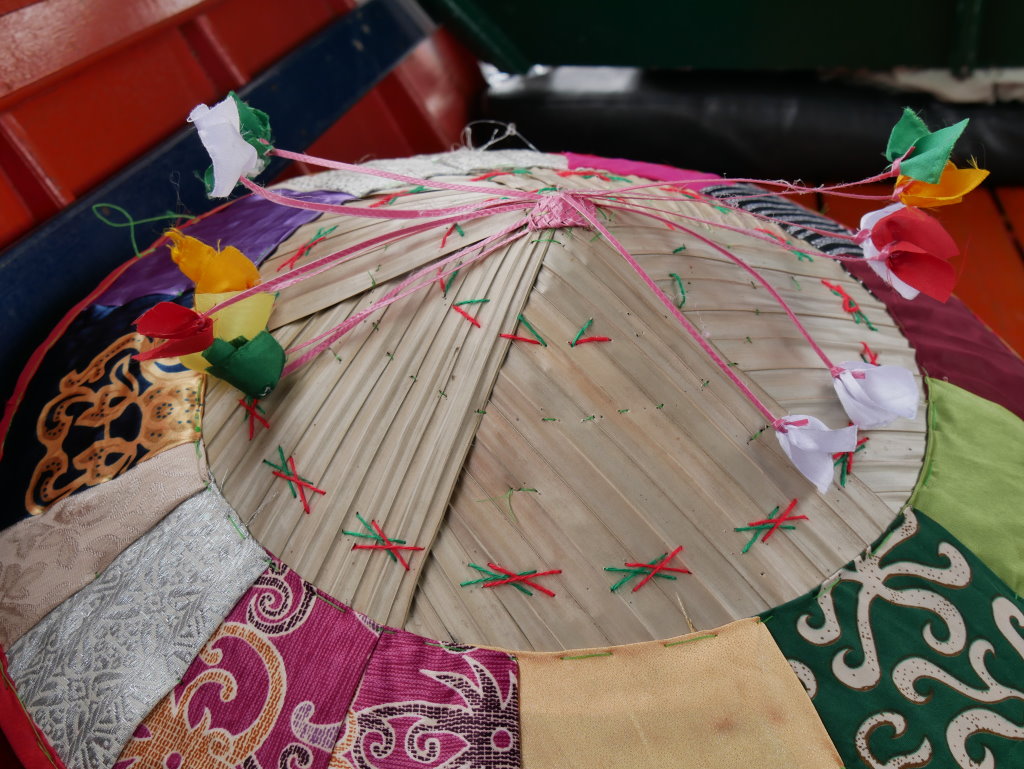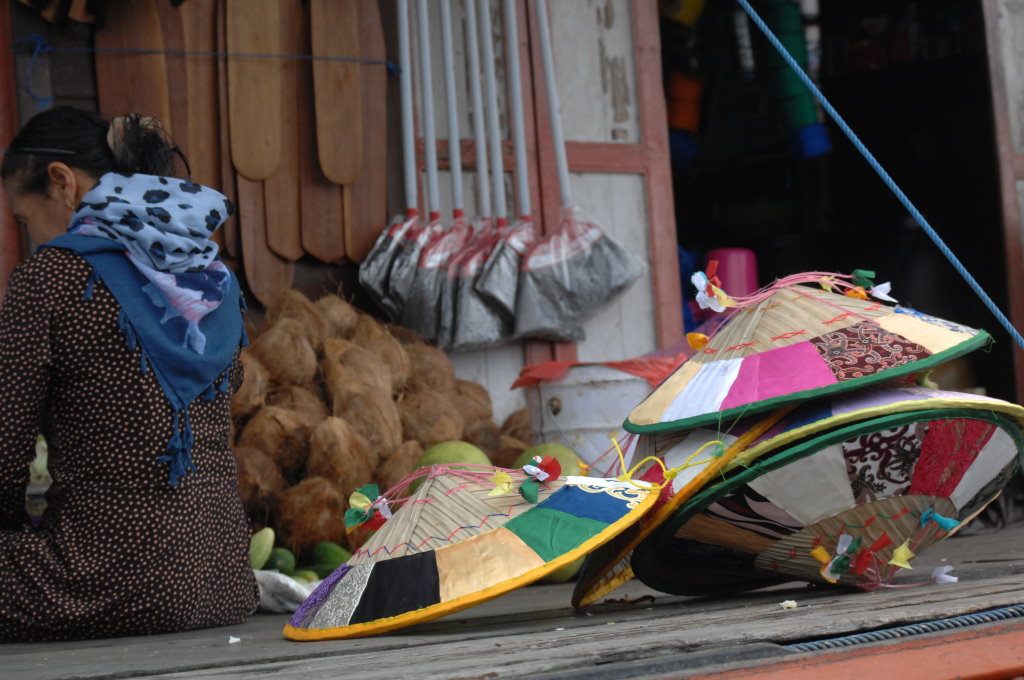 Etwas Besonderes sind die Kopfbedeckungen der Flussbewohner. Die Form erinnert an die der Reisbauern Vietnams und Chinas. Hier sind die Hüte ebenfalls aus Bambus gefertigt und zusätzlich mit bunten Stoffresten und kleinen langstieligen Stoffblumen verschönert. So ein Hut muss her. Ein kleiner schwimmender Laden im Dorf vor der Einfahrt in den nächsten Binnensee schafft Abhilfe.