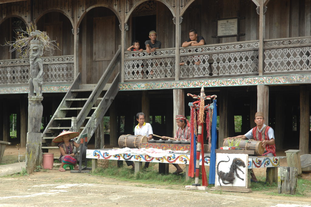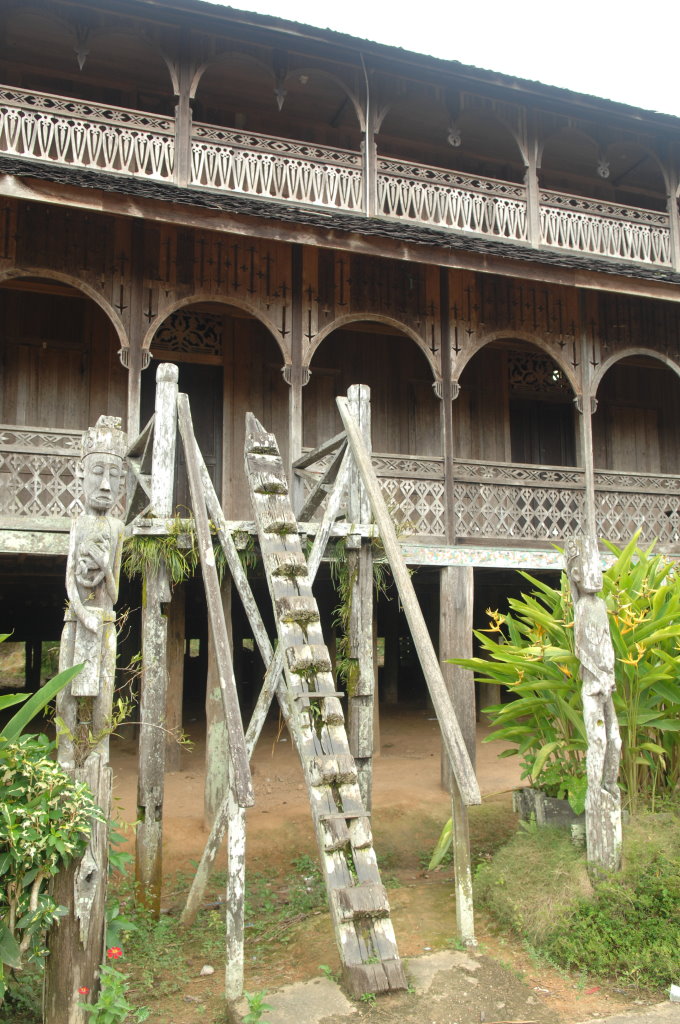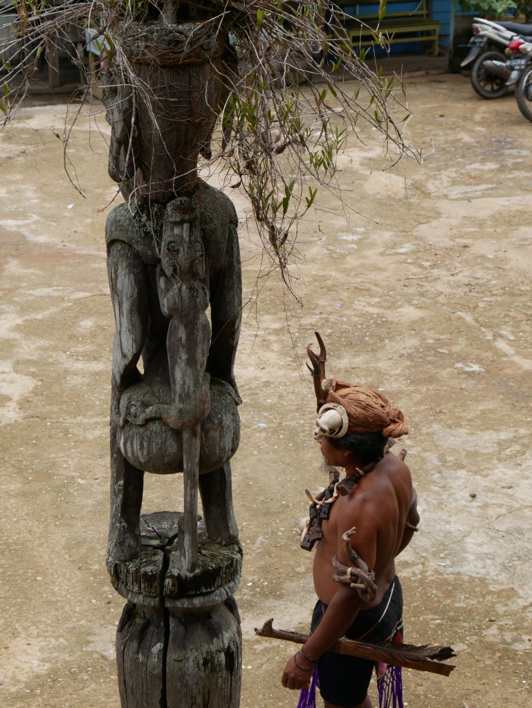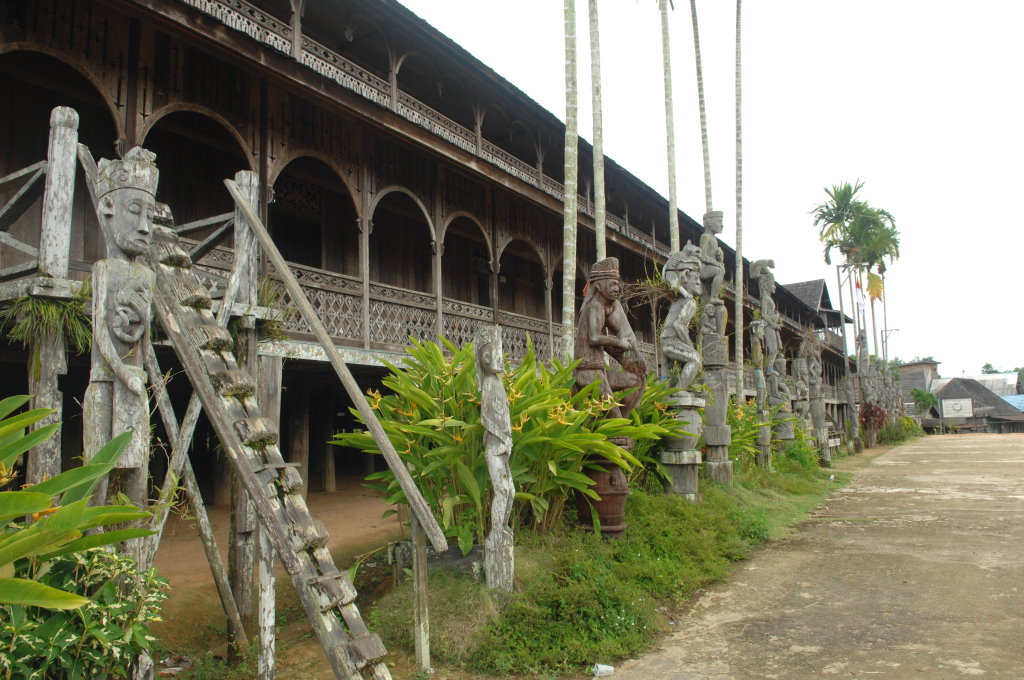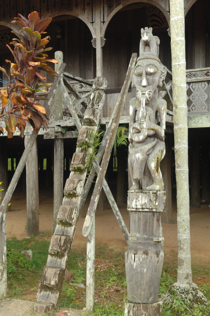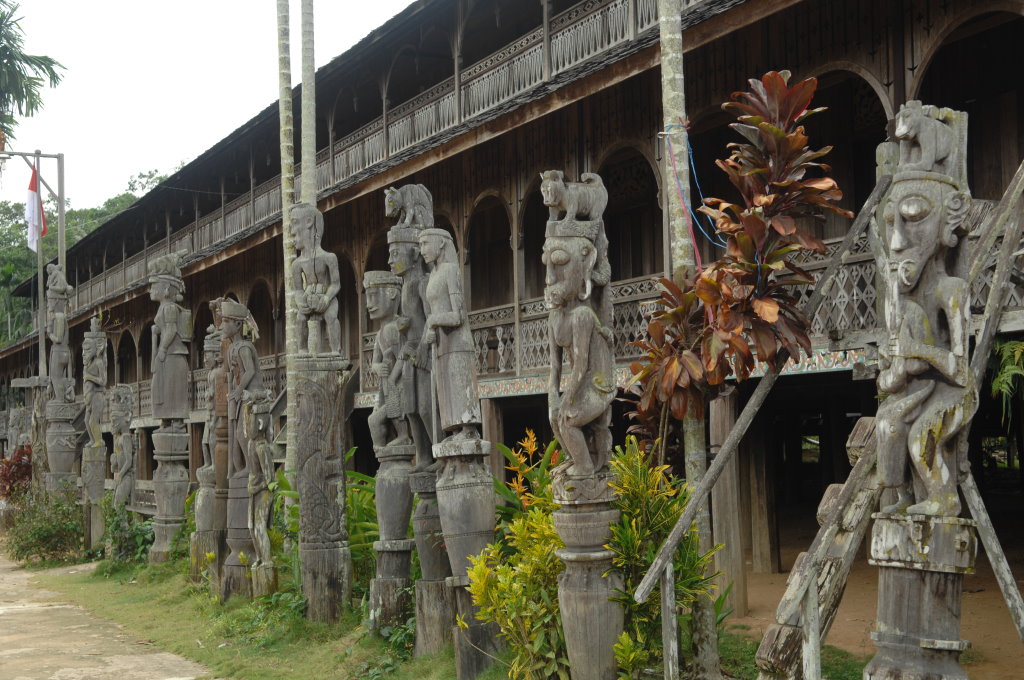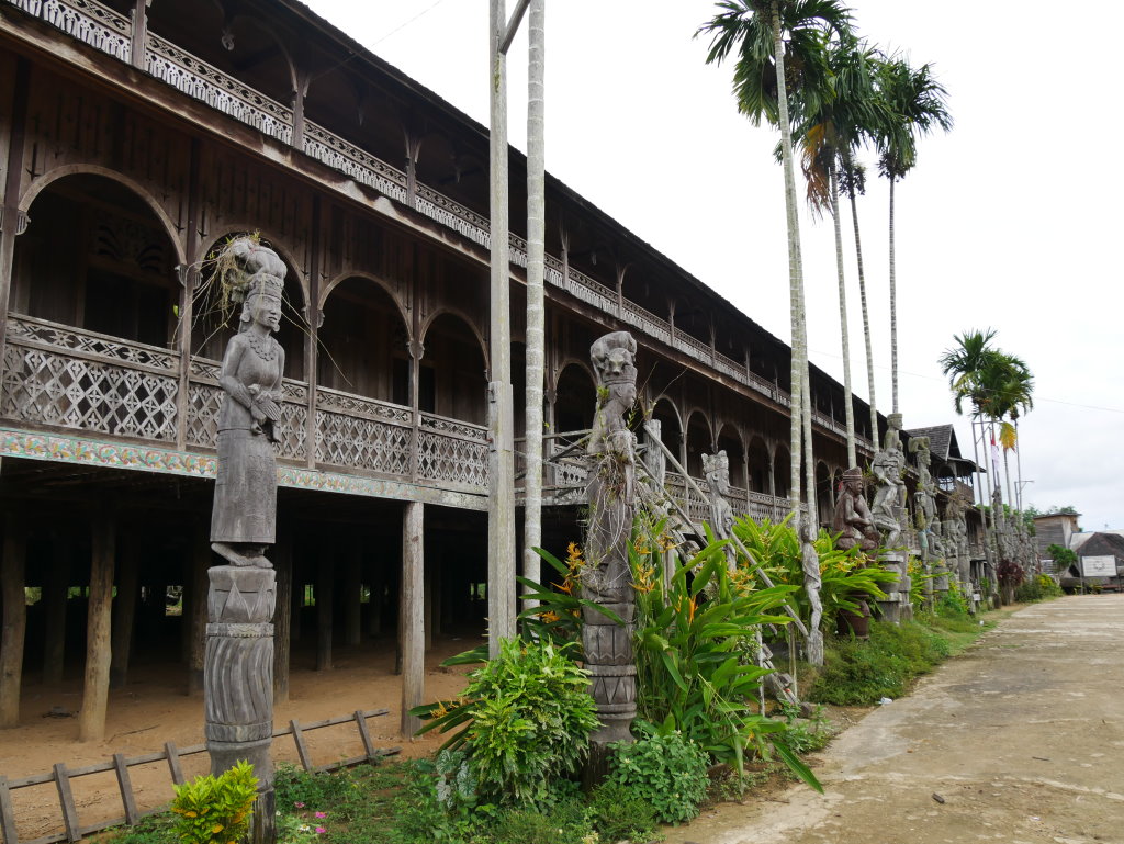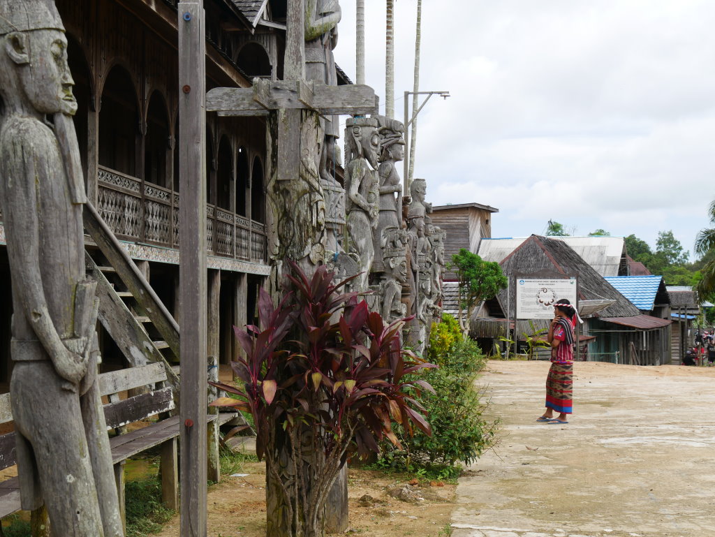 Auf der anderen Seeseite gehen wir in Tanjung Isuy an Land. Dort wartet ein Fahrer mit seinem SUV, um uns in ein nahegelegenes Dorf der Benuac-Dayak zu bringen. In Mancong überrascht nicht nur das außergewöhnliche Langhaus. Der zweistöckige Holzbau mit den zahlreichen geschnitzten Skulpturen davor wurde bereits in den 1930er Jahren erbaut und 1987 umfassend restauriert. Zwar wohnen die Familien heute nicht mehr darin, die nutzen den Bau jedoch immer noch für ihre Feiern.