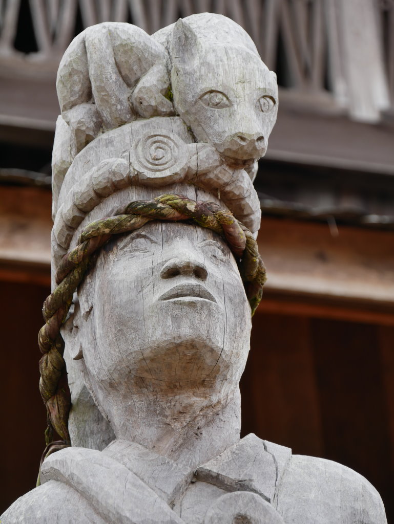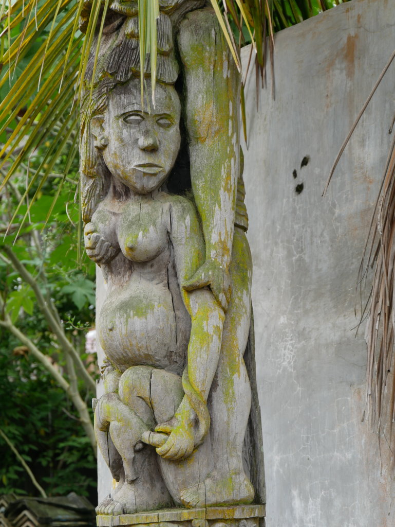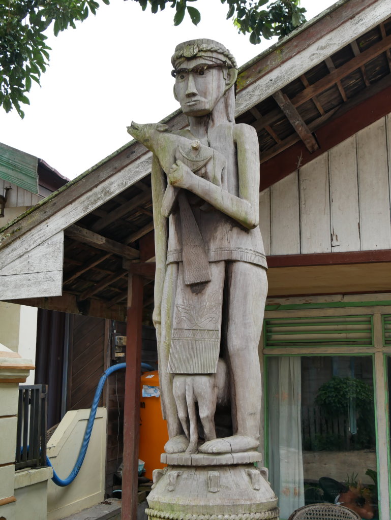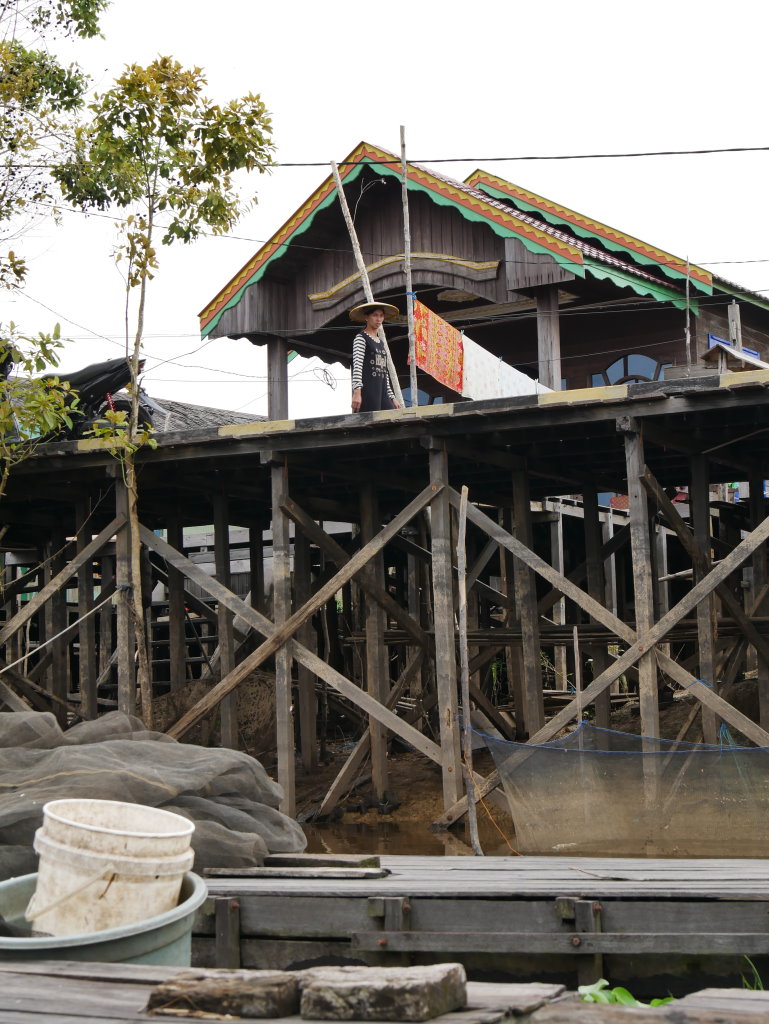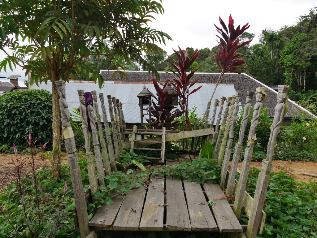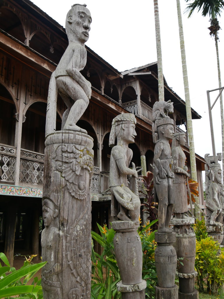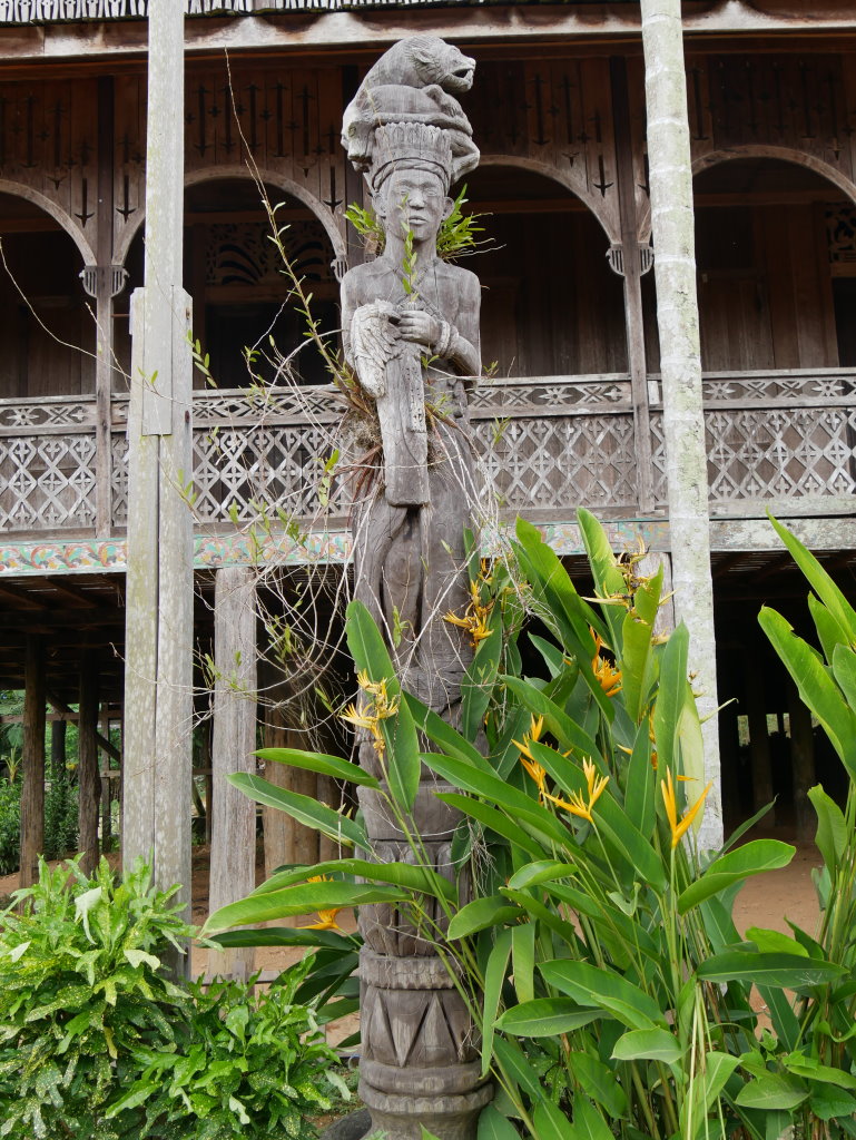 Auf der anderen Seeseite gehen wir in Tanjung Isuy an Land. Dort wartet ein Fahrer mit seinem SUV, um uns in ein nahegelegenes Dorf der Benuac-Dayak zu bringen. In Mancong überrascht nicht nur das außergewöhnliche Langhaus. Der zweistöckige Holzbau mit den zahlreichen geschnitzten Skulpturen davor wurde bereits in den 1930er Jahren erbaut und 1987 umfassend restauriert. Zwar wohnen die Familien heute nicht mehr darin, die nutzen den Bau jedoch immer noch für ihre Feiern.