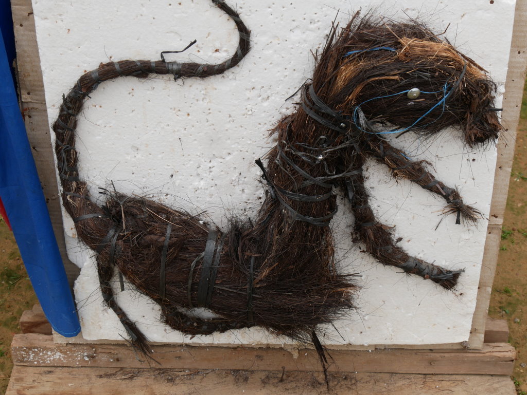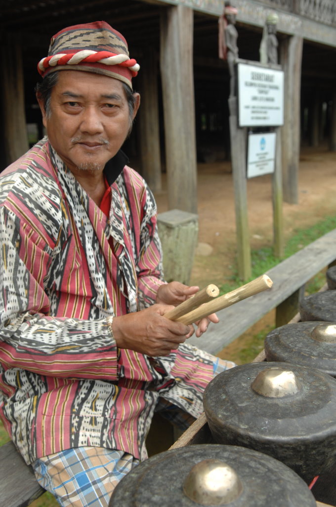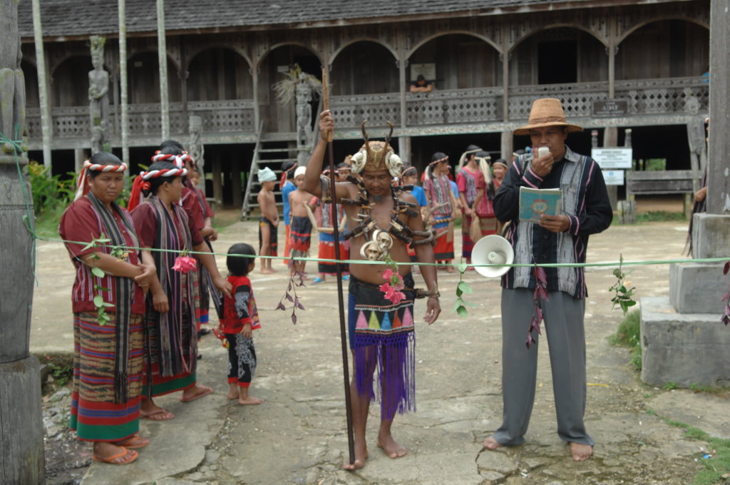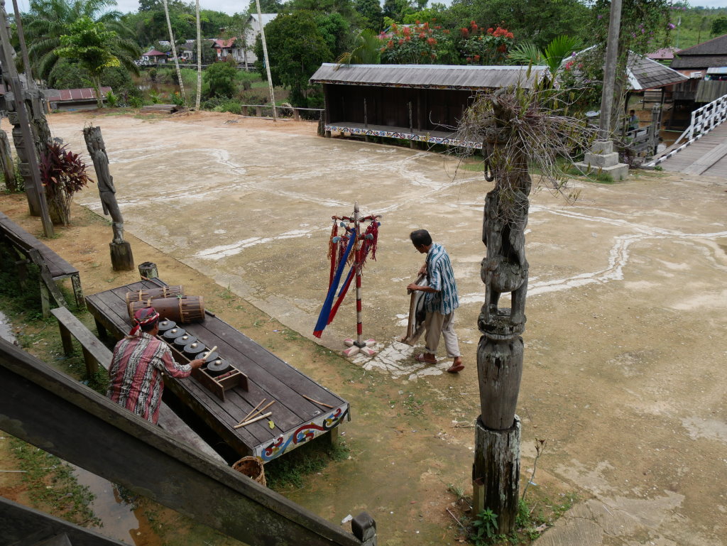 Einige der für die Zeremonien benötigten Utensilien sowie ein Gamelan und Trommeln werden nach draußen gebracht. Ein Musiker spielt sich an dem Schlaginstrument mit den Messingschalen warm. Allmählich füllt sich der Platz vor dem Langhaus. Ob jung oder alt, immer mehr Männer und Frauen, Jungen und Mädchen strömen herbei. Der Weg zum Dorf wird mit einem Band versperrt und man bedeutet uns, hinter die Absperrung zu treten. Was soll das werden?