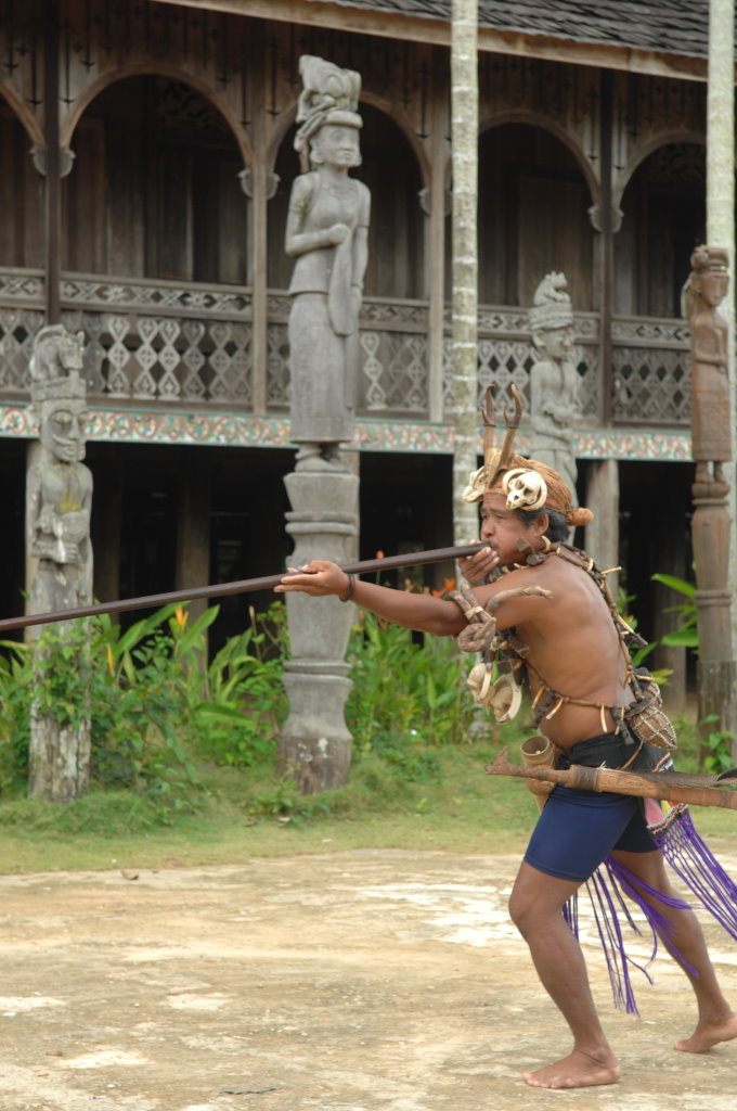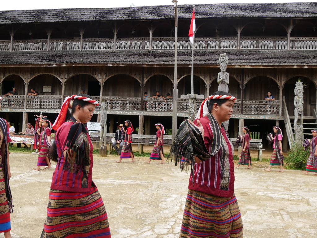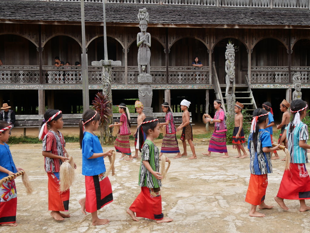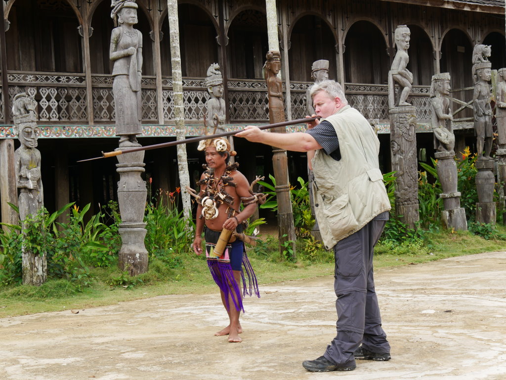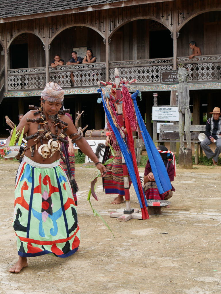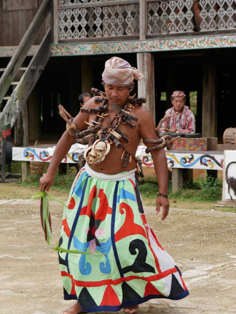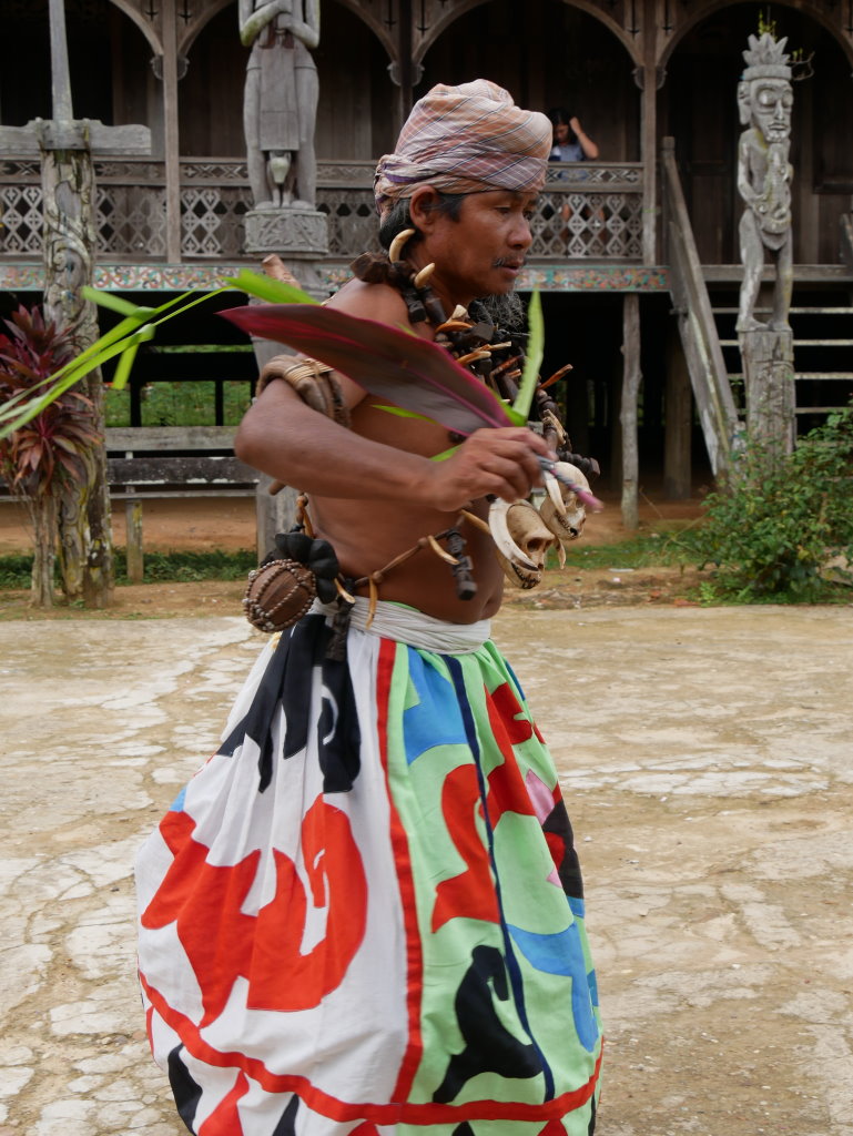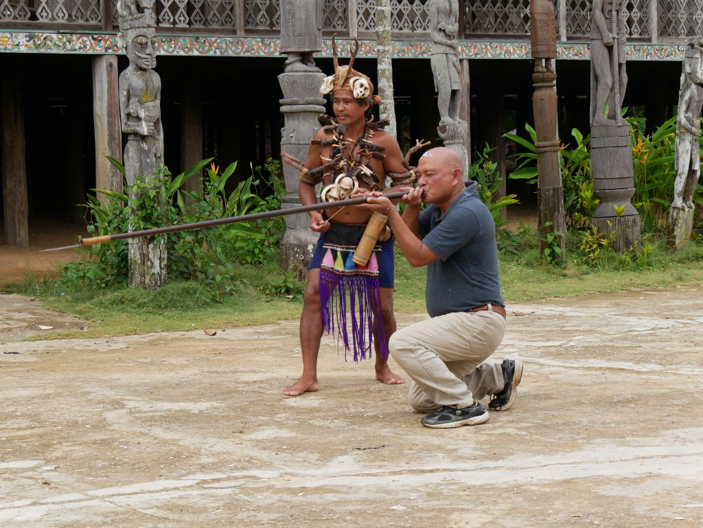 Wir erleben fünf unterschiedliche Tänze, vom eigentlichen Willkommenstanz bis zu solchen, die Die Webkunst und Reisanbau symbolisieren. Nach dem derwisch-artigen Tanz des Medizinmanns folgt ein Jagdritual. Jetzt werden auch die Gäste mit einbezogen und dürfen ihr Glück mit dem Blasrohr versuchen.