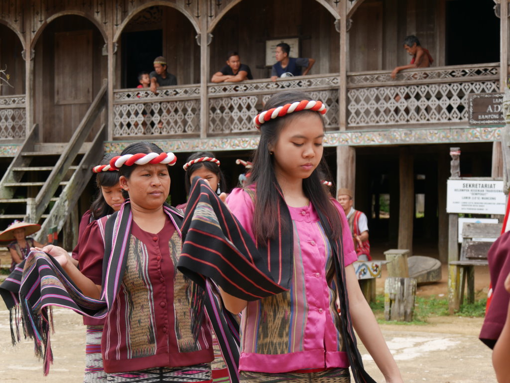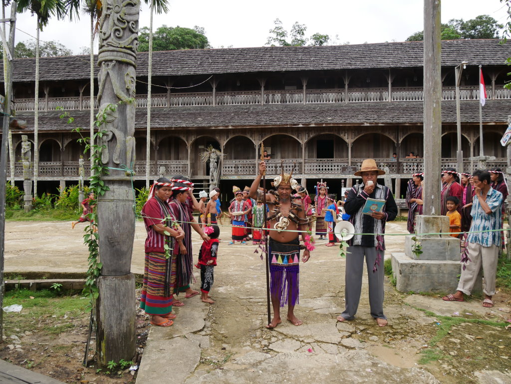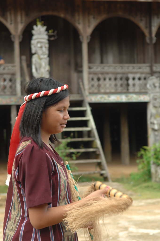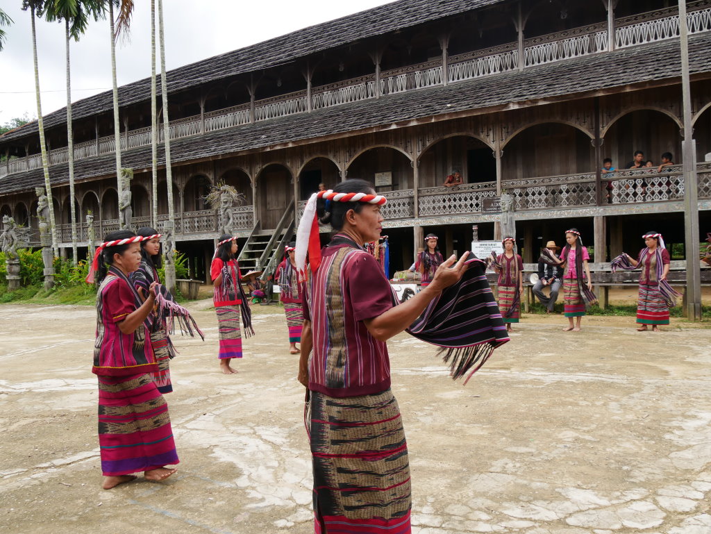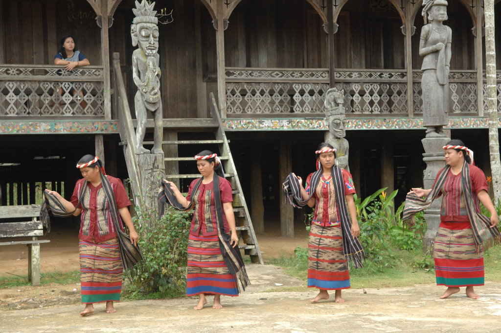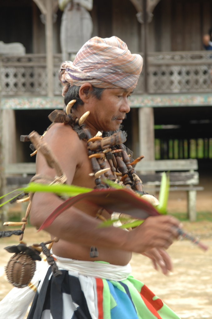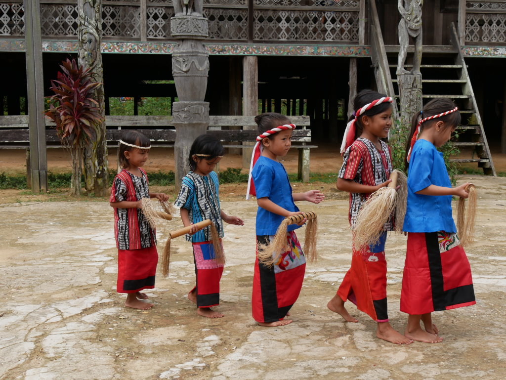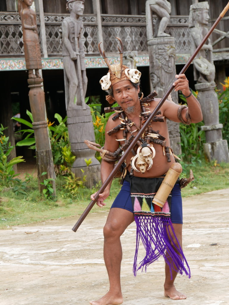 Wir erleben fünf unterschiedliche Tänze, vom eigentlichen Willkommenstanz bis zu solchen, die Die Webkunst und Reisanbau symbolisieren. Nach dem derwisch-artigen Tanz des Medizinmanns folgt ein Jagdritual. Jetzt werden auch die Gäste mit einbezogen und dürfen ihr Glück mit dem Blasrohr versuchen.