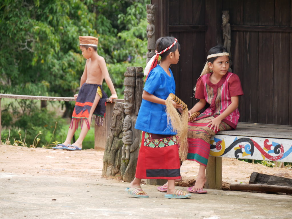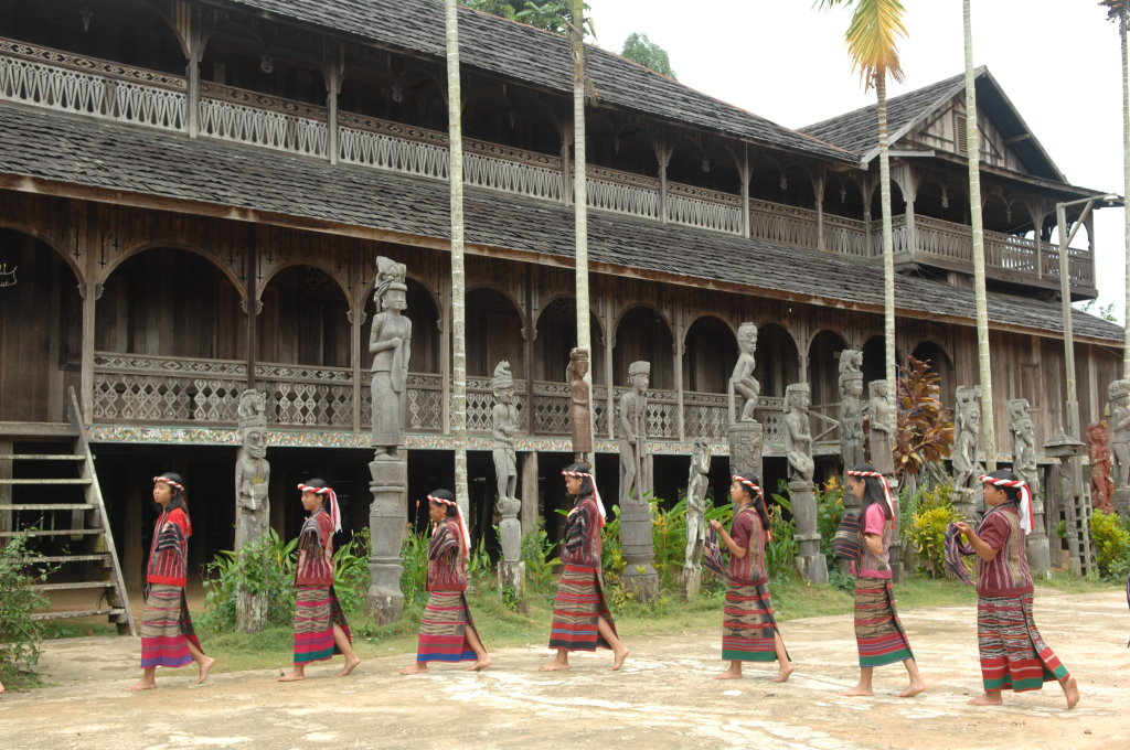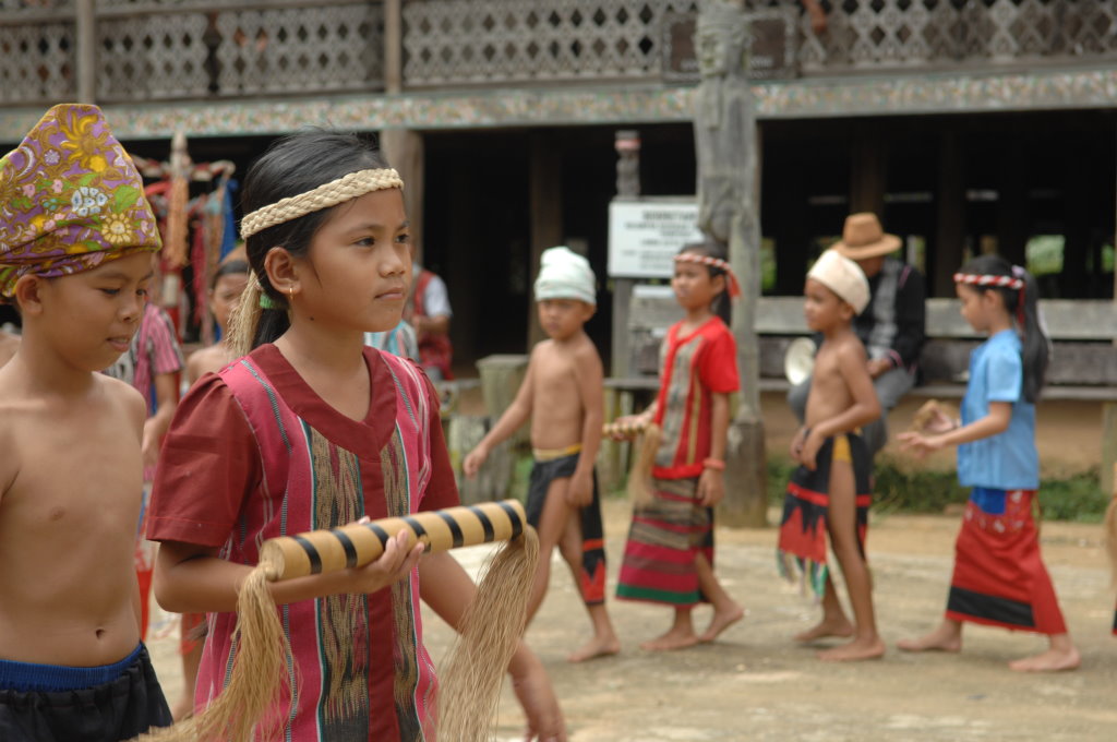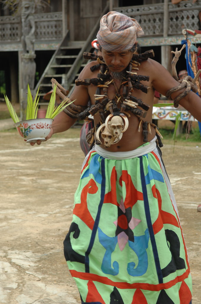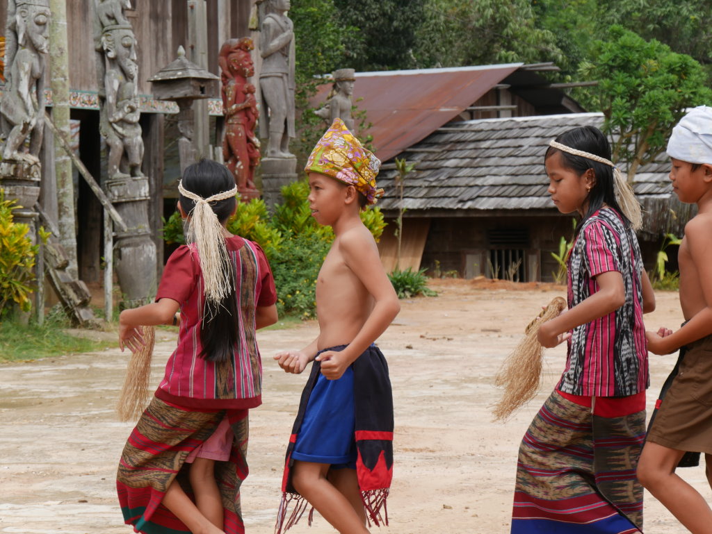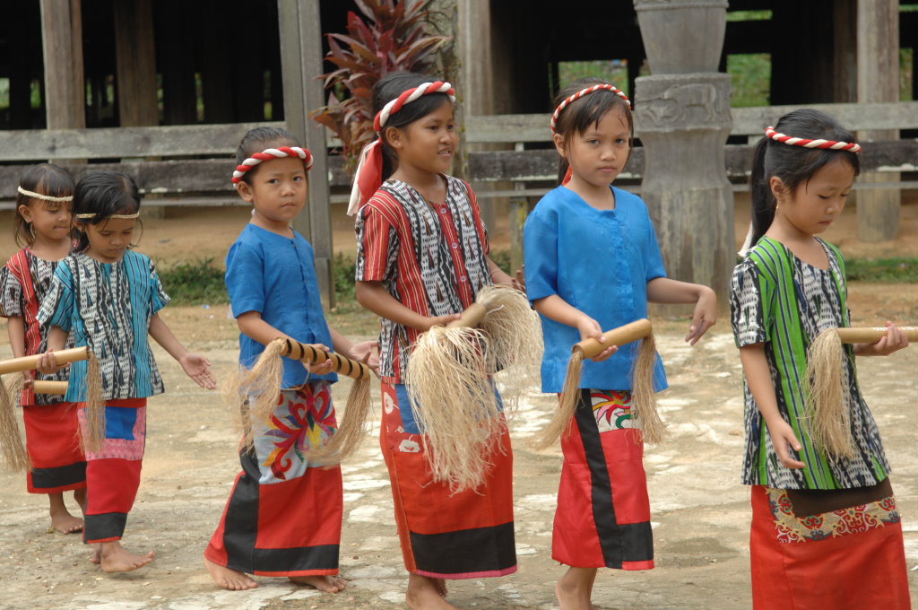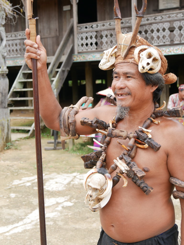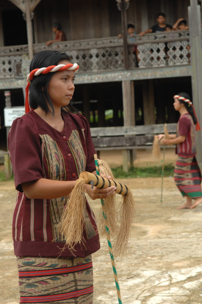Wir erleben fünf unterschiedliche Tänze, vom eigentlichen Willkommenstanz bis zu solchen, die Die Webkunst und Reisanbau symbolisieren. Nach dem derwisch-artigen Tanz des Medizinmanns folgt ein Jagdritual. Jetzt werden auch die Gäste mit einbezogen und dürfen ihr Glück mit dem Blasrohr versuchen.