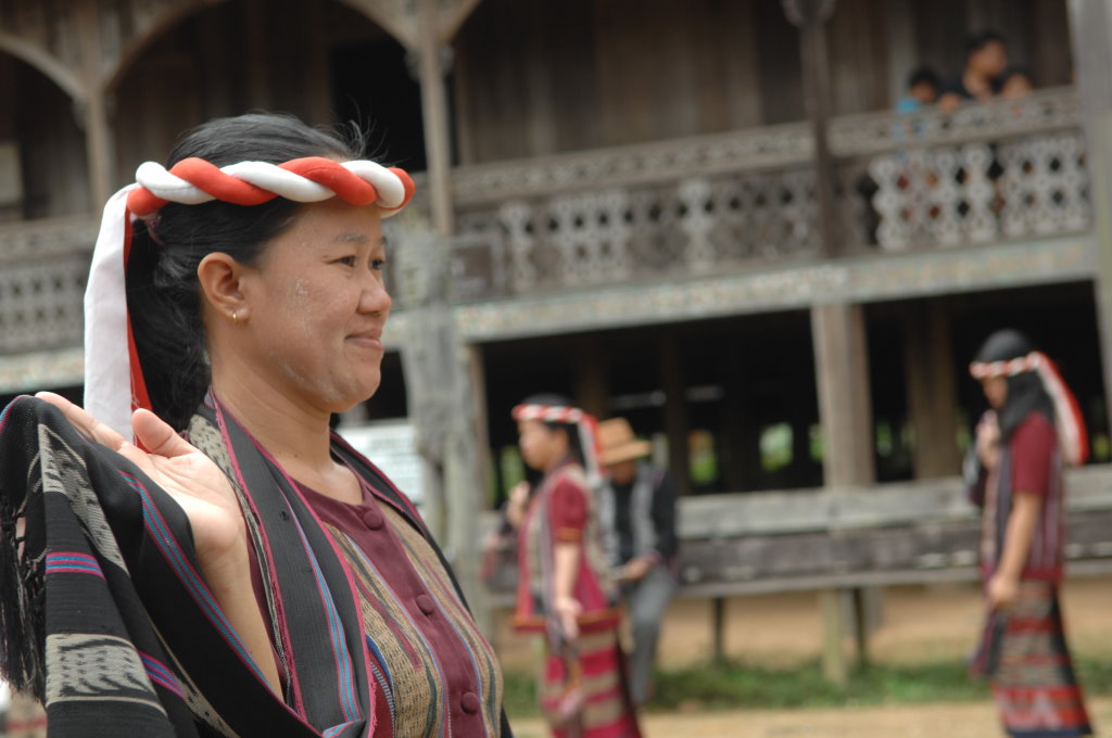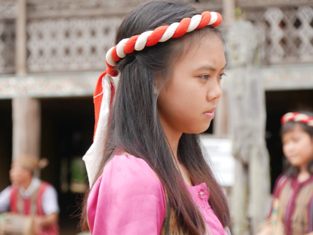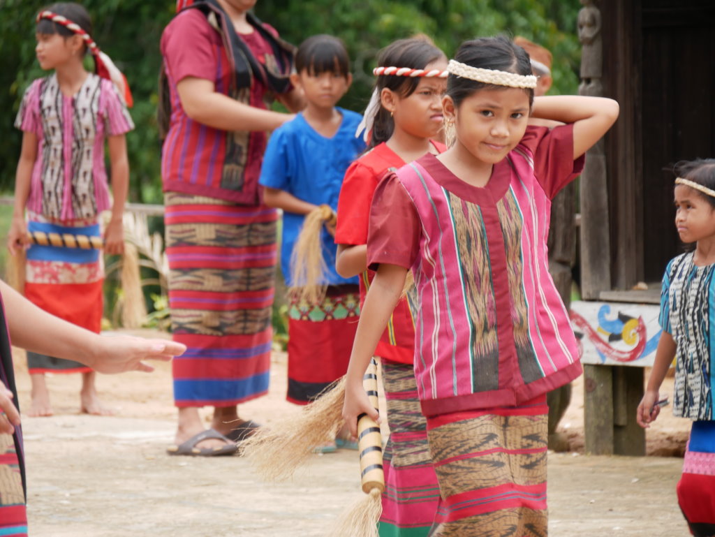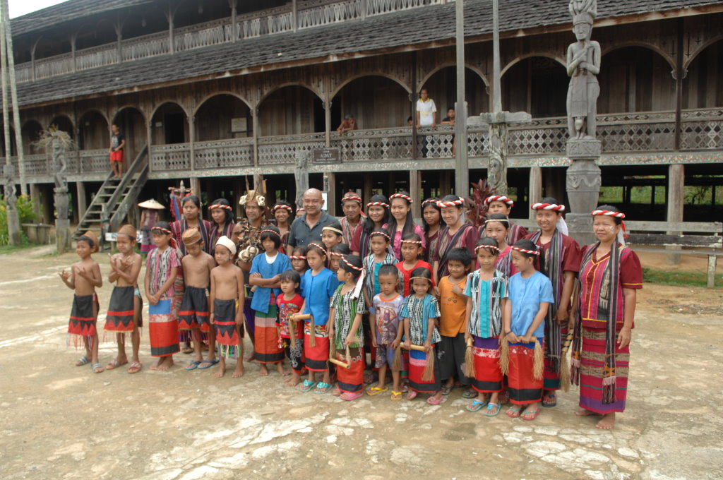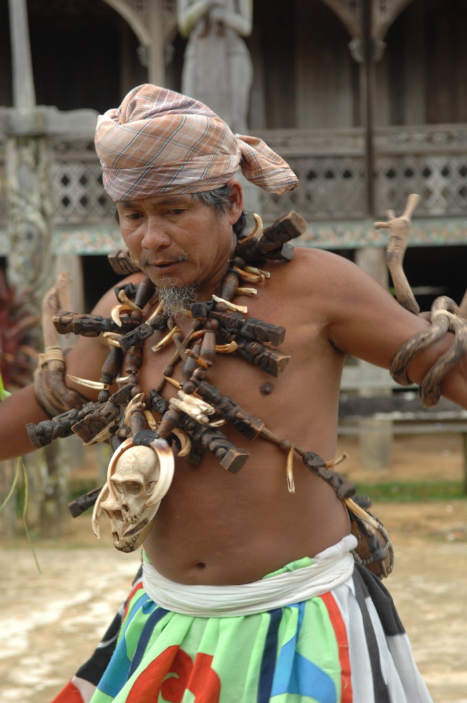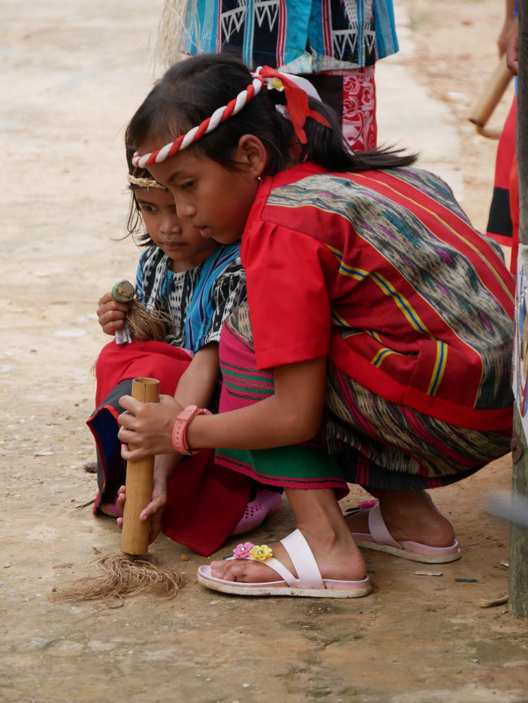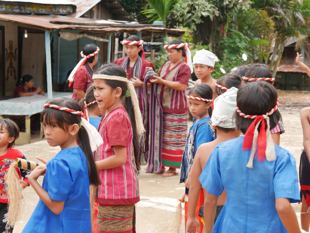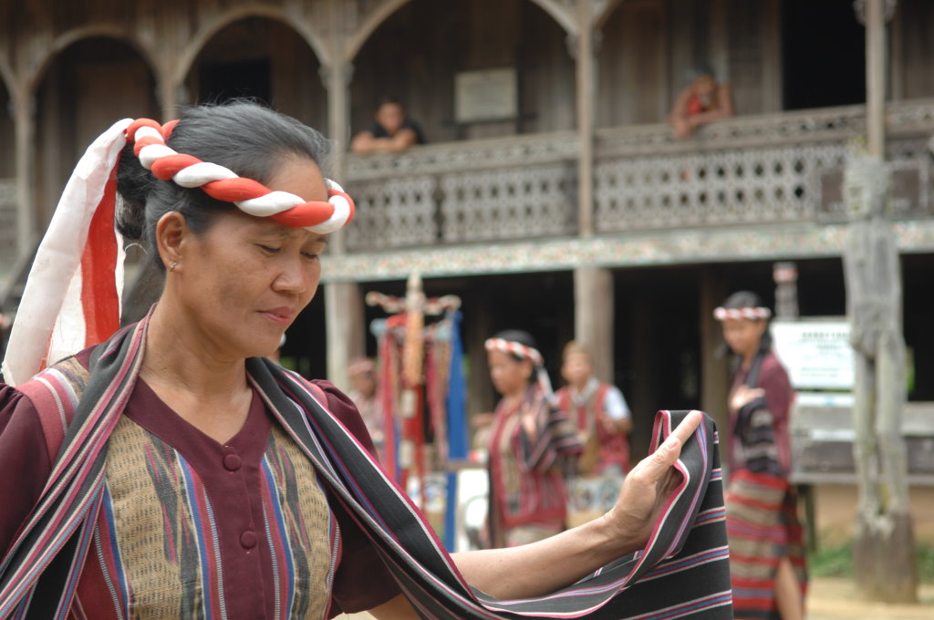 Wir erleben fünf unterschiedliche Tänze, vom eigentlichen Willkommenstanz bis zu solchen, die Die Webkunst und Reisanbau symbolisieren. Nach dem derwisch-artigen Tanz des Medizinmanns folgt ein Jagdritual. Jetzt werden auch die Gäste mit einbezogen und dürfen ihr Glück mit dem Blasrohr versuchen.