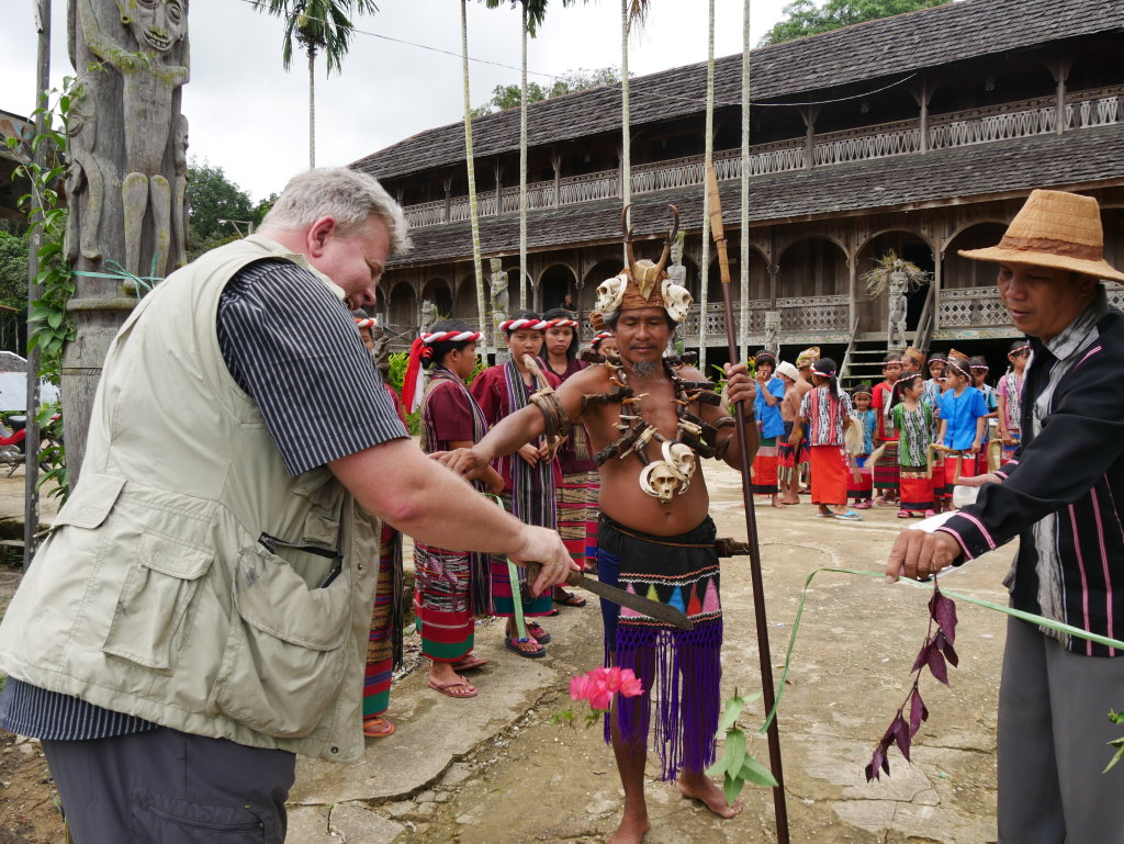 Der Schamane des Dorfes tritt an die andere Seite des Seiles, begleitet von einem Mann mit Megafon, der als Übersetzer ins Indonesische fungiert. Sarkani übersetzt ins Englische: Bevor wir das, durch das Langhaus definierte Zentrum des Dorfes betreten dürfen, müssen wir unsere Absicht erklären. „apa kabar?“ Bringt ihr Gute oder schlechte Nachrichten? Natürlich haben wir nur Gutes im Gepäck. Jetzt sind wir im Dorf willkommen und dürfen Teil der Gemeinschaft werden. Der Medizinmann reicht mir eine Machete, um das Seil zu durchtrennen. Unter dem rhythmischen Klang der Gamelan und Trommeln nehmen uns die Dorfbewohner an die Hand und führen uns wiegenden Schrittes zu einer kleinen überdachten Tribüne.