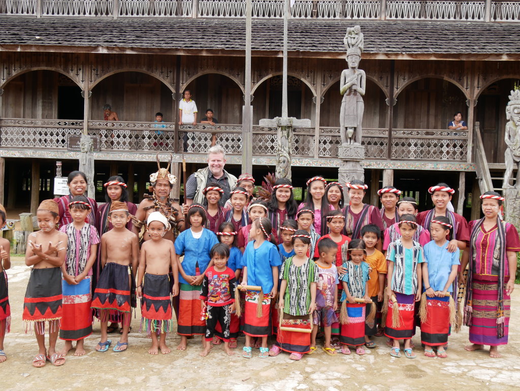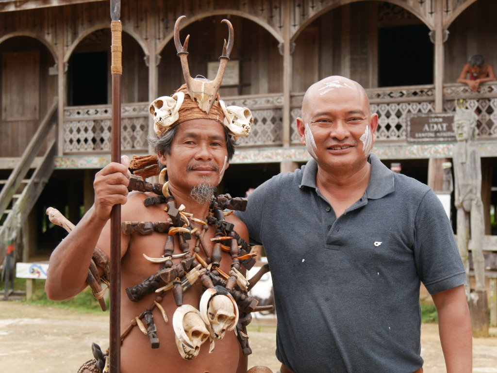 Auch wir erhalten eine Schale mit dem Reiswasser, um ebenfalls die Wangen weiterer Dorfbewohner zu weißeln. Schließlich endet die Musik und wir werden verabschiedet. Was für ein Erlebnis. Diese Überraschung ist Sarkani wirklich gelungen. Angekündigt hatte er lediglich den Besuch eines traditionellen Dayak-Dorfes.