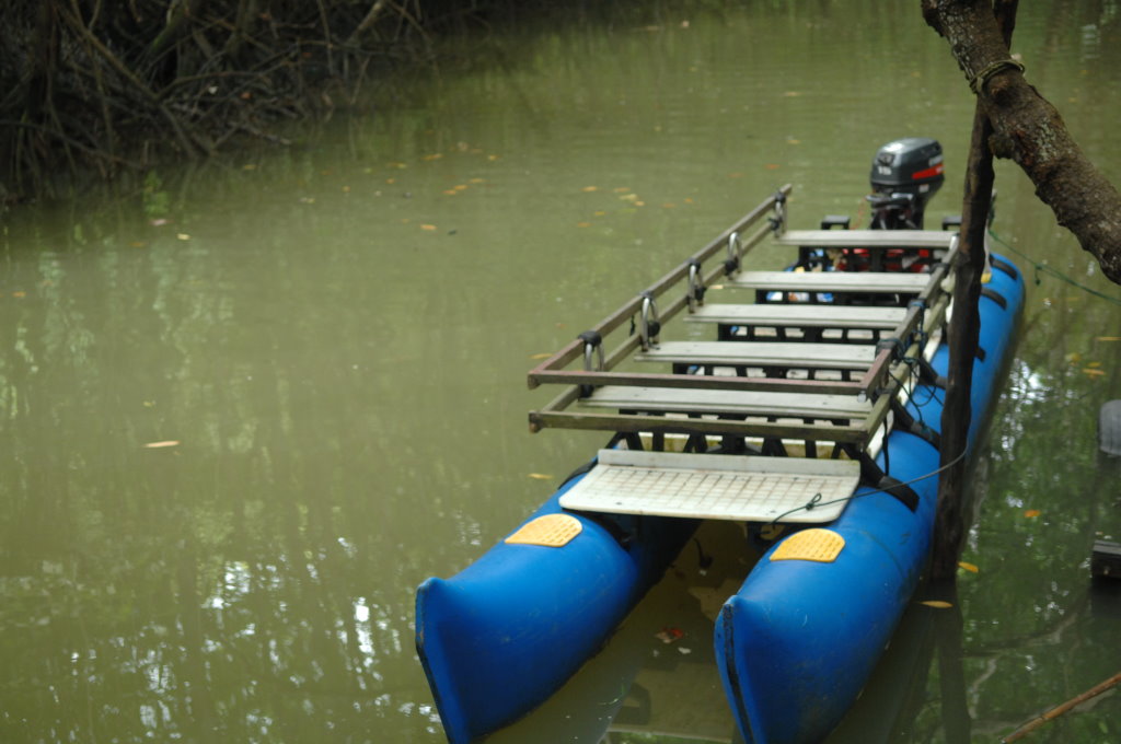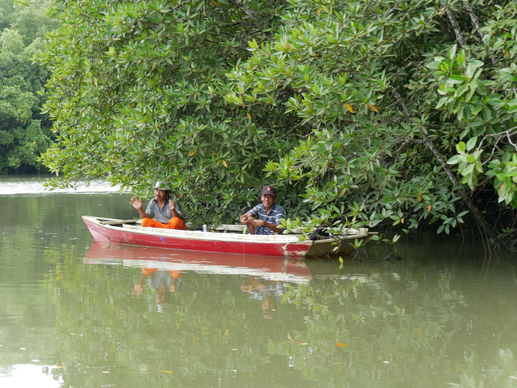 Der Lebensraum der Nasenaffen ist ebenfalls bedroht. Eines der Rückzugsgebiete befindet sich in einem Schutzgebiet vor der Stadt. Wir haben das Glück, mit einem der Ranger des Mangrove Center Graha Indah auf einem wendigen kleinen Katamaran-ähnlich gebauten Boot mit leisem Motor in die Seitenarme des überfluteten Waldes zu fahren.