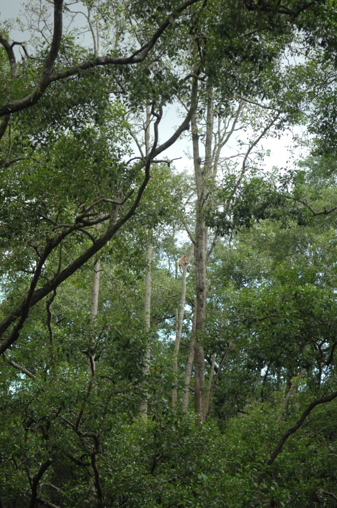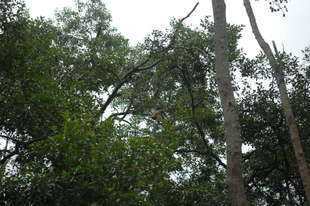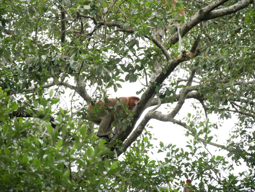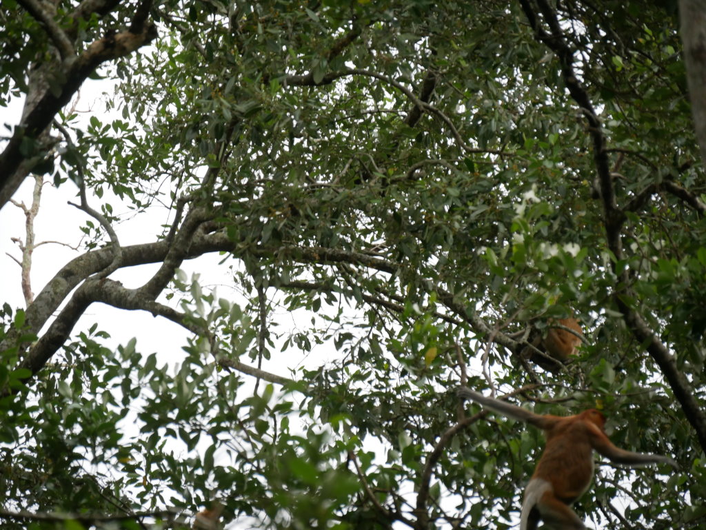 Die bei den Einheimischen Orang Belanda („Niederländer“) genannten Affen sind ziemlich scheu, wagen sich aber durchaus in die Nähe der ersten Häuser. Auch der Ruf des Muezzins stört sie nicht weiter. Nur diese merkwürdigen Menschen mit ihren orangenen Schwimmwesten sind Ihnen suspekt. Und so springt das Rudel Nasenaffen rund um uns herum durch die Bäume und hält gebührenden Abstand von uns.