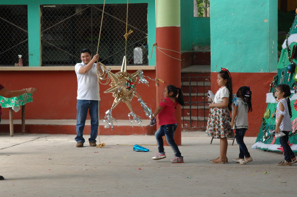 Auch eine Schule befindet sich in der Nähe. Heute ist offensichtlich der letzte Schultag vor den Weihnachtsferien. Das muss gefeiert werden: die Kinder dürfen ein mit Leckereien gefülltes Gefäß zum Bersten bringen. Brav warten sie in der Reihe, bis sie die Gelegenheit bekommen, mit einem spitzen Stein auf den stanniol-verkleideten Stern aus Pappmaché einzudreschen. Das kann dauern. Auch wenn es nicht gleich klappt, wartet eine Belohnung auf die Kleinen. Stolz marschieren sie mit einem Stück Kuchen auf dem Teller zu ihren Eltern, die bereits vor der Schule auf sie warten.