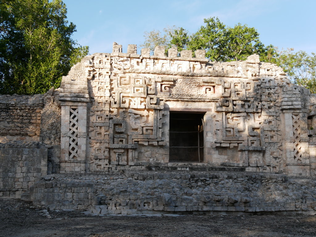 Nach all den Symbolen der christlichen Kolonialisierung besuchen wir vor Sonnenuntergang noch die Ruinen von Hochob, rund 45 Kilometer von unserem heutigen Etappenziel Hopelchen entfernt. Die Bauten sind im Chenes-Stil erbaut. Typisch für diese Bauweise der Maya-Architektur ist der große Schlangenmauleingang des Hauptgebäudes.