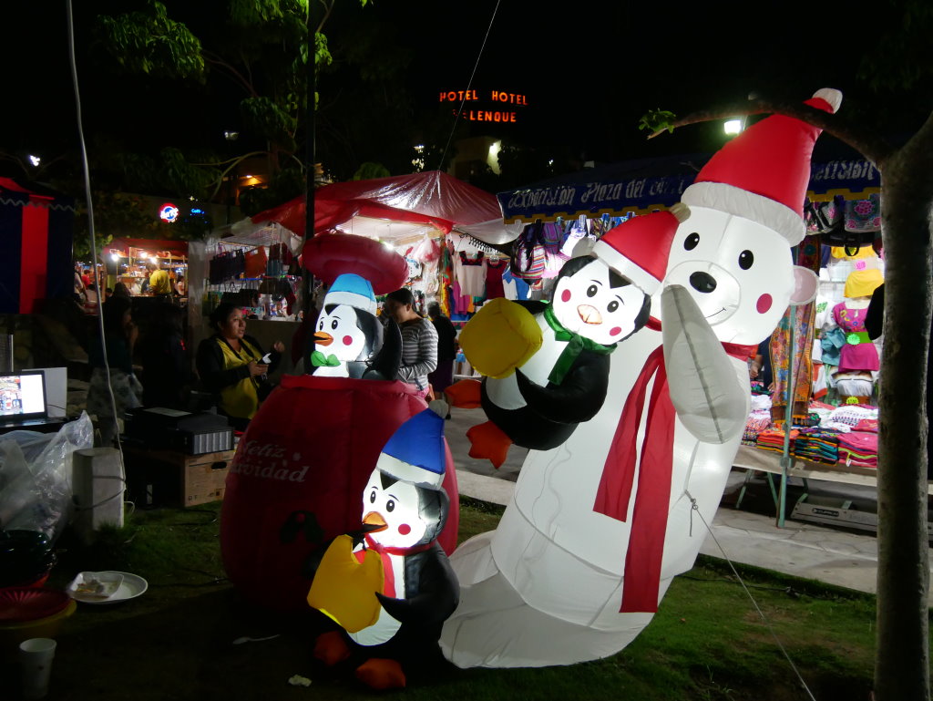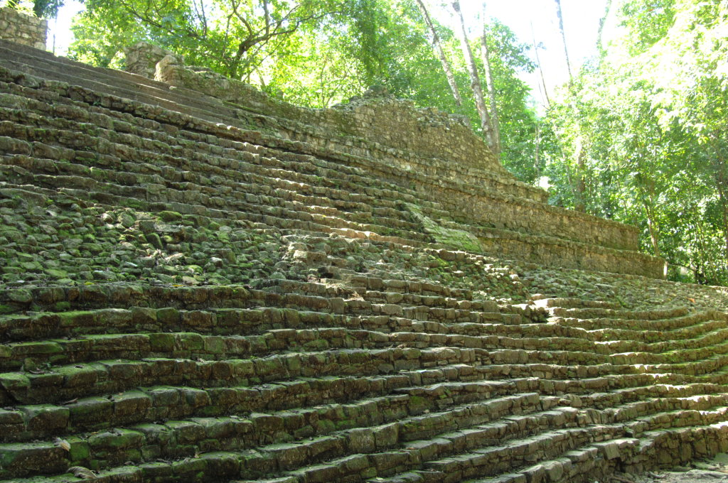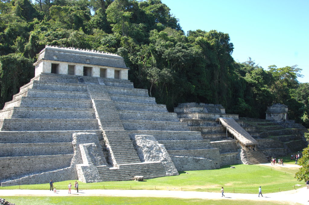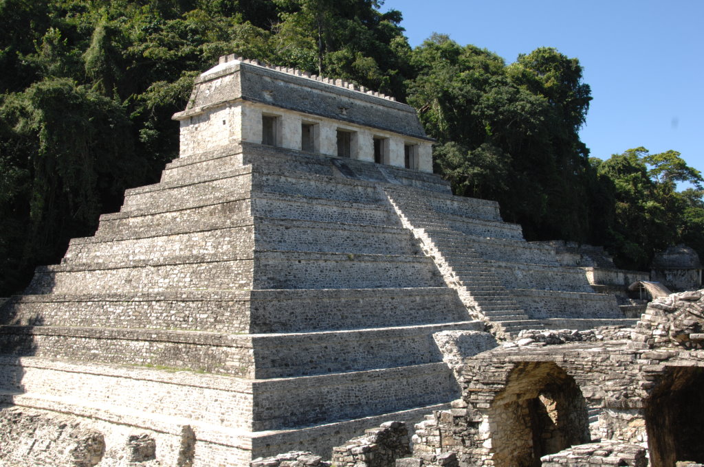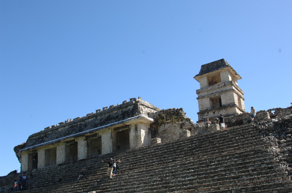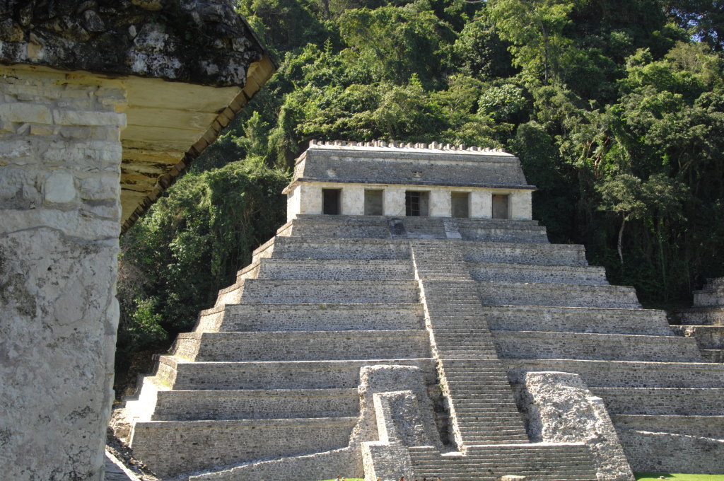 Knapp 10 Kilometer außerhalb des Städtchens Palenque befindet sich die bekannte Ausgrabungsstätte gleichen Namens. Für 20 Pesos pro Person, rund 90 Cent, bringt uns ein Sammeltaxi zum Eingang der Ruinenstadt. Von dort geht es über einige Stufen bergauf durch den Wald und schon hat man den Templo de las Inscripciones („Tempel der Inschriften“) erreicht. Bekannt ist sie vor allem für eine in seinem Inneren entdeckte Grabkammer, in der sich ein überdimensionaler Sarkophag befand. Dieser wird mittlerweile in einem kleinen Museum am anderen Ende der weitläufigen Anlage ausgestellt. Trotzdem lohnt sich der Aufstieg über die Stufen zum Eingang. Es ist eine der seltenen Gelegenheiten in eine Pyramide hineinzugelangen.