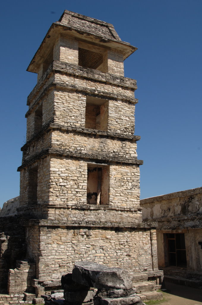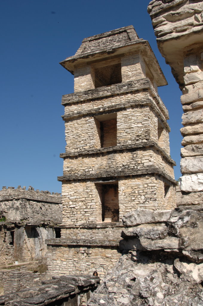 Der größte architektonische Komplex befindet sich gleich gegenüber. El Palacio („der Palast“) ist auf einer Grundfläche von 80 mal 100 Metern gebaut. Über drei mal neun Stufen gelangt man auf die obere Plattform mit mehreren Gebäuden. Von manchen stehen nur noch die Grundmauern und Teile der Außenmauern. Der weithin sichtbare vierstöckige Turm ist noch vollständig erhalten bzw. restauriert worden. Er diente den Maya vermutlich als Wachturm oder Observatorium. Bemerkenswert sind auch die Reliefs und Hieroglyphen im sogenannten Hof der Gefangenen, die sorgfältig freigelegt wurden.