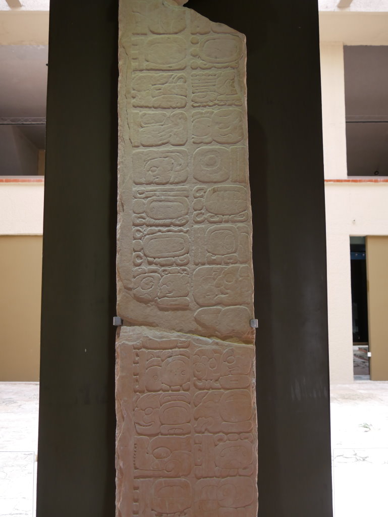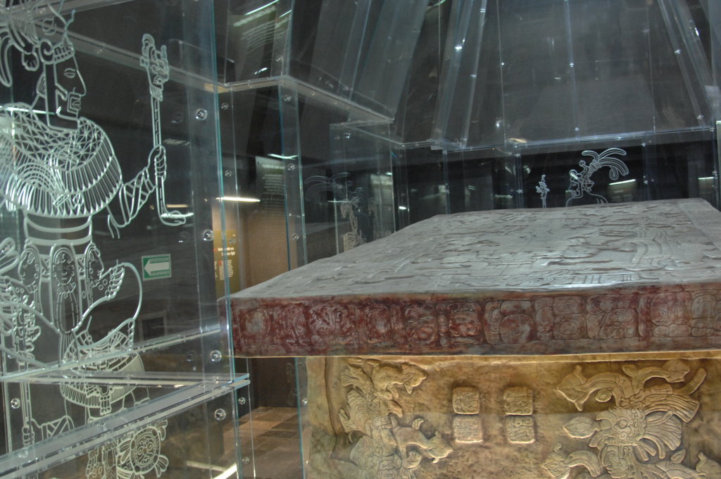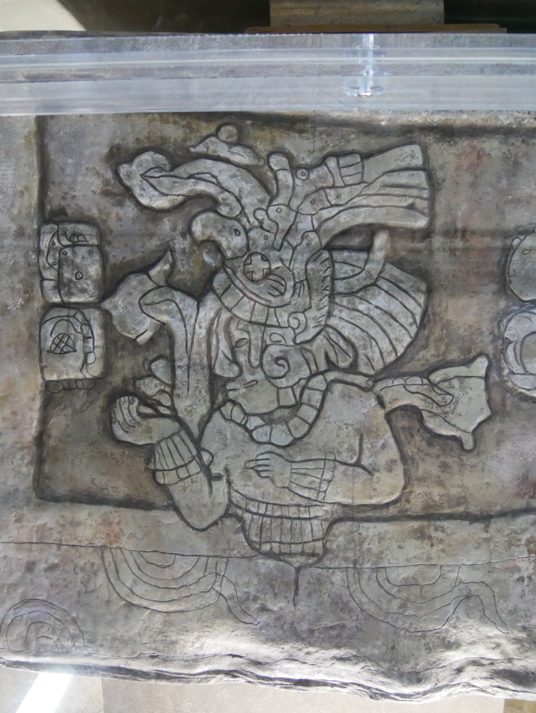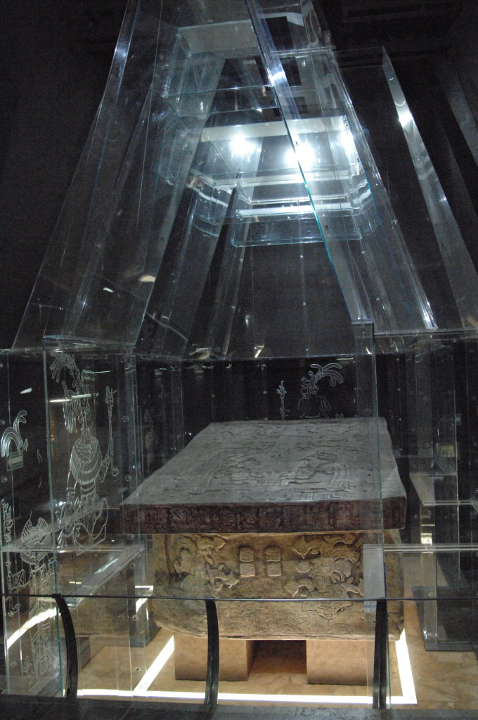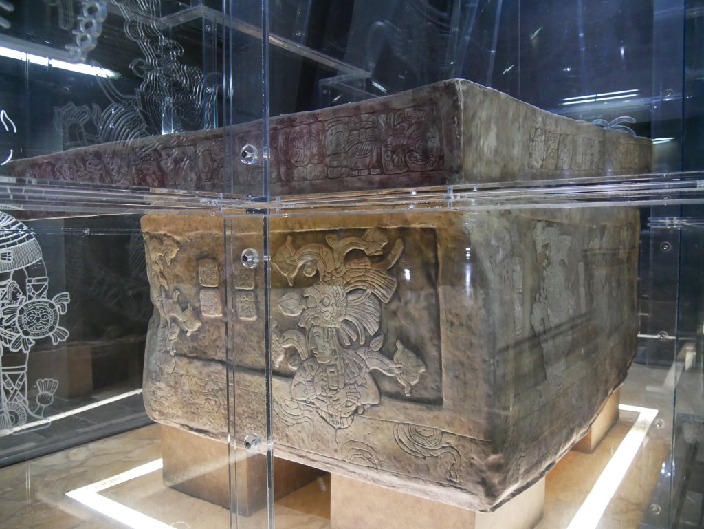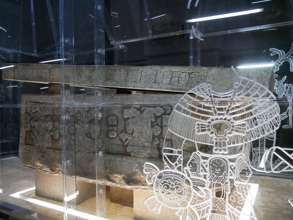 Nach einem längeren Abstieg durch den Dschungel dieses geschützten Naturparks über zahlreiche breite Stufen und Treppen vorbei an den Ruinen mehrerer Gebäudegruppen und der Überquerung eines Baches über eine Hängebrücke neben einem Wasserfall erreichen wir den unteren Ausgang. Hier befindet sich das kleine Museum der Anlage. Allein der hier ausgestellte Sarkophag lohnt den Besuch. Dabei hatten die Ausstellungsmacher eine geniale Idee. Die den Sarkophag umgebenden Wände mit ihren Reliefs bestehen aus Plexiglas, so dass man durch diese von allen Seiten die Inschriften auf dem Steinkoloss betrachten kann. Der füllt die Kammer nämlich fast vollständig aus.