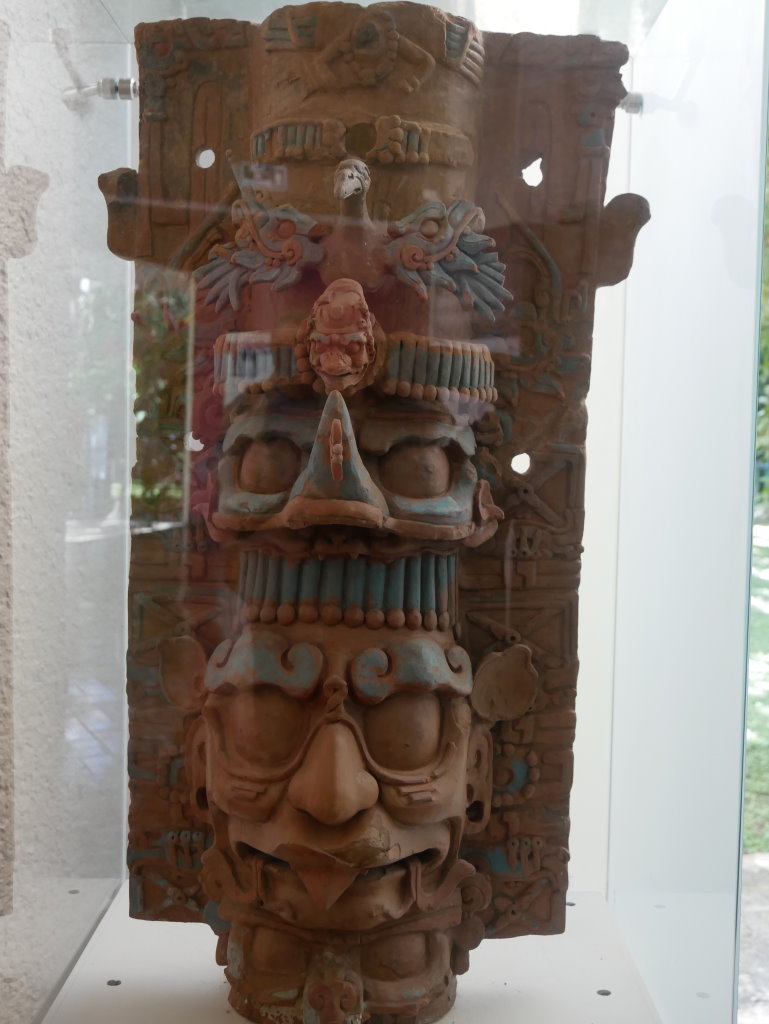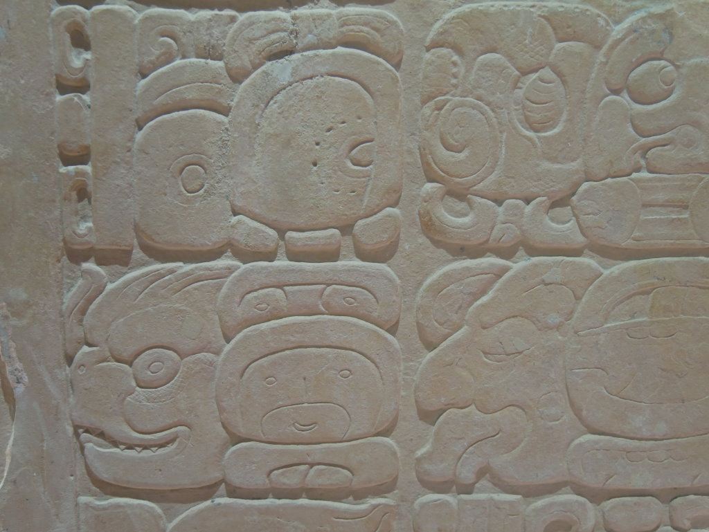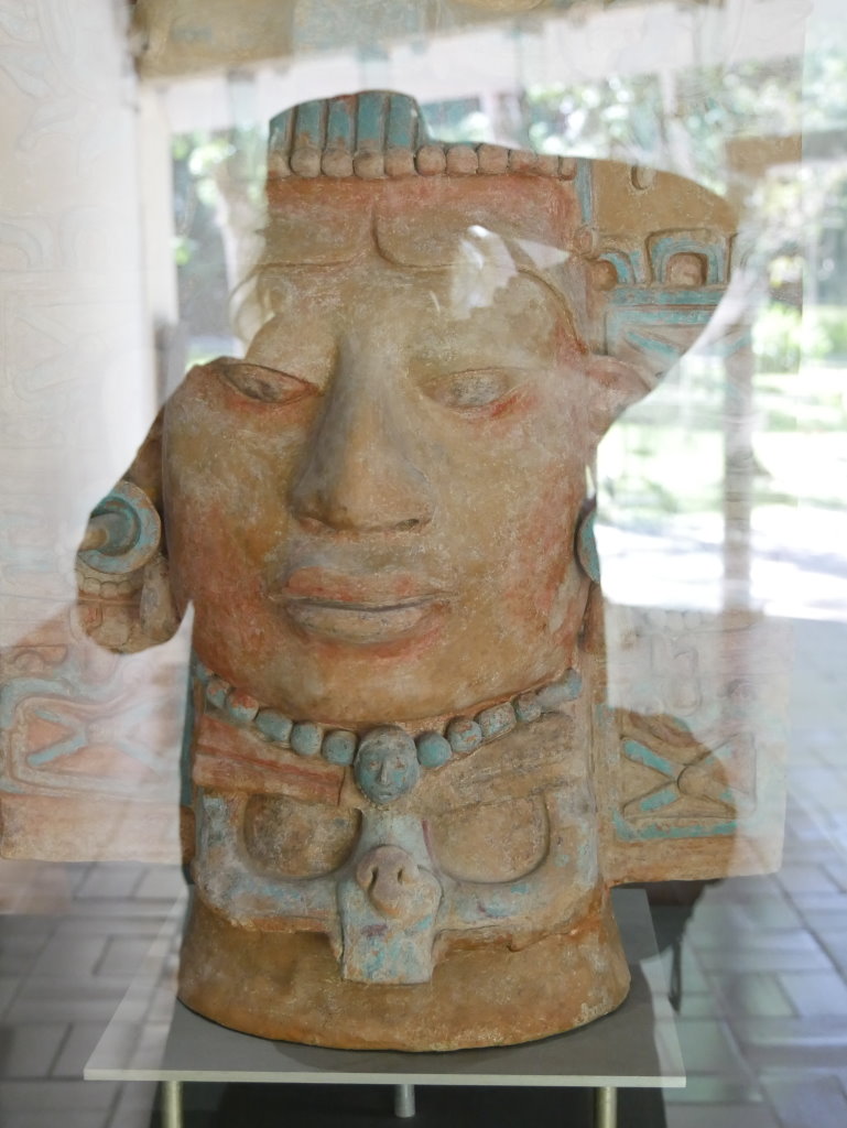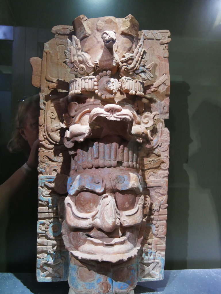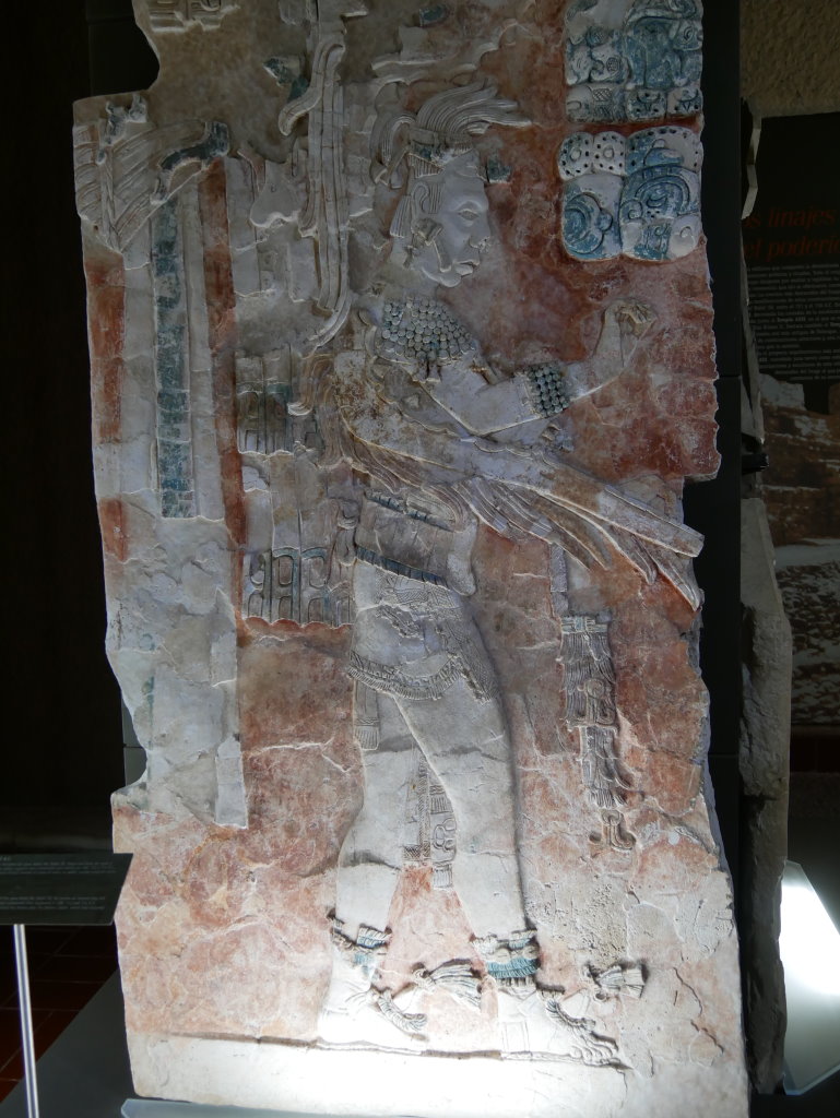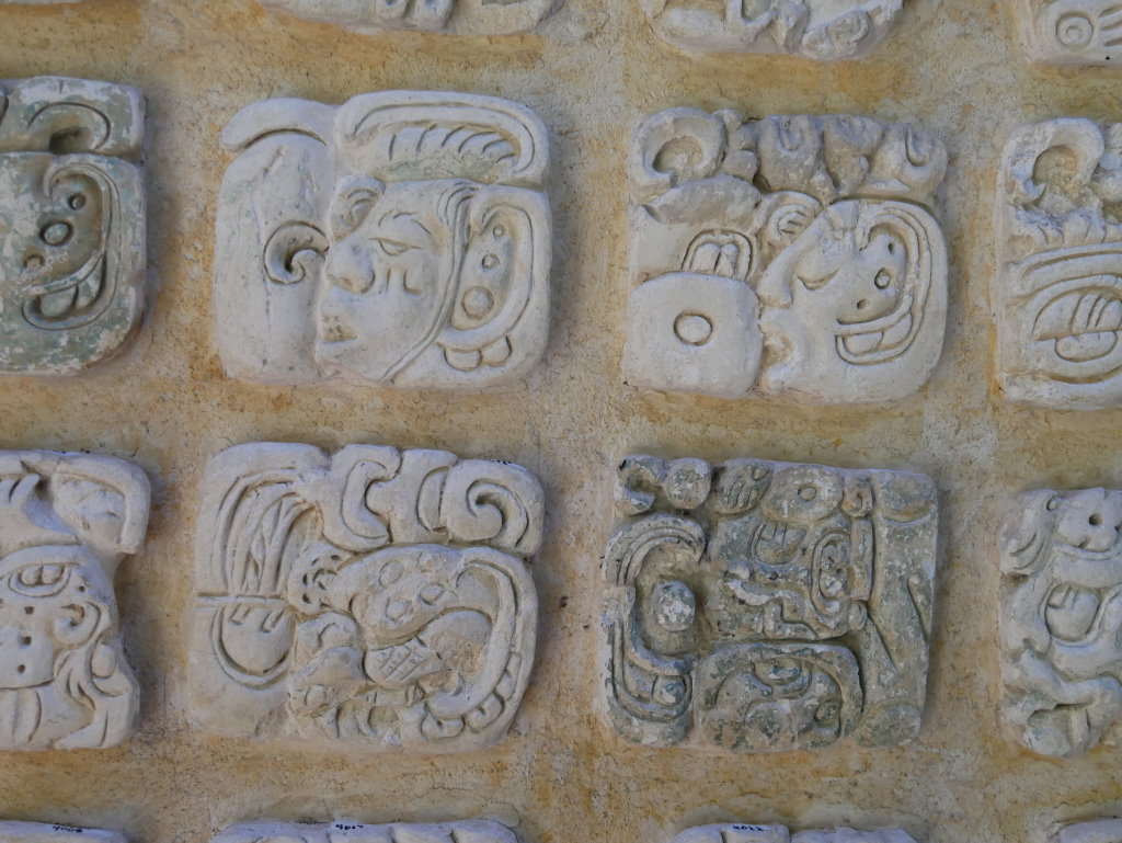 Nach einem längeren Abstieg durch den Dschungel dieses geschützten Naturparks über zahlreiche breite Stufen und Treppen vorbei an den Ruinen mehrerer Gebäudegruppen und der Überquerung eines Baches über eine Hängebrücke neben einem Wasserfall erreichen wir den unteren Ausgang. Hier befindet sich das kleine Museum der Anlage. Allein der hier ausgestellte Sarkophag lohnt den Besuch. Dabei hatten die Ausstellungsmacher eine geniale Idee. Die den Sarkophag umgebenden Wände mit ihren Reliefs bestehen aus Plexiglas, so dass man durch diese von allen Seiten die Inschriften auf dem Steinkoloss betrachten kann. Der füllt die Kammer nämlich fast vollständig aus.