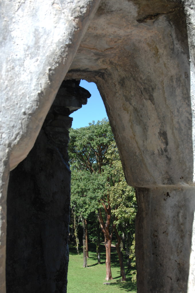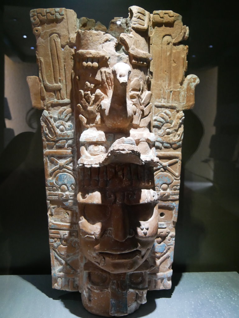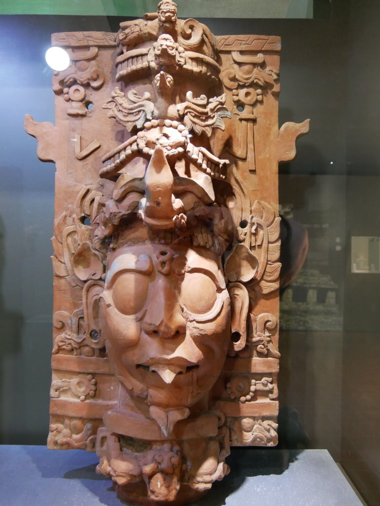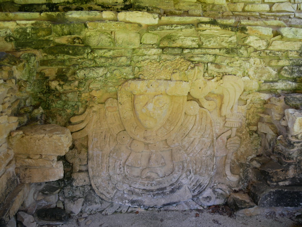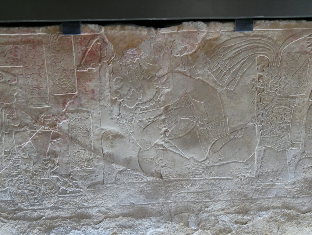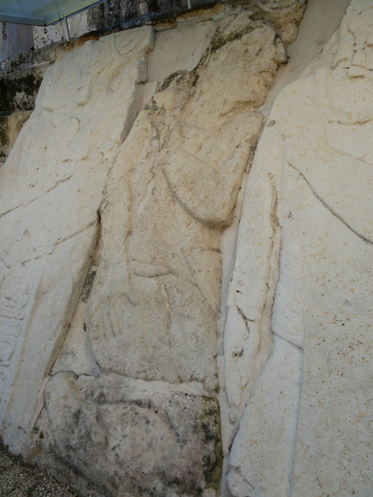 Nach einem längeren Abstieg durch den Dschungel dieses geschützten Naturparks über zahlreiche breite Stufen und Treppen vorbei an den Ruinen mehrerer Gebäudegruppen und der Überquerung eines Baches über eine Hängebrücke neben einem Wasserfall erreichen wir den unteren Ausgang. Hier befindet sich das kleine Museum der Anlage. Allein der hier ausgestellte Sarkophag lohnt den Besuch. Dabei hatten die Ausstellungsmacher eine geniale Idee. Die den Sarkophag umgebenden Wände mit ihren Reliefs bestehen aus Plexiglas, so dass man durch diese von allen Seiten die Inschriften auf dem Steinkoloss betrachten kann. Der füllt die Kammer nämlich fast vollständig aus.