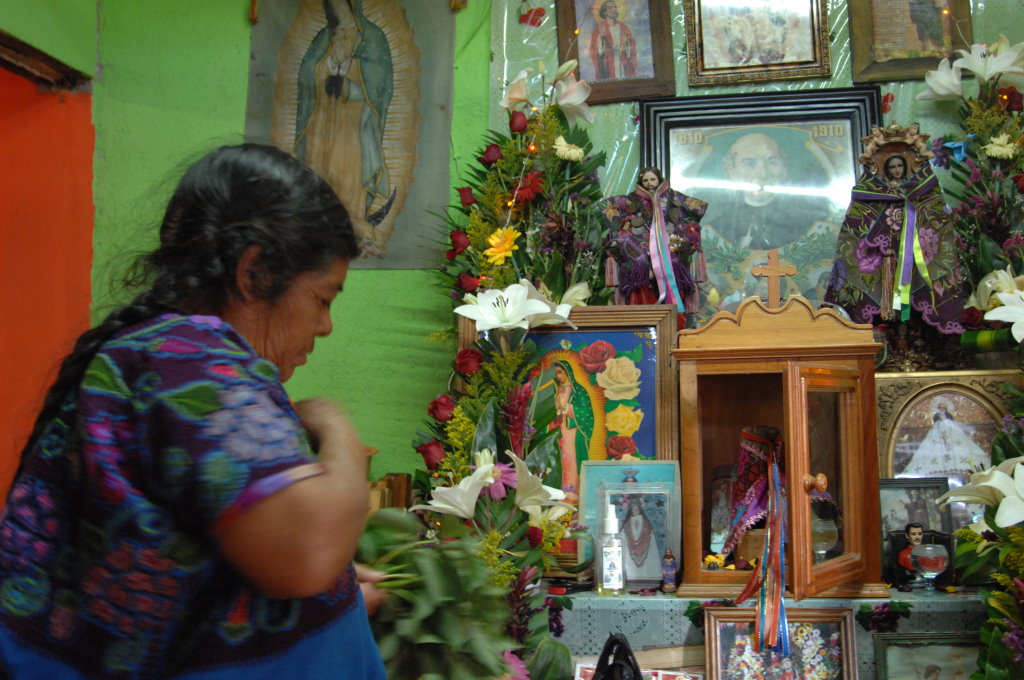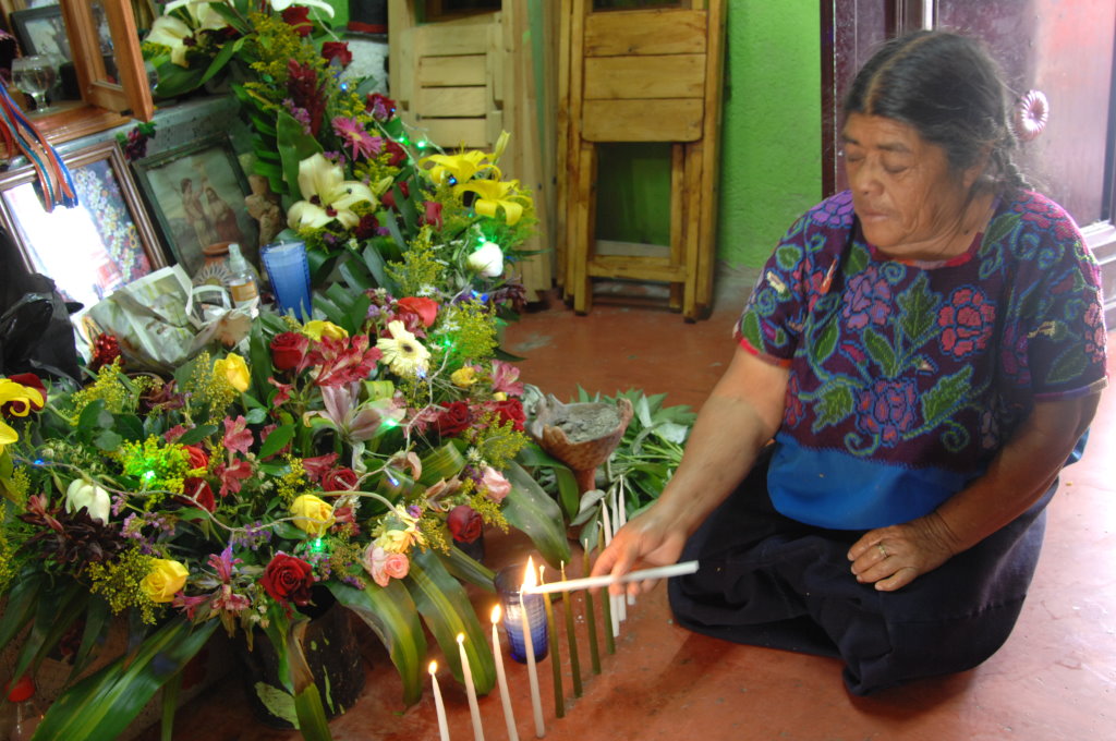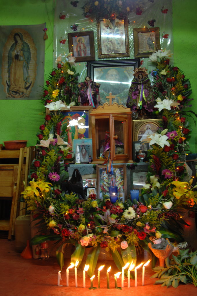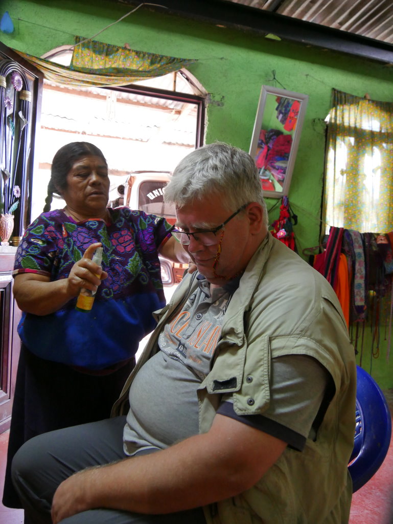 Wir fahren weiter in den Nachbarort Zinacantán, 8 Kilometer westlich von Chamula. Hier ist man weniger Fotoscheu. Dafür verirren sich auch weniger Touristen hierher. Bereits am Ortseingang warten einige junge Mädchen, um die Ankömmlinge in ihre Häuser einzuladen. Wir haben bereits ein Ziel. Wenige Straßen weiter warten Marie auf uns. Fabian hat einen Termin bei der Schamanin für uns arrangiert. Zunächst einmal wird er zum Einkaufen geschickt. Dem Medium sind die Kerzen ausgegangen. Dann geht es los. Unter ständigem Gemurmel ritueller Gebete wir der Körper des Klienten mit Holunderzweigen abgeschlagen. Dann folgen kreuzweise Berührungen mit den Kerzenbündeln. Den Abschluss bildet eine Art Salbung bestimmter Körperstellen mit einem wohlriechenden Öl. Abschließend betet die weise Frau vor dem üppig geschmückten Hausaltar mit den nun entzündeten Kerzen. Es sind 10 weiße und fünf grüne Kerzen, die weißen stehen für ein harmonisches Leben, die grünen für Erfolg im Beruf. Eine Reinigungszeremonie. Marie ist nicht nur Schamanin sondern arbeitet auch als Hebamme.