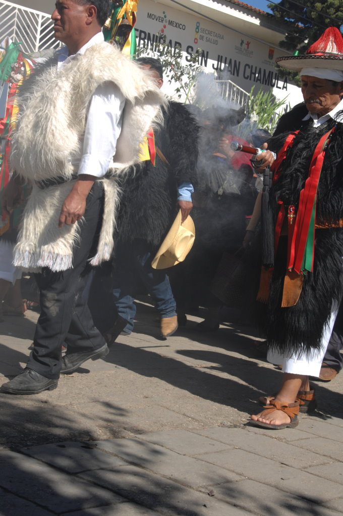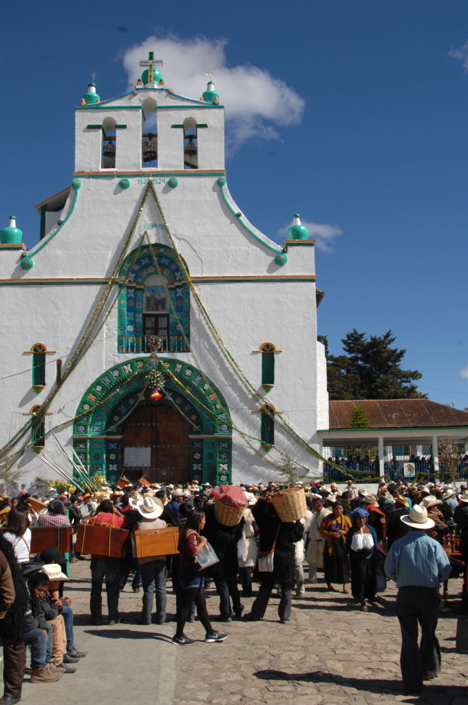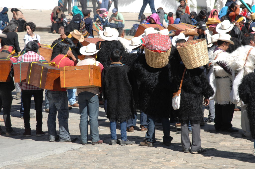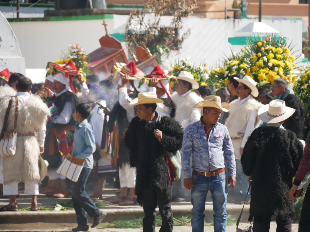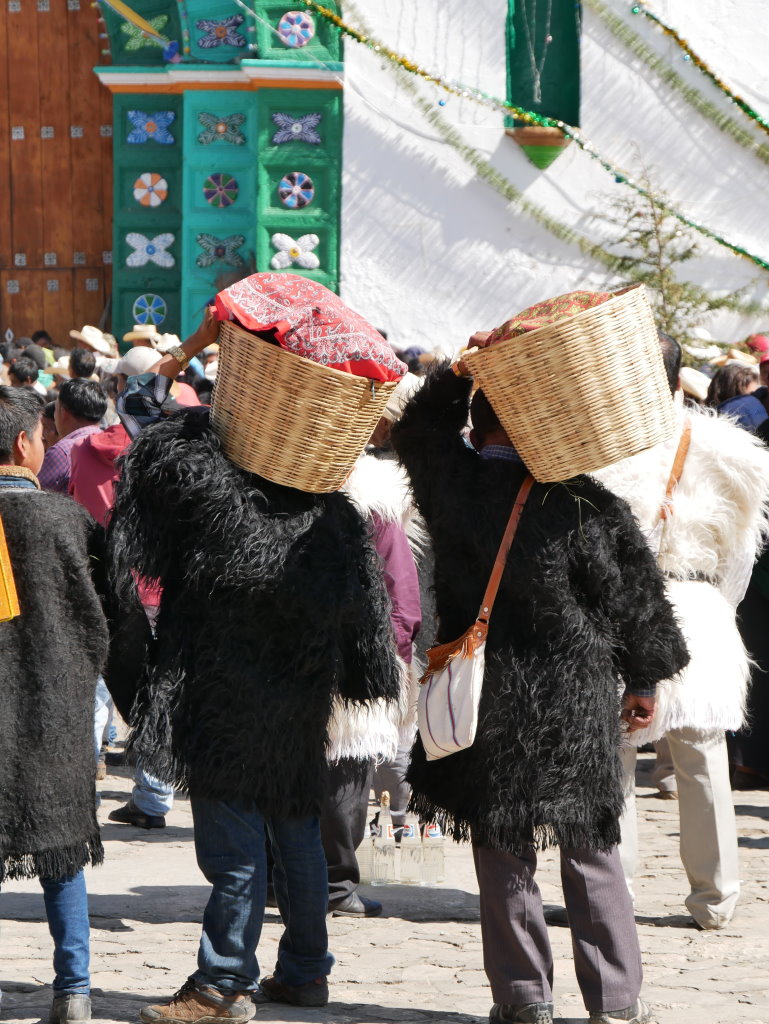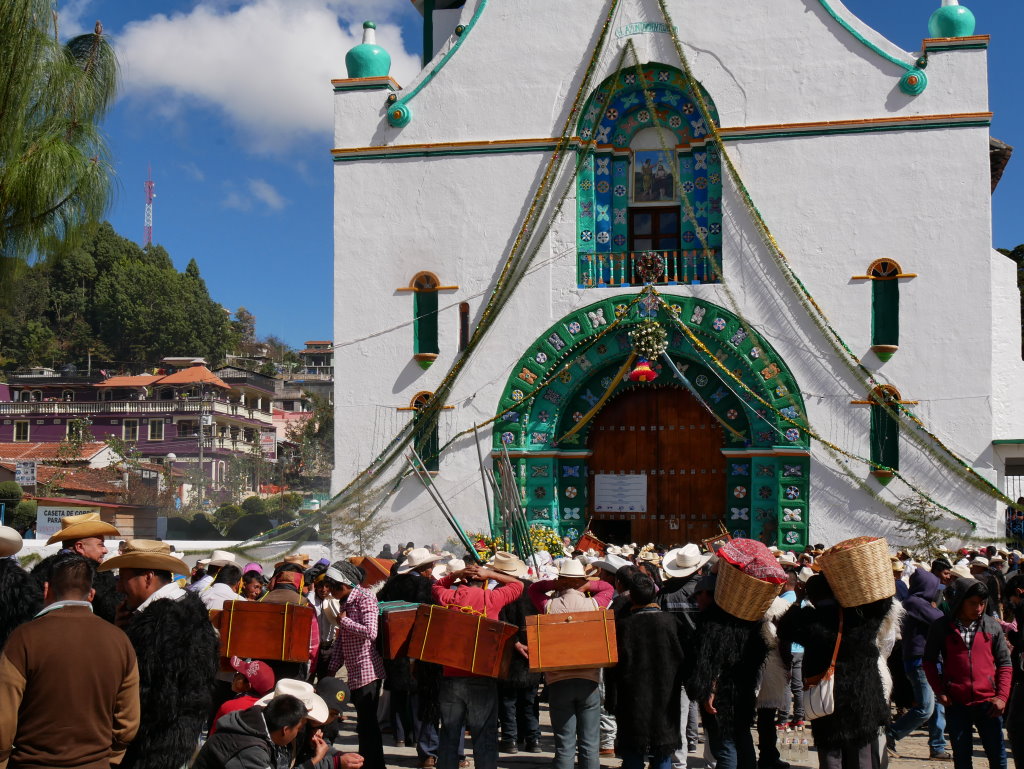 Es ist, als ob die Natur den Innenraum von San Juan Bautista in Chamula zurückerobert hat. Im Kirchenschiff gibt es keine Bänke, der Marmorboden ist mit langen Kiefernnadeln bedeckt. Es ist, als ob wir eine Zeit neben unserer Zeit betreten haben. Im schummrigen Dämmerlicht aus hunderten Kerzen und einigen Lichtstrahlen, die durch die wenigen Fenster brechen, existiert eine andere Realität. An den Seitenwänden stehen tragbare Vitrinen diverser Heiliger, die mit Kiefernzweigen , bunten Girlanden und Luftballons geschmückt sind. Vor sich tragen sie Spiegel zur Abwehr böser Blicke und Geister. Vor ihnen knien Frauen vom Volk der Tzotzil in ihren traditionellen schwarzen Ziegenfellröcken und Männer in ihren schwarzen und weißen Fell-Ponchos. Sie entzünden Kerzen und murmeln innige Gebete.