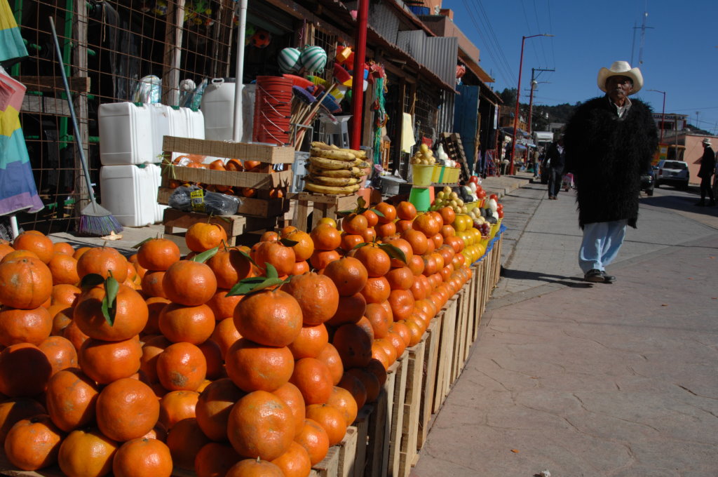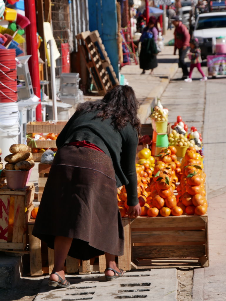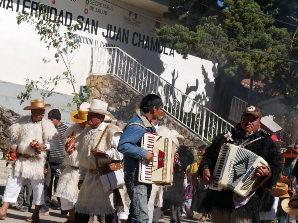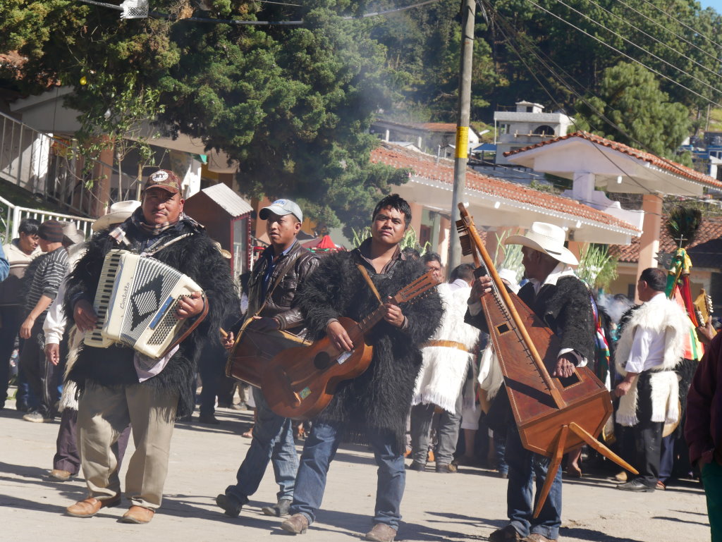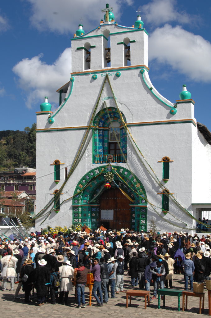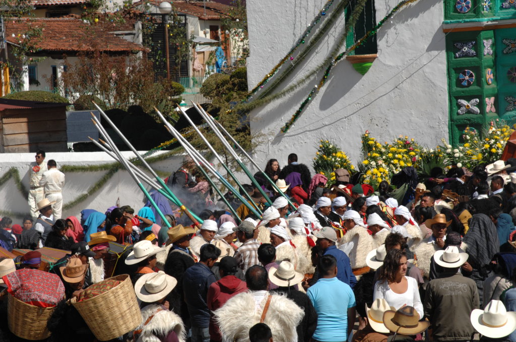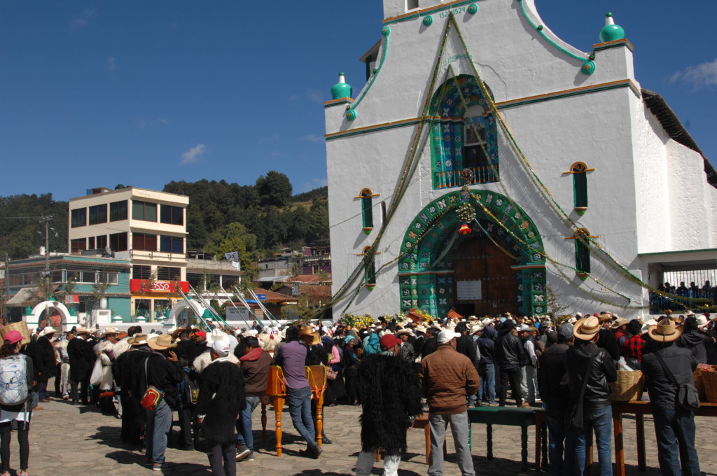 Es ist, als ob die Natur den Innenraum von San Juan Bautista in Chamula zurückerobert hat. Im Kirchenschiff gibt es keine Bänke, der Marmorboden ist mit langen Kiefernnadeln bedeckt. Es ist, als ob wir eine Zeit neben unserer Zeit betreten haben. Im schummrigen Dämmerlicht aus hunderten Kerzen und einigen Lichtstrahlen, die durch die wenigen Fenster brechen, existiert eine andere Realität. An den Seitenwänden stehen tragbare Vitrinen diverser Heiliger, die mit Kiefernzweigen , bunten Girlanden und Luftballons geschmückt sind. Vor sich tragen sie Spiegel zur Abwehr böser Blicke und Geister. Vor ihnen knien Frauen vom Volk der Tzotzil in ihren traditionellen schwarzen Ziegenfellröcken und Männer in ihren schwarzen und weißen Fell-Ponchos. Sie entzünden Kerzen und murmeln innige Gebete.