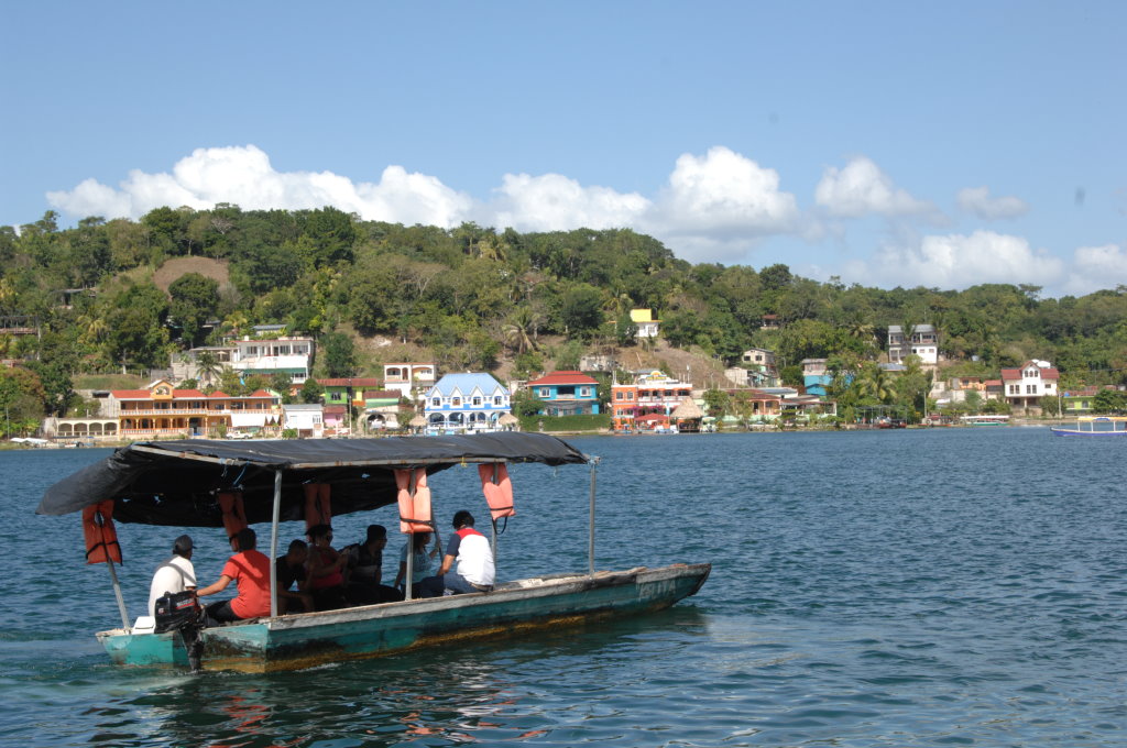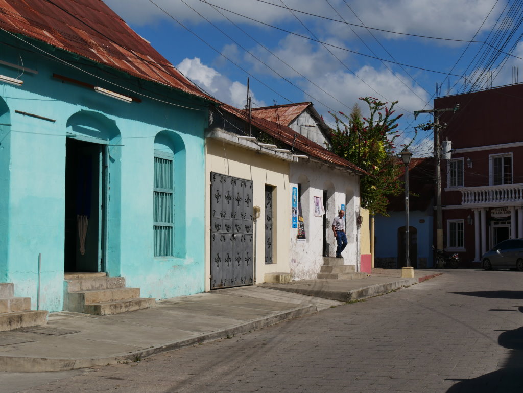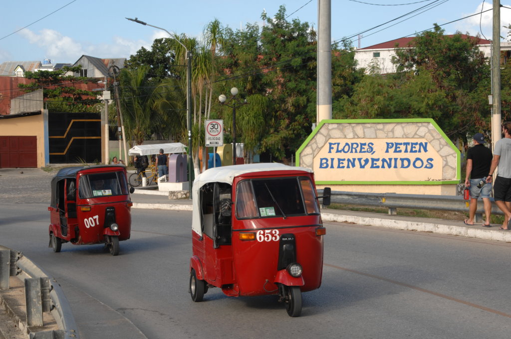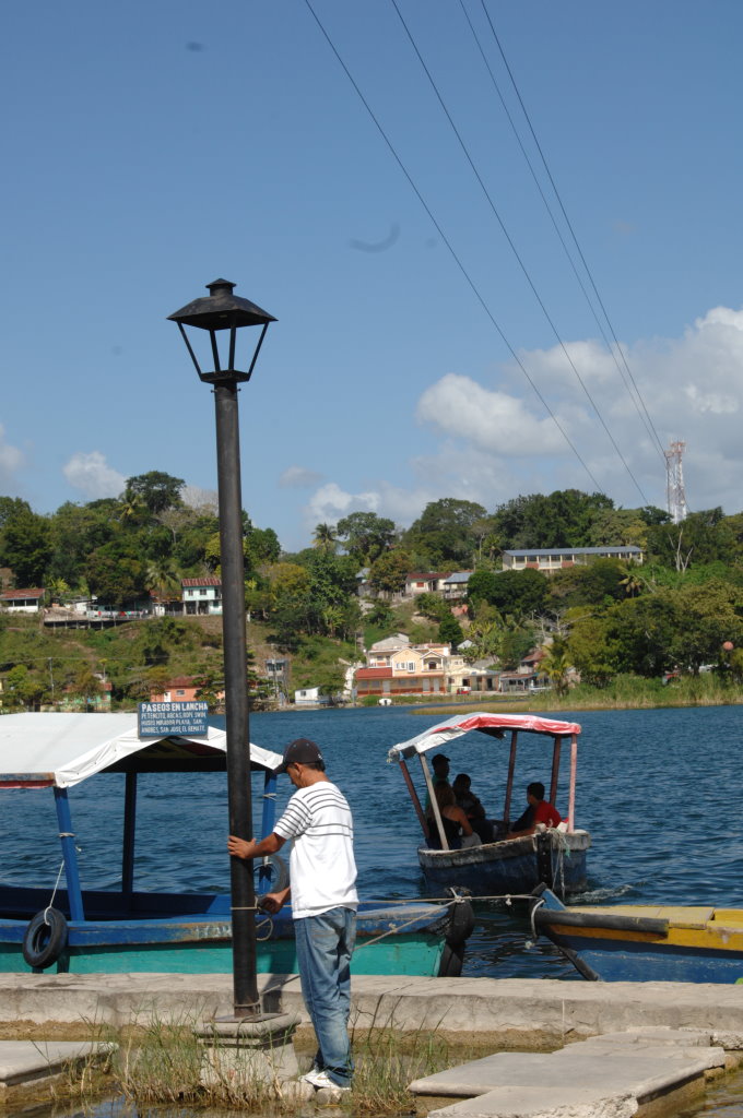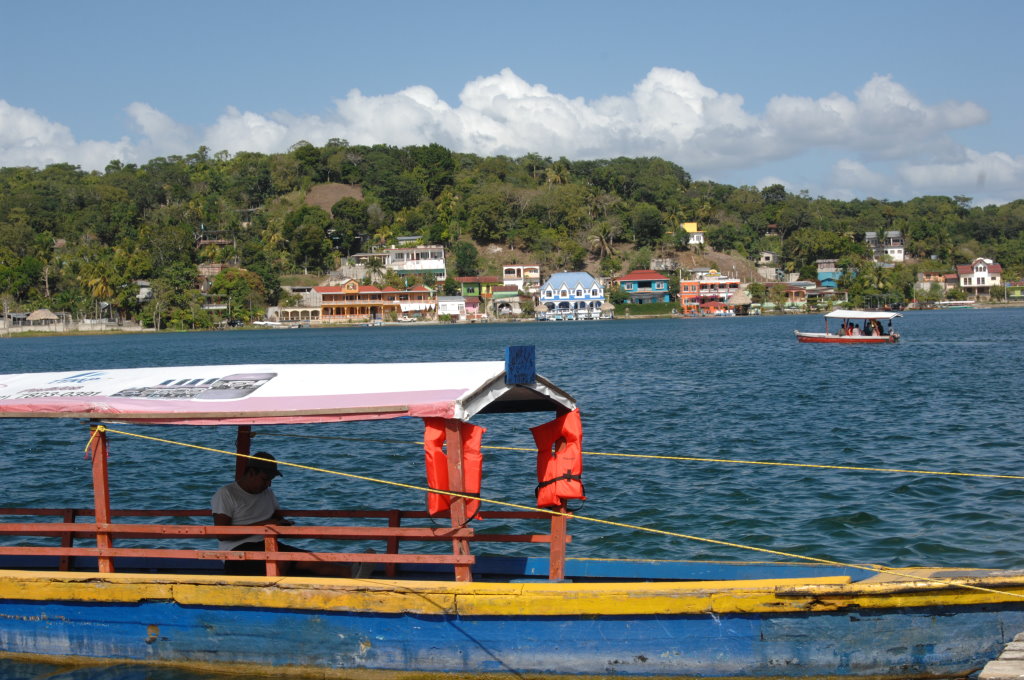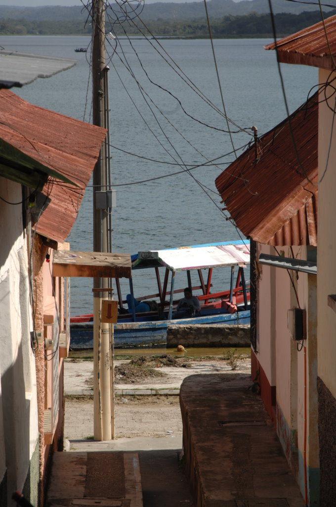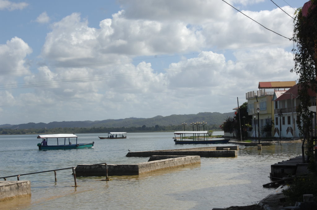 Wir spazieren gemütlich weiter auf der Uferpromenade rund um die Insel. Auf der Rückseite – gegenüber dem Damm, der sie mit dem Festland verbindet – müssen wir auf die höhergelegene Straße hinter den Häusern ausweichen. Seit 2013 ist der Wasserstand des Petén-Itza-Sees stark gestiegen und Teile des Malecóns stehen seitdem unter Wasser.