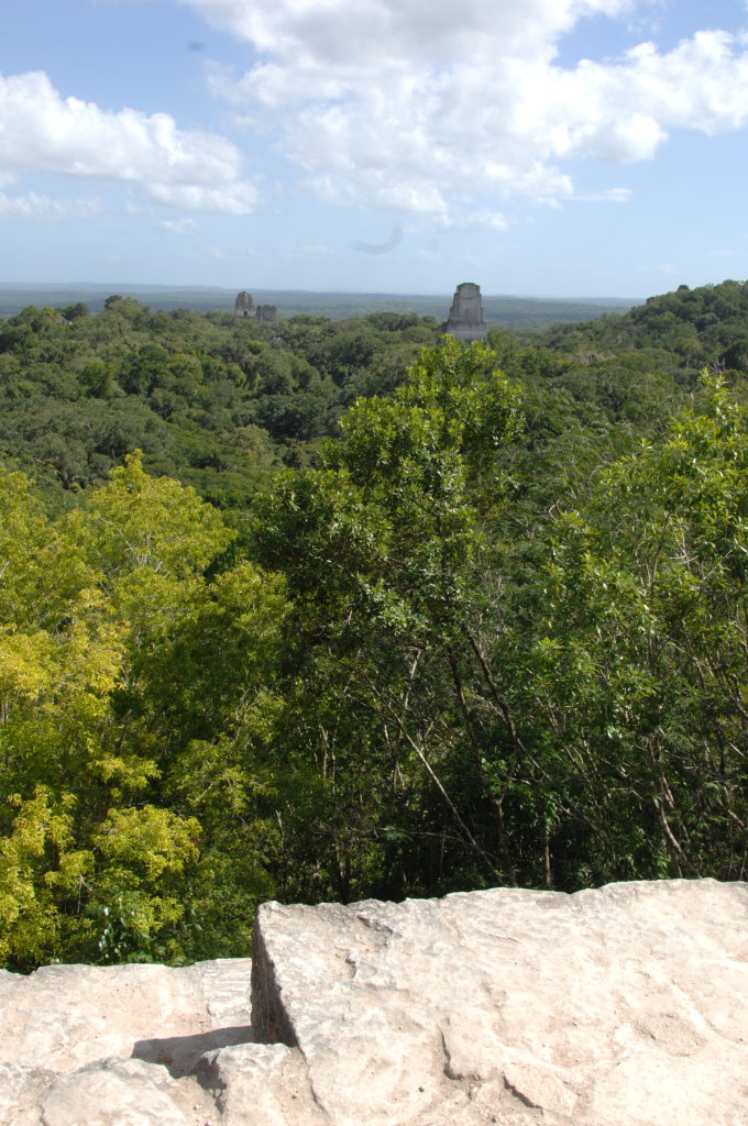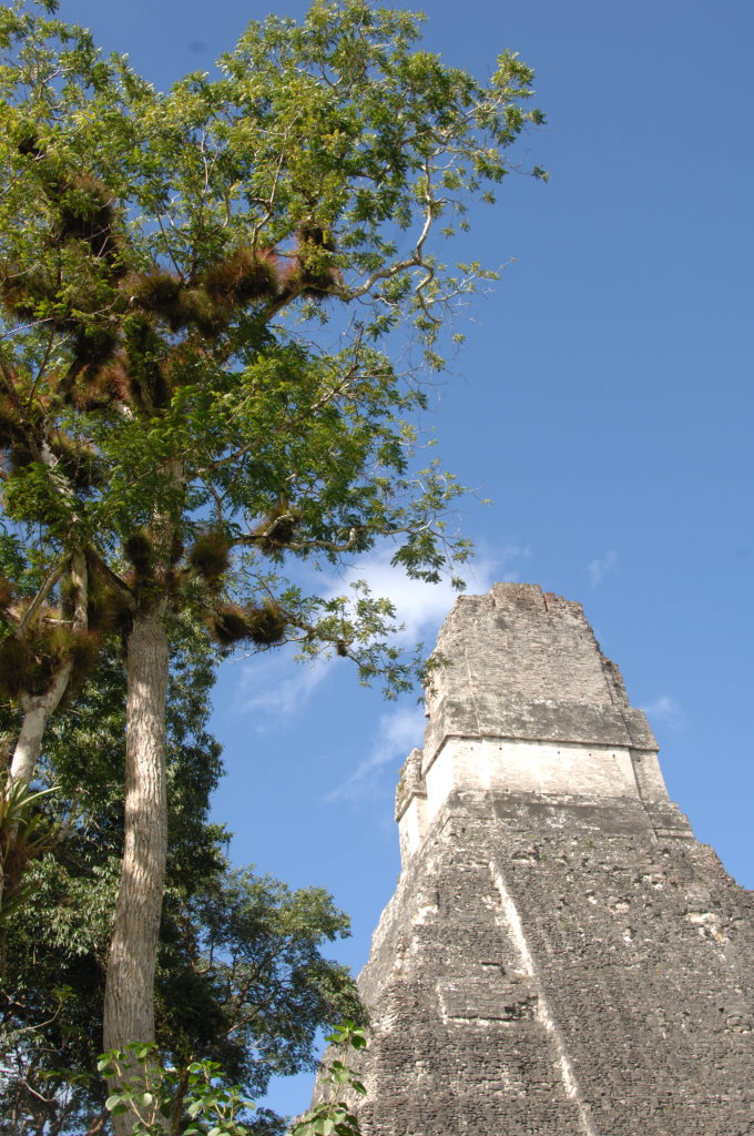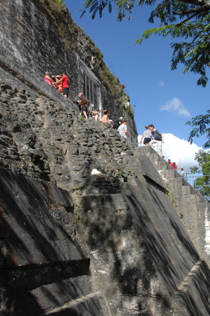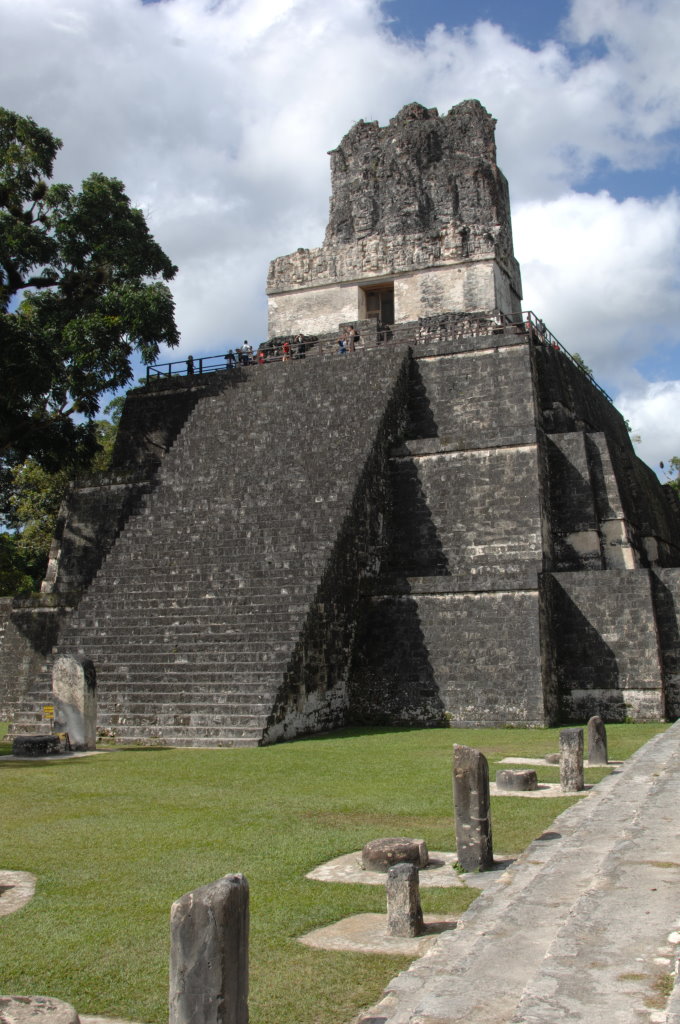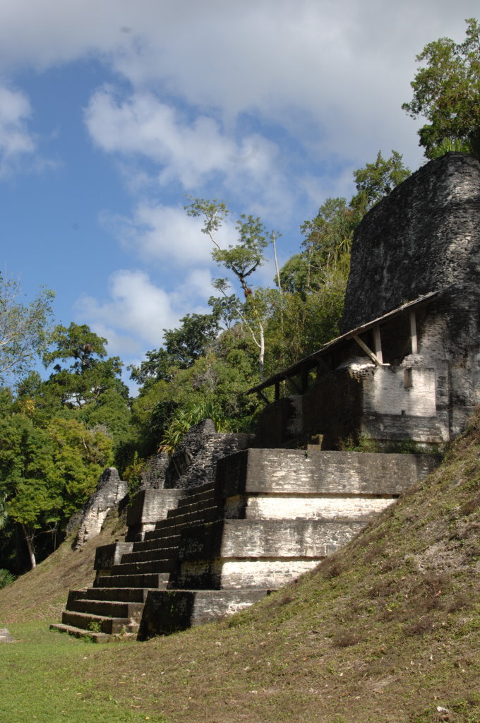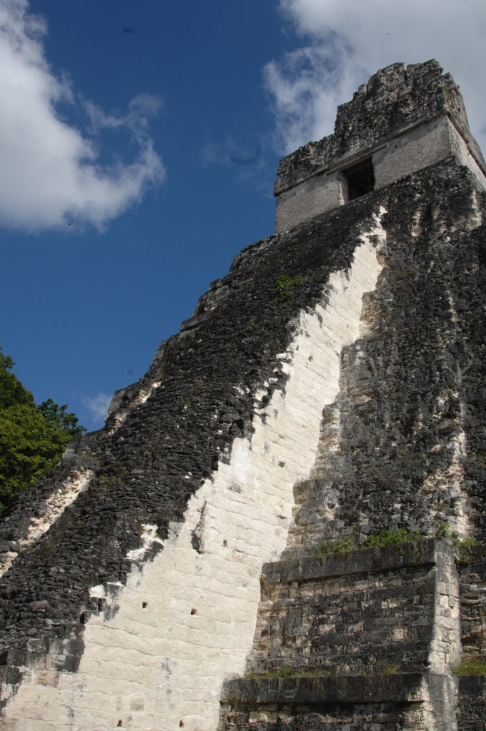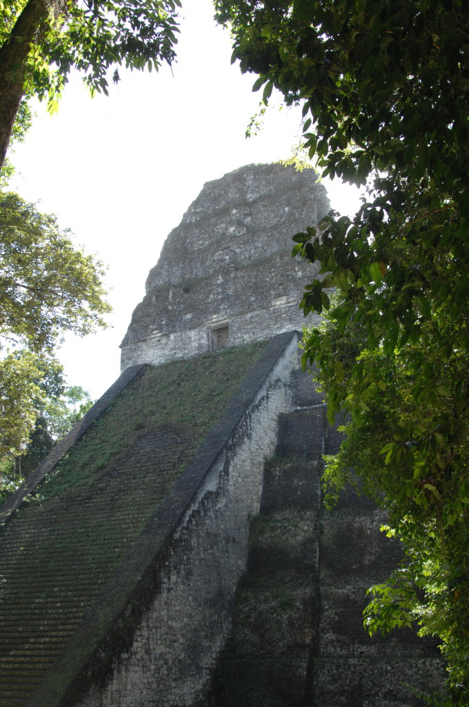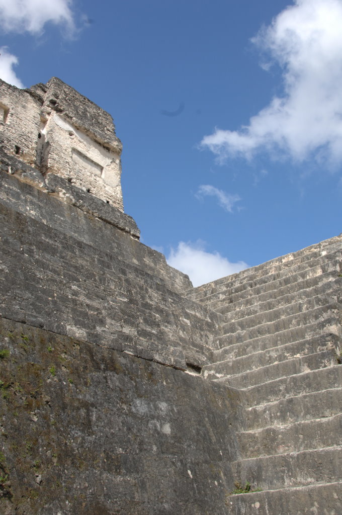 Fast 200 Stufen sind es bis zur Plattform des Tempels IV im östlichen Eck des weitläufigen Parks der Ausgrabungsstätte von Tikal. Um die steinernen Stufen zu schützen, ist der Aufstieg nur von der Seite über eine Holztreppe erlaubt. Die schweißtreibende Aktion lohnt sich. Oberhalb der Wipfel der Urwaldriesen sieht man die Bauten auf den Plattformen einzelner Tempel-Pyramiden aus dem grünen Dickicht ragen.