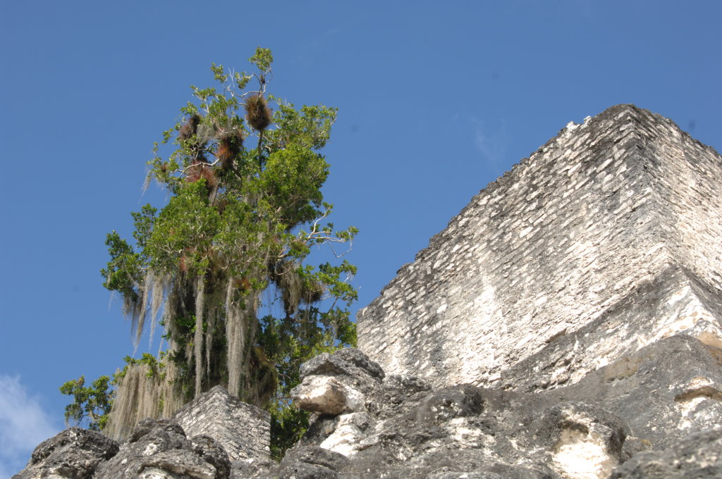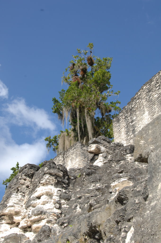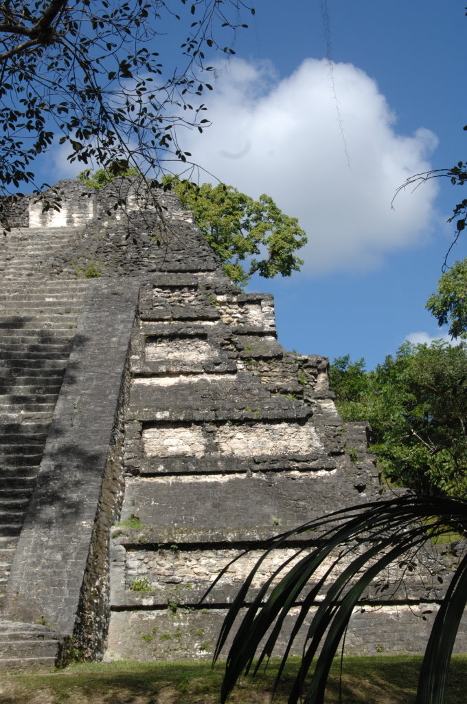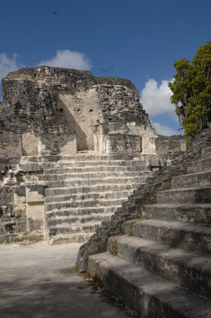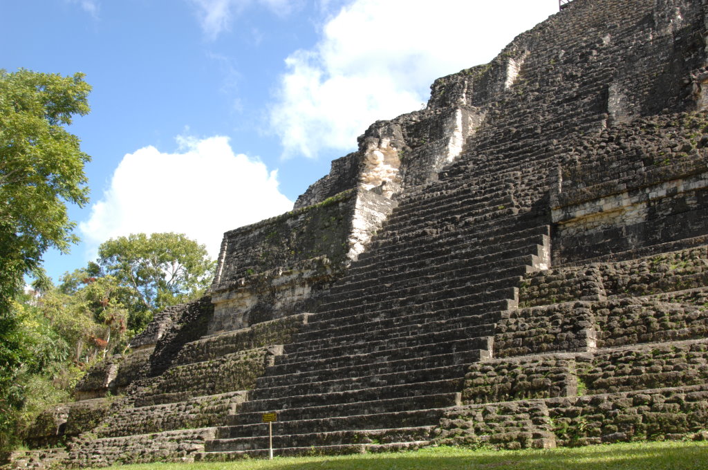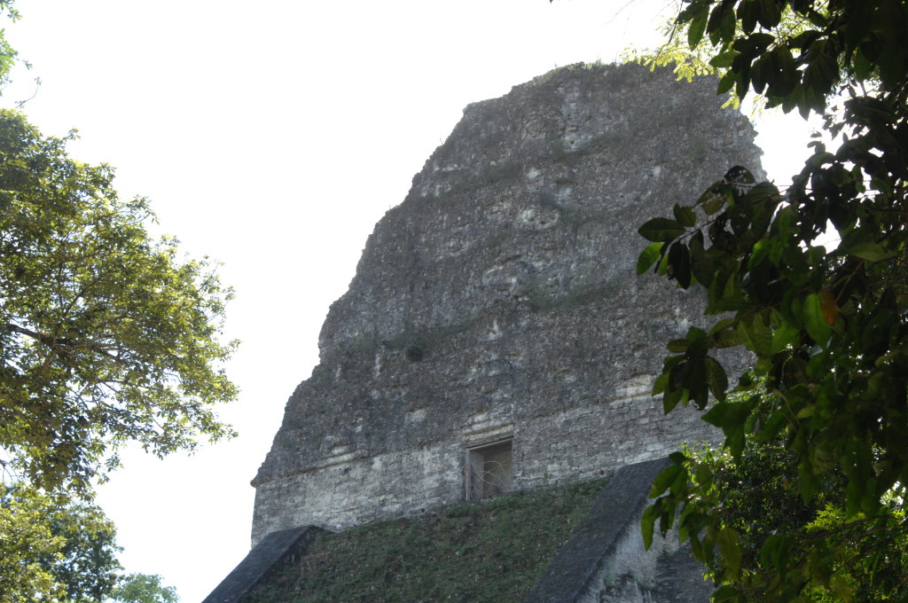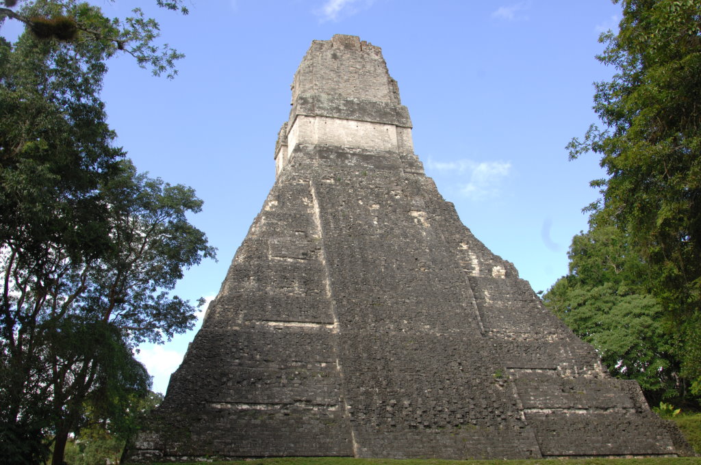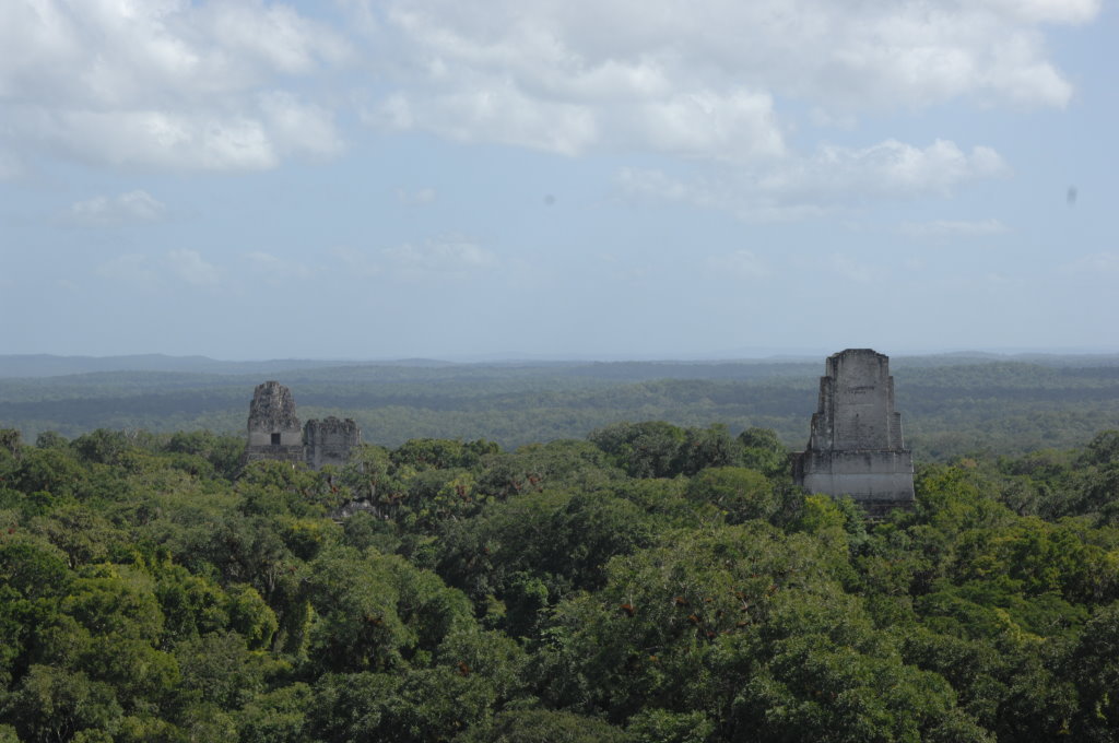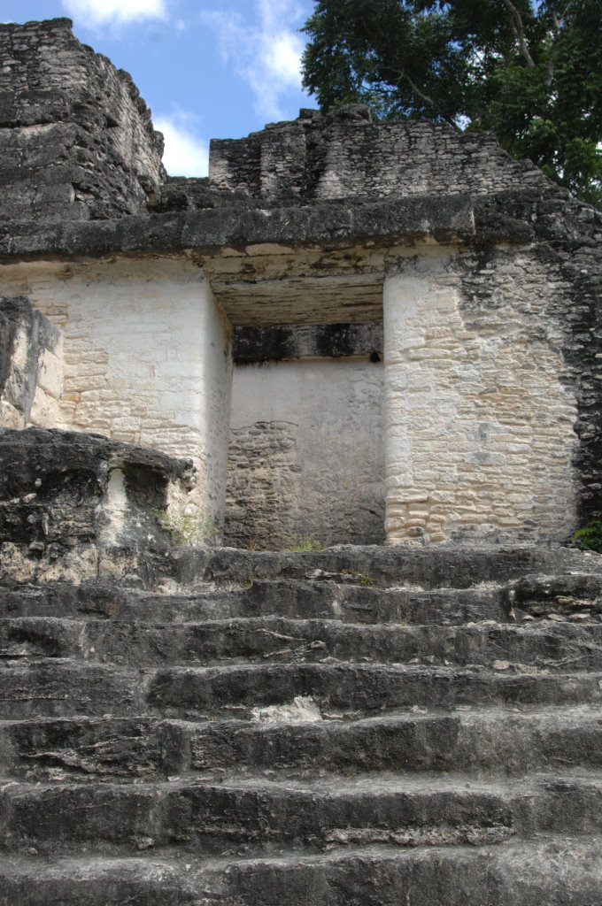 Fast 200 Stufen sind es bis zur Plattform des Tempels IV im östlichen Eck des weitläufigen Parks der Ausgrabungsstätte von Tikal. Um die steinernen Stufen zu schützen, ist der Aufstieg nur von der Seite über eine Holztreppe erlaubt. Die schweißtreibende Aktion lohnt sich. Oberhalb der Wipfel der Urwaldriesen sieht man die Bauten auf den Plattformen einzelner Tempel-Pyramiden aus dem grünen Dickicht ragen.