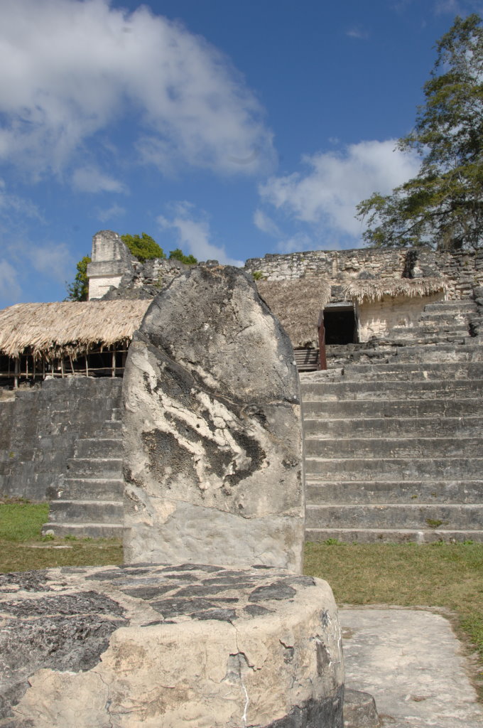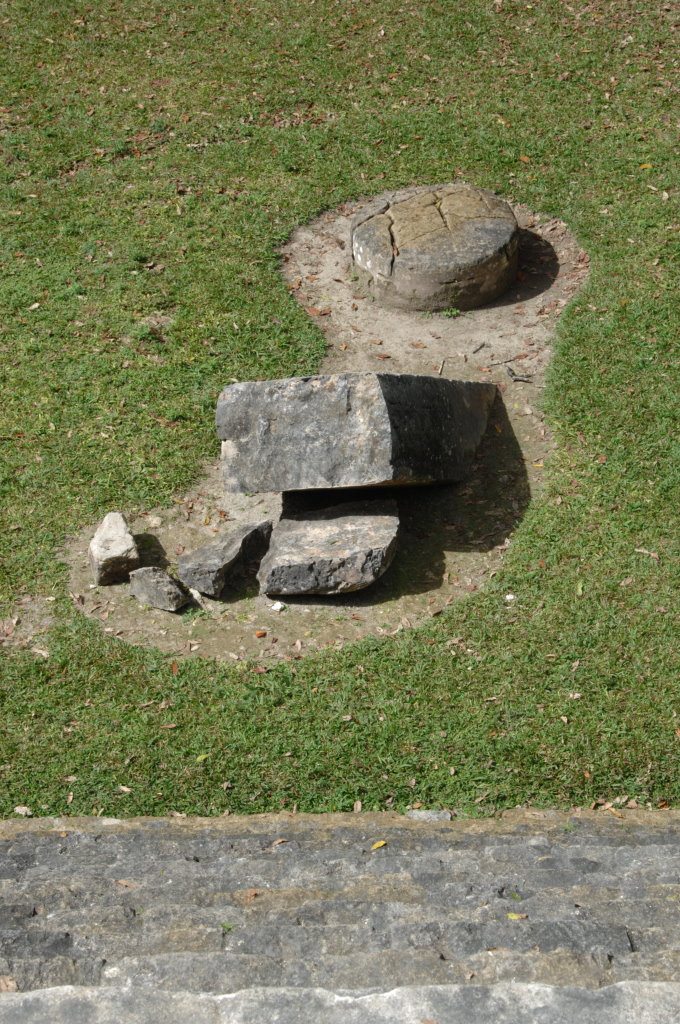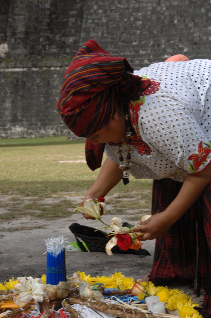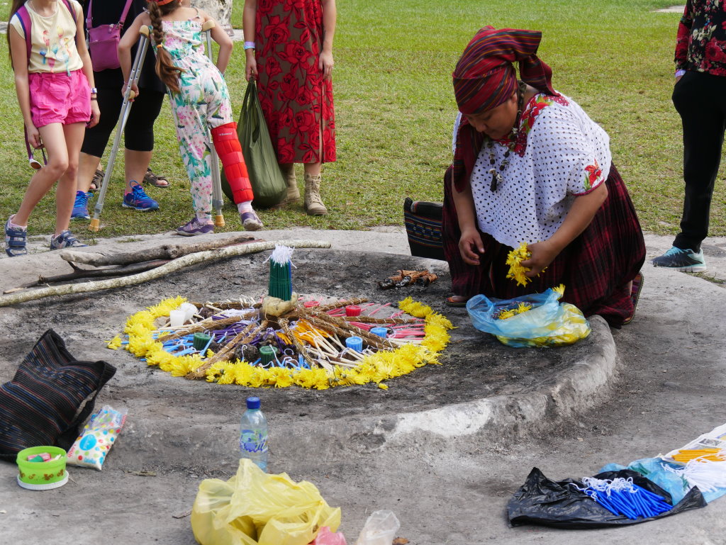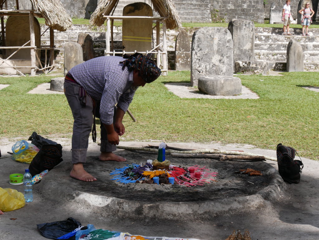 Als wir die „Gran Plaza“ zwischen den beiden betreten, bereitet gerade eine Nachfahrin der Maya mit ihrem Begleiter ein Brandopfer auf einer runden Steinscheibe in der Mitte des Platzes vor. Blumen und Kerzen werden vergleichbar einem Mandala ausgelegt und später in Brand gesetzt.