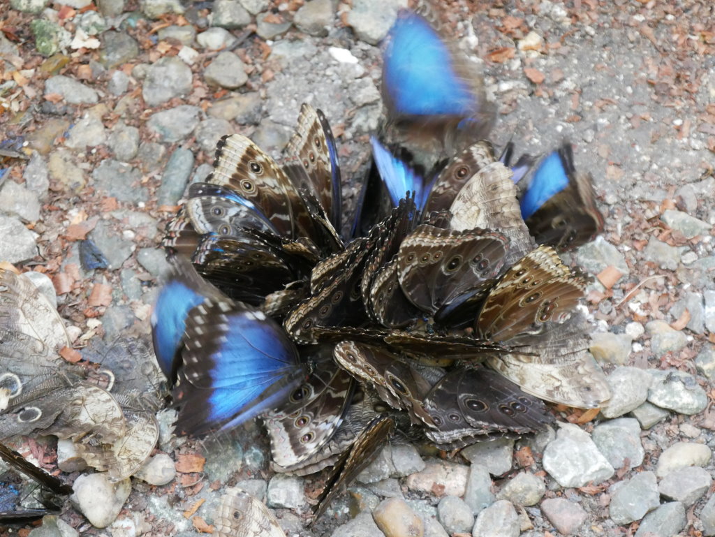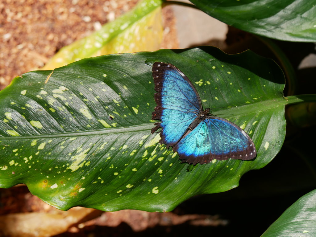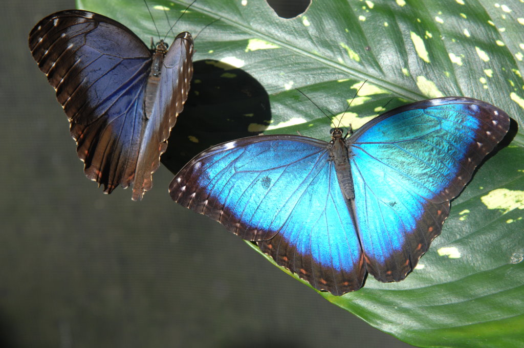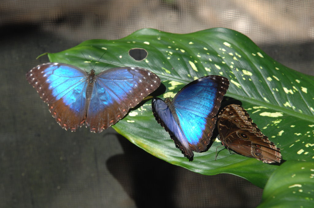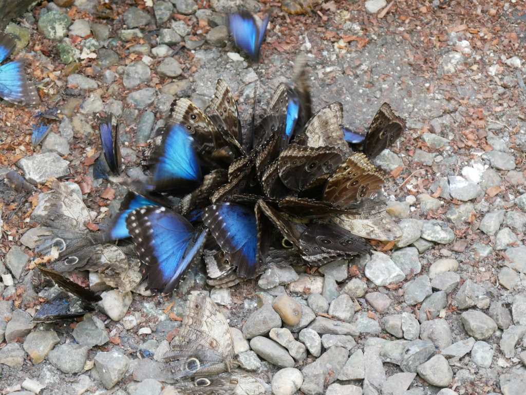 Nach diesem ausführlichen botanischen Exkurs fahren wir weiter zur Schmetterlingszucht des Chaa Creek Resorts. Der Blaue Morphofalter (Blue Morpho) oder Himmelsfalter macht seinem Namen alle Ehre. Während die Flügel zusammengeklappt außen mit ihren sieben „Augen“ Fressfeinde verschrecken sollen und ansonsten nicht sonderlich spektakulär erscheinen, ist es die Innenseite der mit bis zu 12 Zentimeter Spannweite ausgeklappten Flügel, die dem Insekt seinen Namen gaben. Die schillernden Blautöne entstehen durch Interferenzen des Lichts, das auf die Schuppen der Flügel fällt – nicht etwa aufgrund von darin enthaltenen Pigmenten.