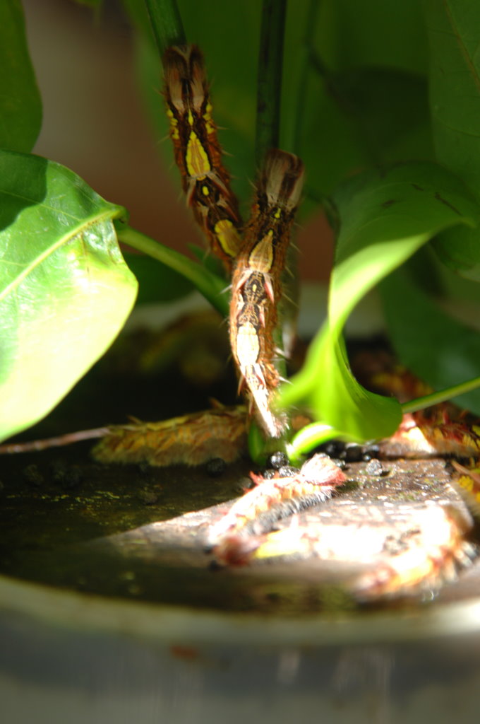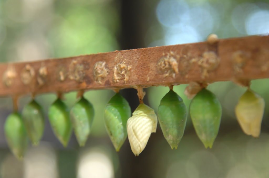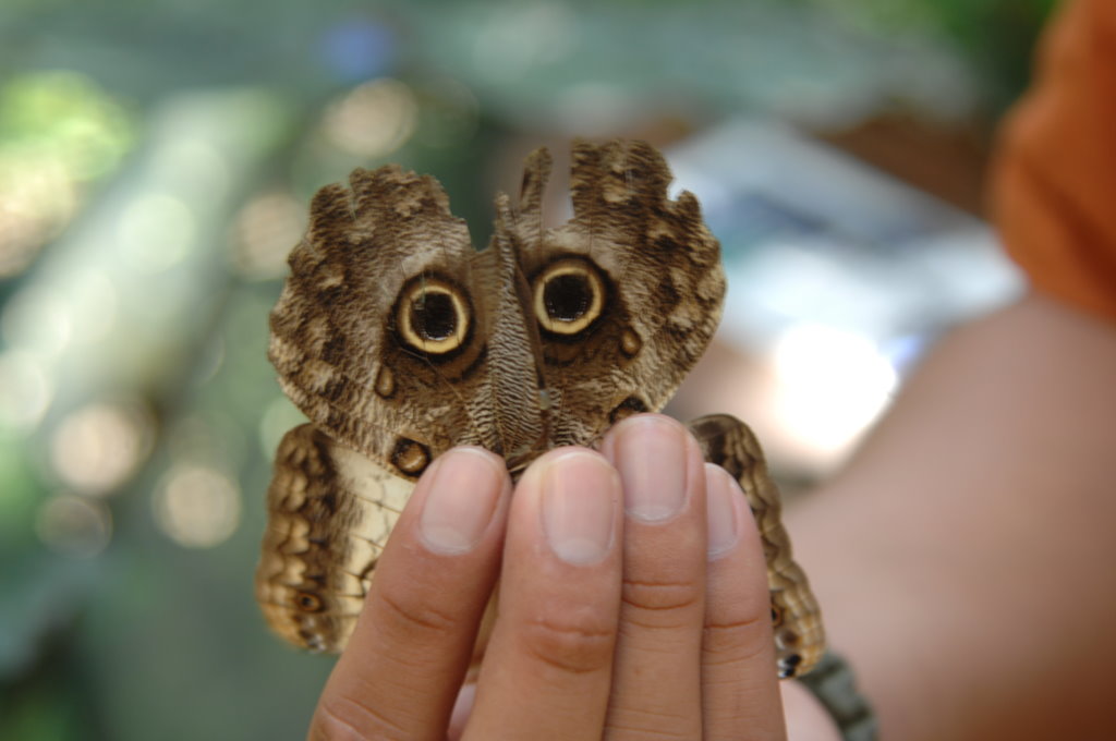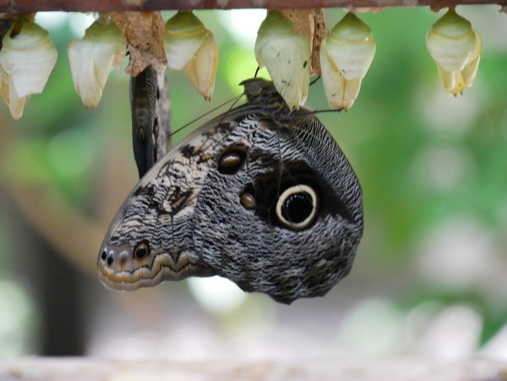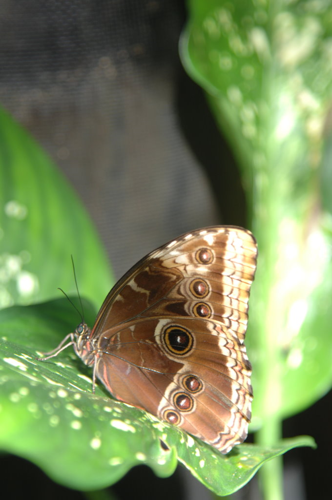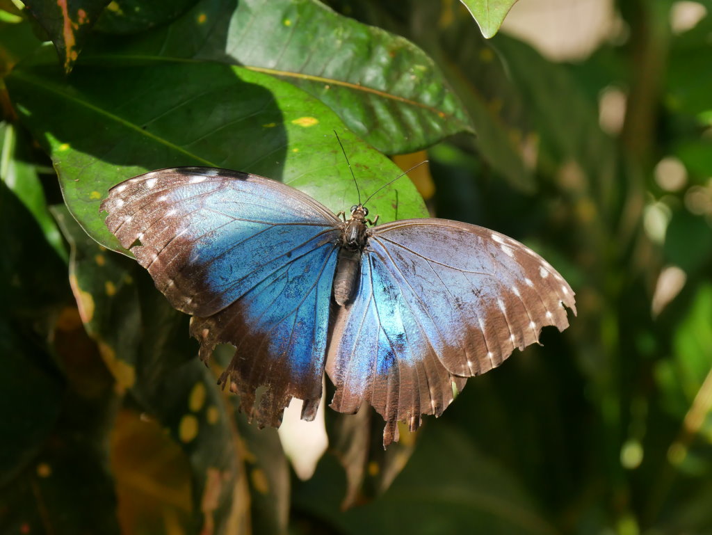 Nach diesem ausführlichen botanischen Exkurs fahren wir weiter zur Schmetterlingszucht des Chaa Creek Resorts. Der Blaue Morphofalter (Blue Morpho) oder Himmelsfalter macht seinem Namen alle Ehre. Während die Flügel zusammengeklappt außen mit ihren sieben „Augen“ Fressfeinde verschrecken sollen und ansonsten nicht sonderlich spektakulär erscheinen, ist es die Innenseite der mit bis zu 12 Zentimeter Spannweite ausgeklappten Flügel, die dem Insekt seinen Namen gaben. Die schillernden Blautöne entstehen durch Interferenzen des Lichts, das auf die Schuppen der Flügel fällt – nicht etwa aufgrund von darin enthaltenen Pigmenten.