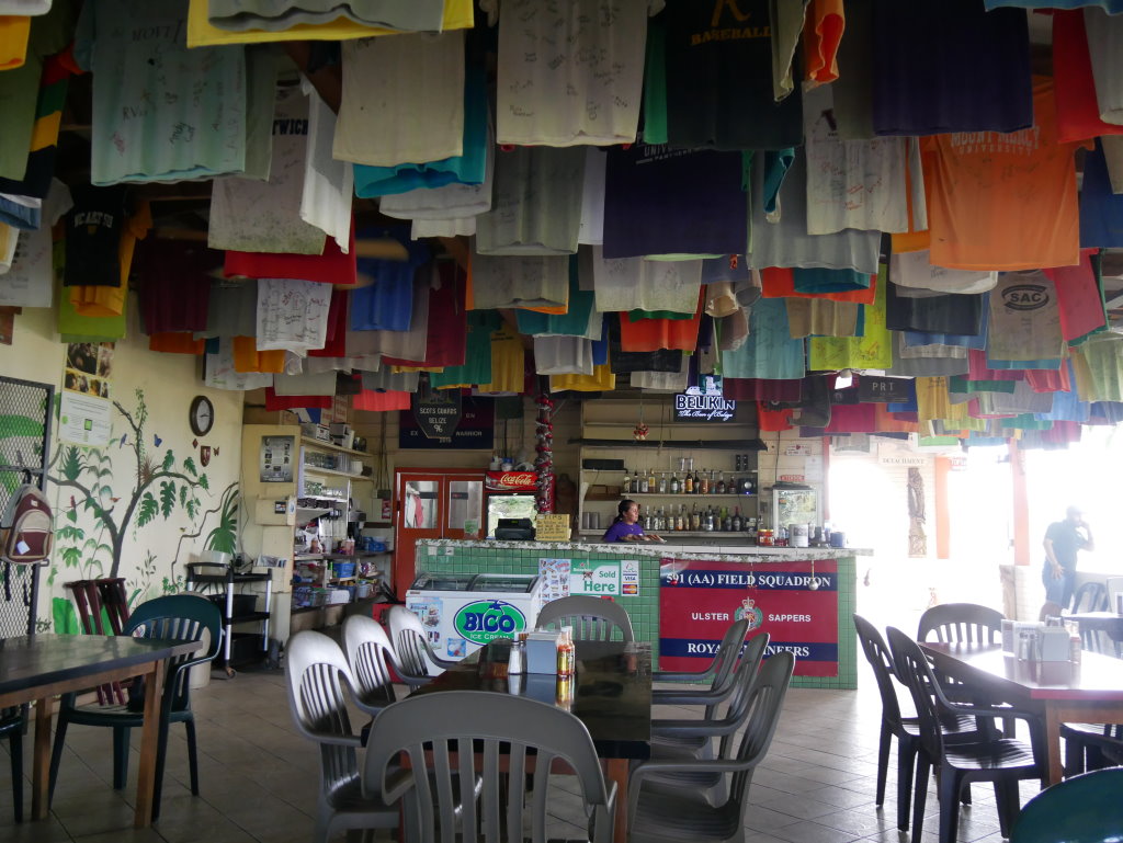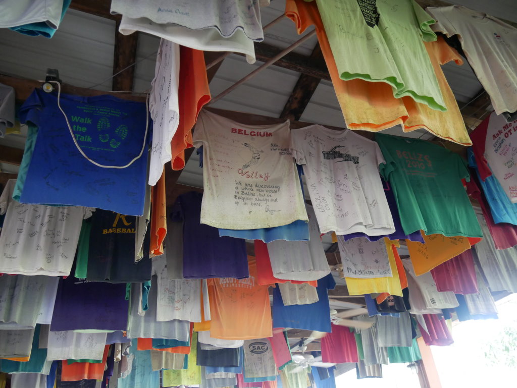 Unterwegs machen wir einen kleinen Mittagsstopp im Cheers Restaurant am Western Highway kurz hinter La Democracia. Die Eigentümer sind Kanadier, das Angebot entsprechend mehr hamburgerlastig als üblich in Belize. Von der Decke hängen T-Shirts mit Namen und Grüßen früherer Gäste. Der Laden brummt und ist allseits beliebt. Hinter uns gibt eine größere Reisegruppe lautstark Ihre Bestellung auf, nebenan studiert eine Mennoniten-Familie die Speisekarte.
