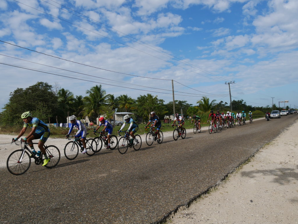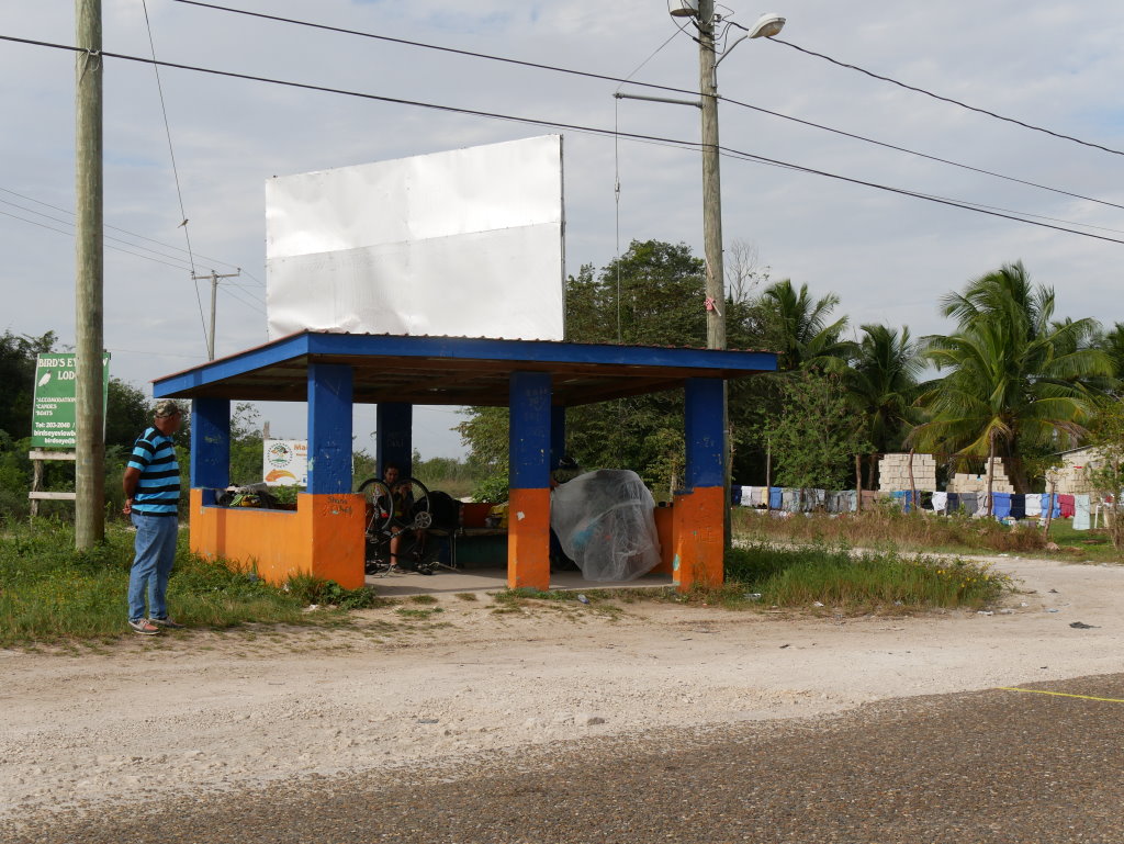 Eine Stunde später warten wir mit unseren Rucksäcken an der Einmündung des Causeway zum Northern Highway auf einen Bus aus Belize City, der uns nach Norden zur mexikanischen Grenze bringen soll. Die Chefin der Lodge hat uns mit ihrem Van bis zum Unterstand an der Abzweigung gefahren. Die Busse kommen hier meist stündlich vorbei, einfach nur winken, wenn wir mitfahren wollen. Wir sind 10 Minuten vor dem erwarteten Zeitpunkt vor Ort, aber es passiert eine halbe Stunde erstmal gar nichts, außer dass die Temperatur sich langsam der 30 Gradgrenze nähert. Es ist Sonntag, da kann auch mal ein Bus weniger fahren. Dann flitzt plötzlich erst ein kleiner, später ein größerer Pulk Radfahrer vorbei, gefolgt von Vans mit Ersatzrädern und Helfern.