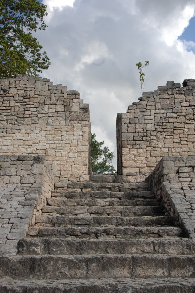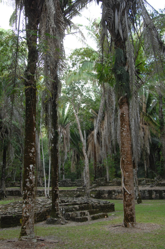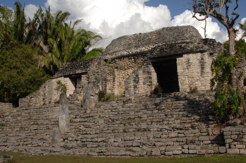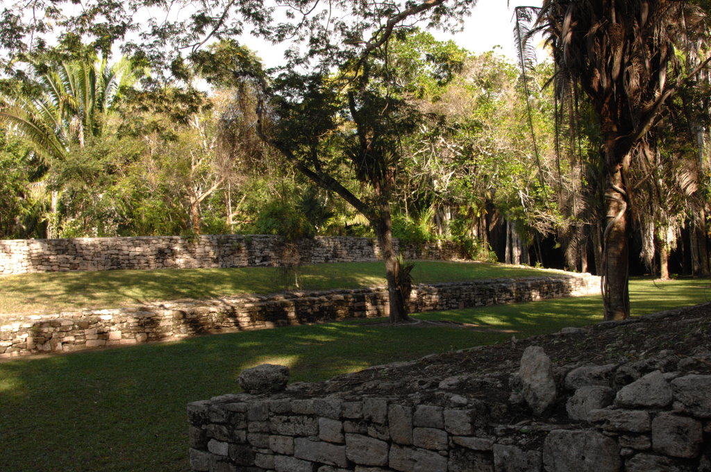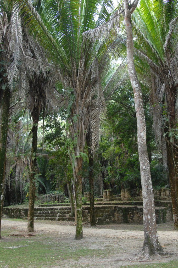 Die sind auch eine der ersten Besonderheiten, die uns an dieser Anlage auffallen. Die Bauten scheinen sich in einem großen Palmenhain zu befinden. Sie sind im Rio-Bec-Stil gebaut und wurden zwischen 800 und 1050 n.Chr. errichtet.