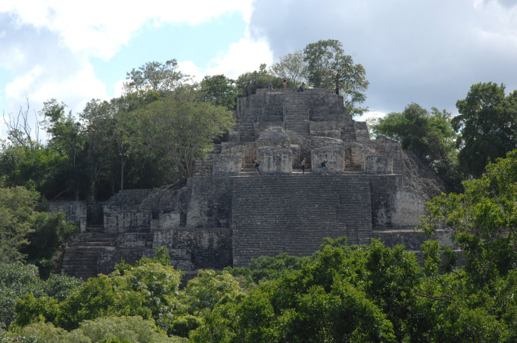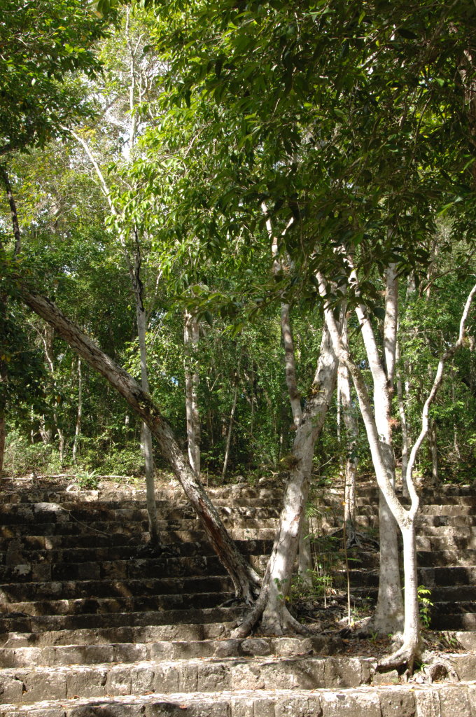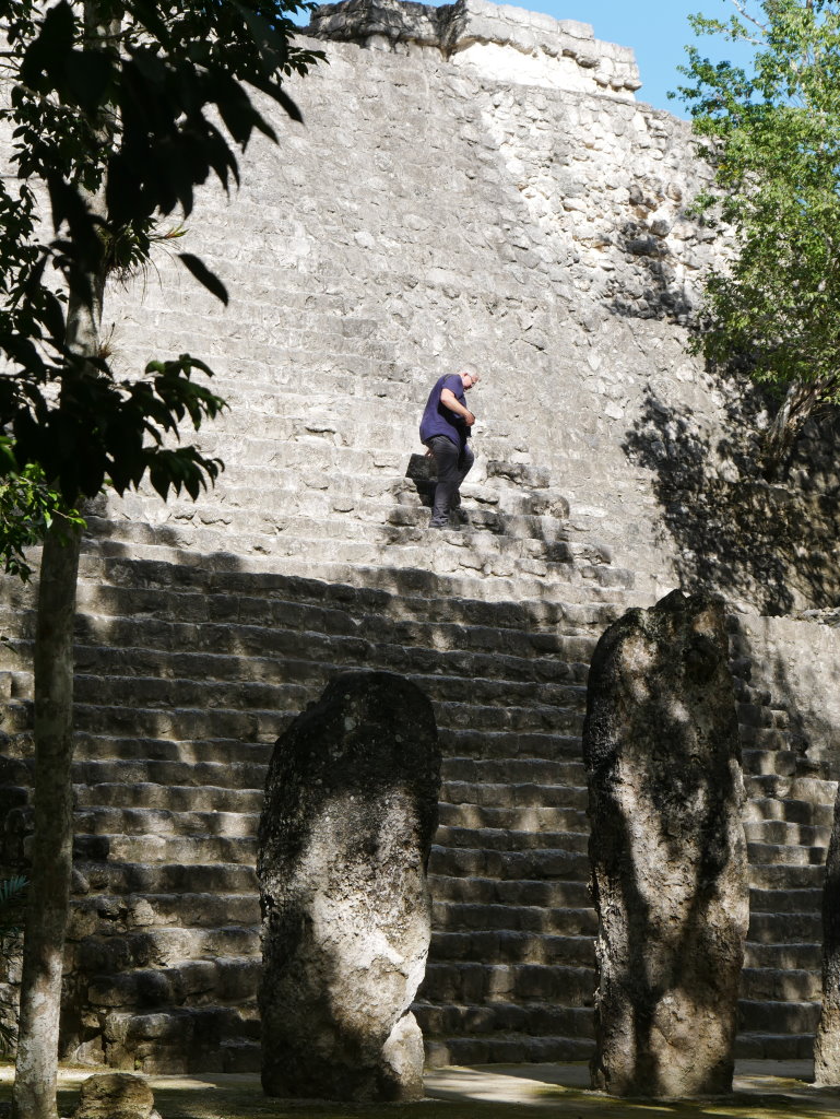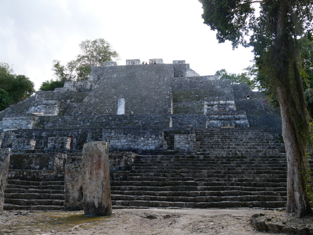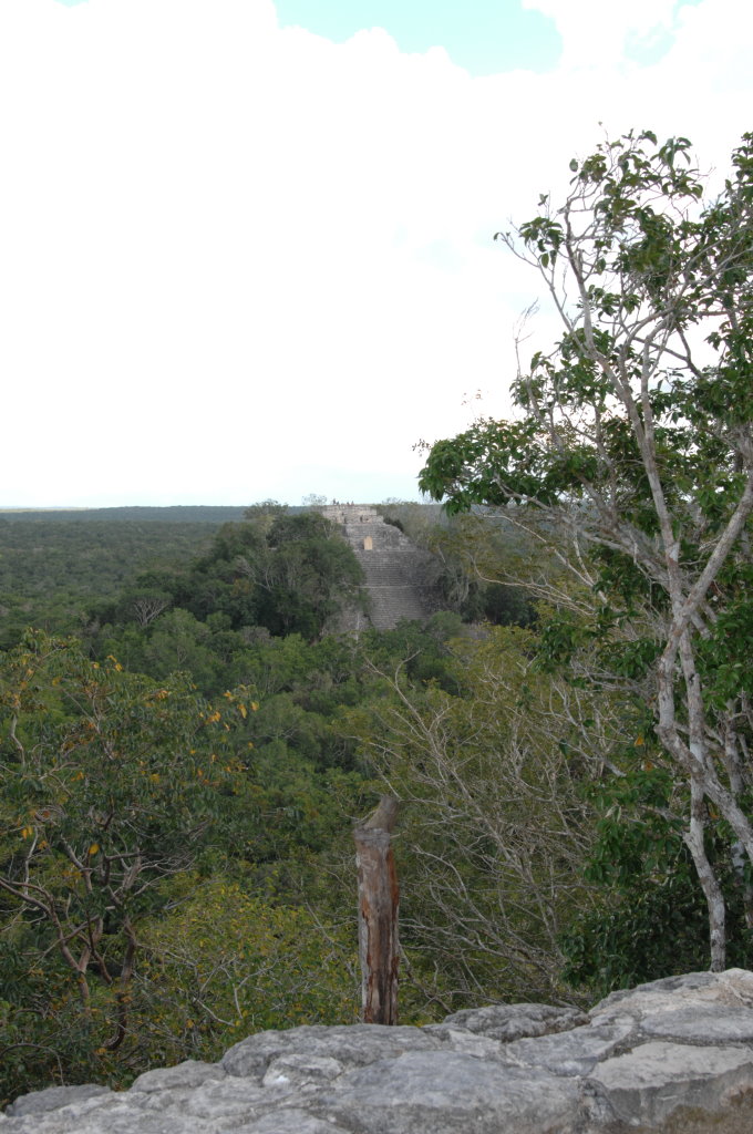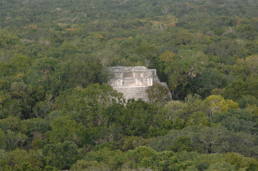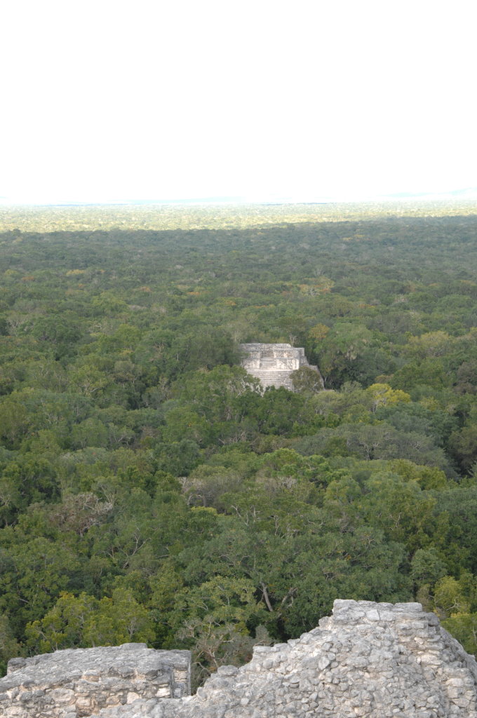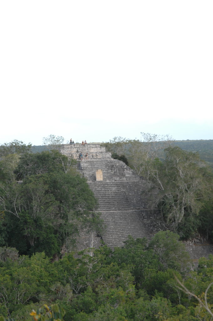 Nach einem halbstündigen Fußmarsch auf einem befestigten Dschungelpfad erreichen wir die Plaza Central mit der Estructura VIII und der gegenüberliegenden alles überragenden Estructura II. Im Gegensatz zur Hauptpyramide von Chichen Itza ist der Aufstieg hier erlaubt. Der Ausblick von der oberen Plattform dieser mit 45 Metern Höhe zweithöchsten Pyramide der Mayas ist die Anstrengung wert. Nur Tikal hat mit einem 65 Meter hohen Bauwerk mehr zu bieten.