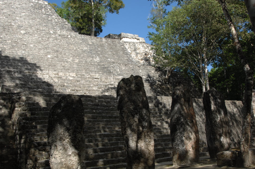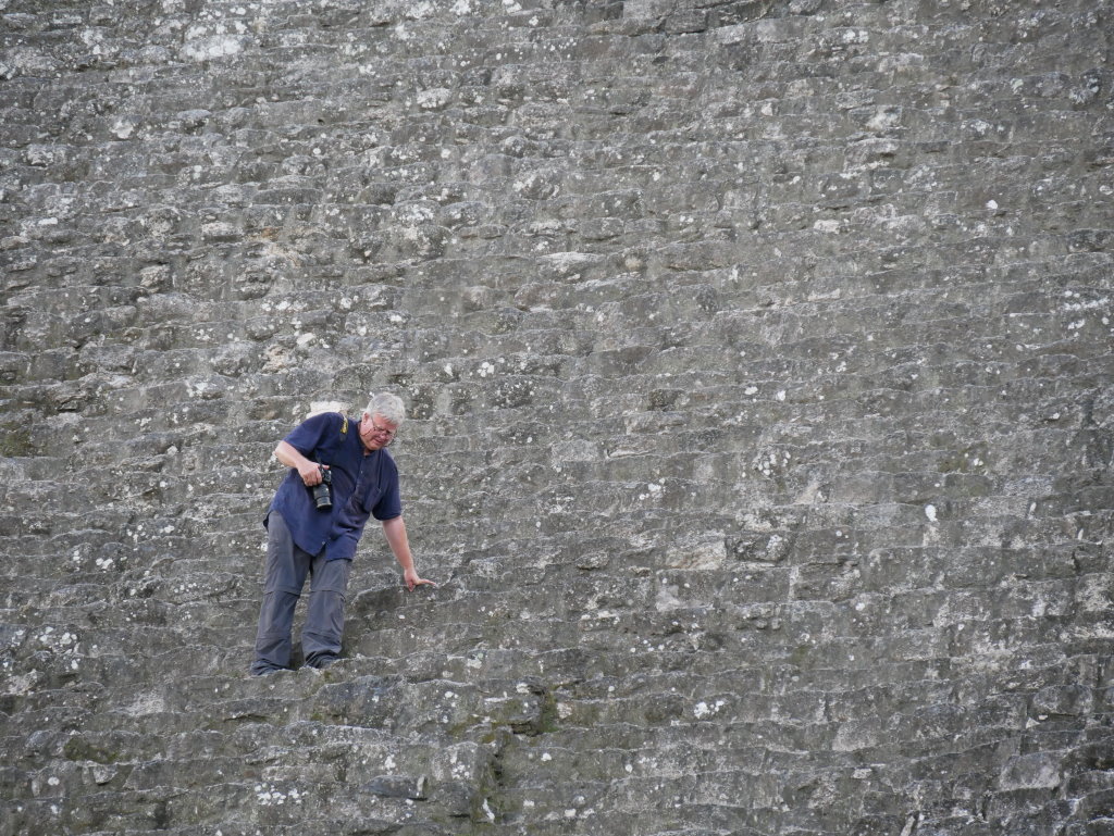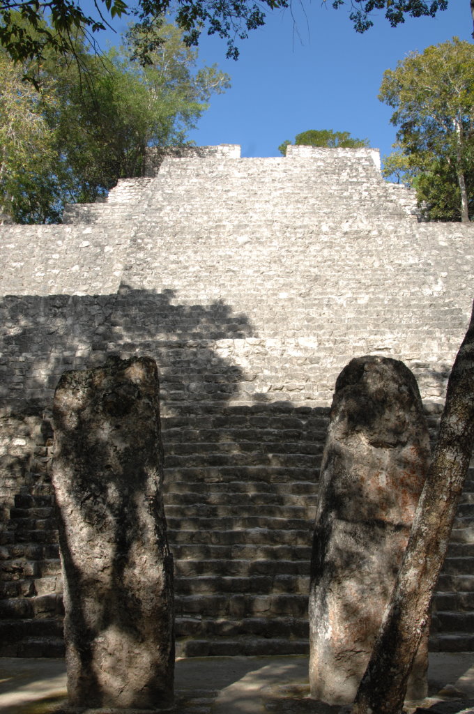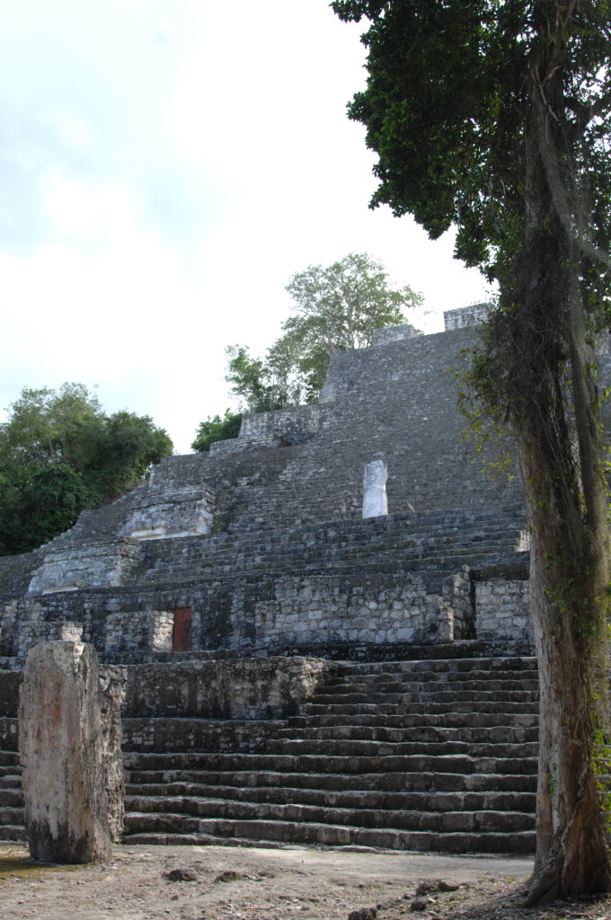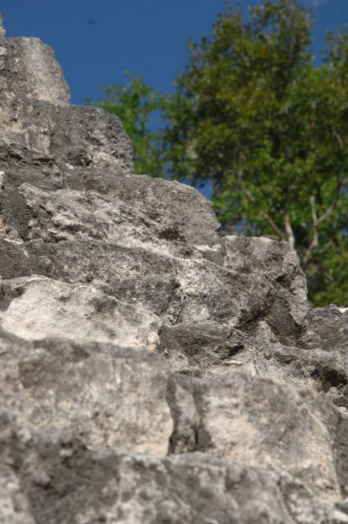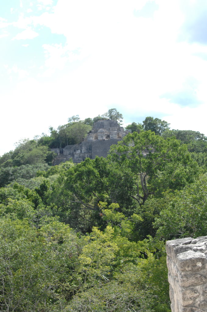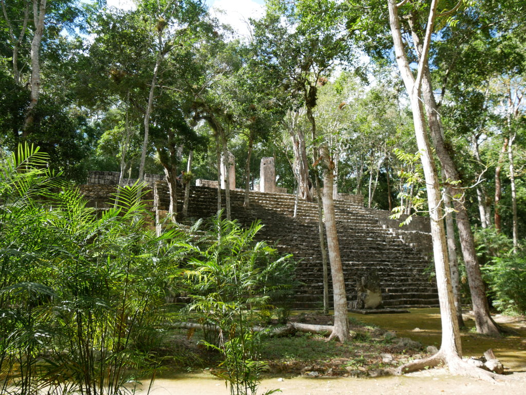 Nach einem halbstündigen Fußmarsch auf einem befestigten Dschungelpfad erreichen wir die Plaza Central mit der Estructura VIII und der gegenüberliegenden alles überragenden Estructura II. Im Gegensatz zur Hauptpyramide von Chichen Itza ist der Aufstieg hier erlaubt. Der Ausblick von der oberen Plattform dieser mit 45 Metern Höhe zweithöchsten Pyramide der Mayas ist die Anstrengung wert. Nur Tikal hat mit einem 65 Meter hohen Bauwerk mehr zu bieten.