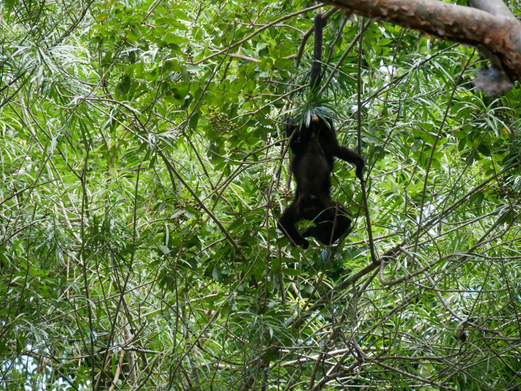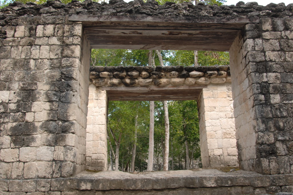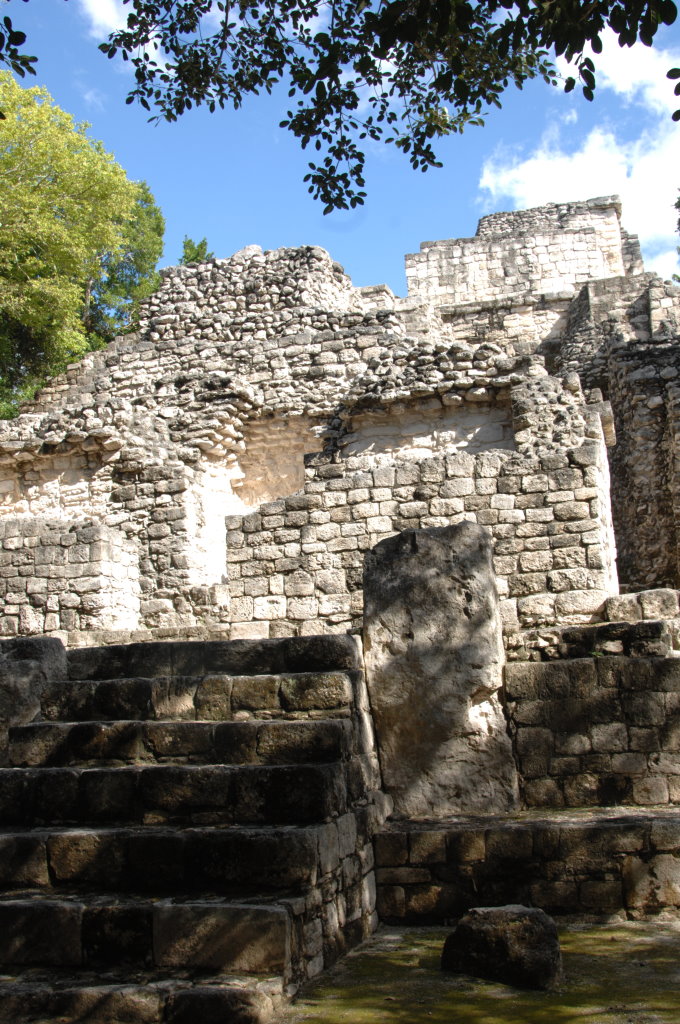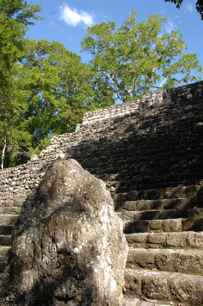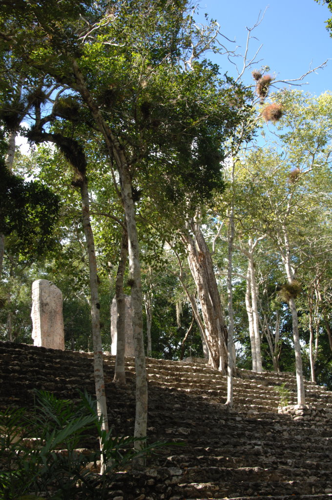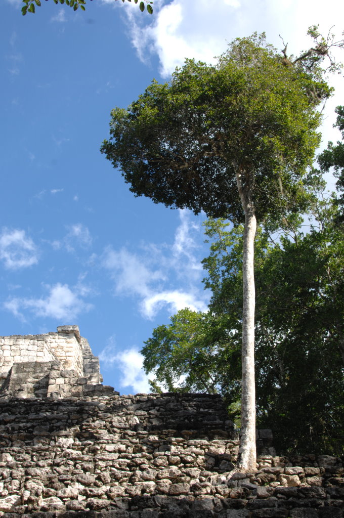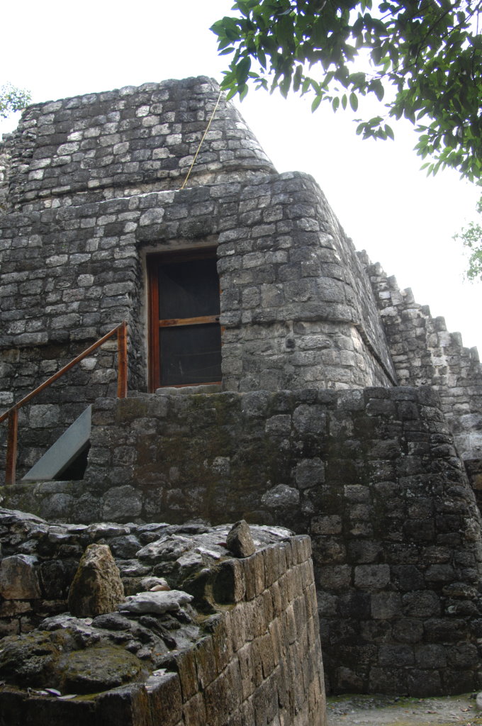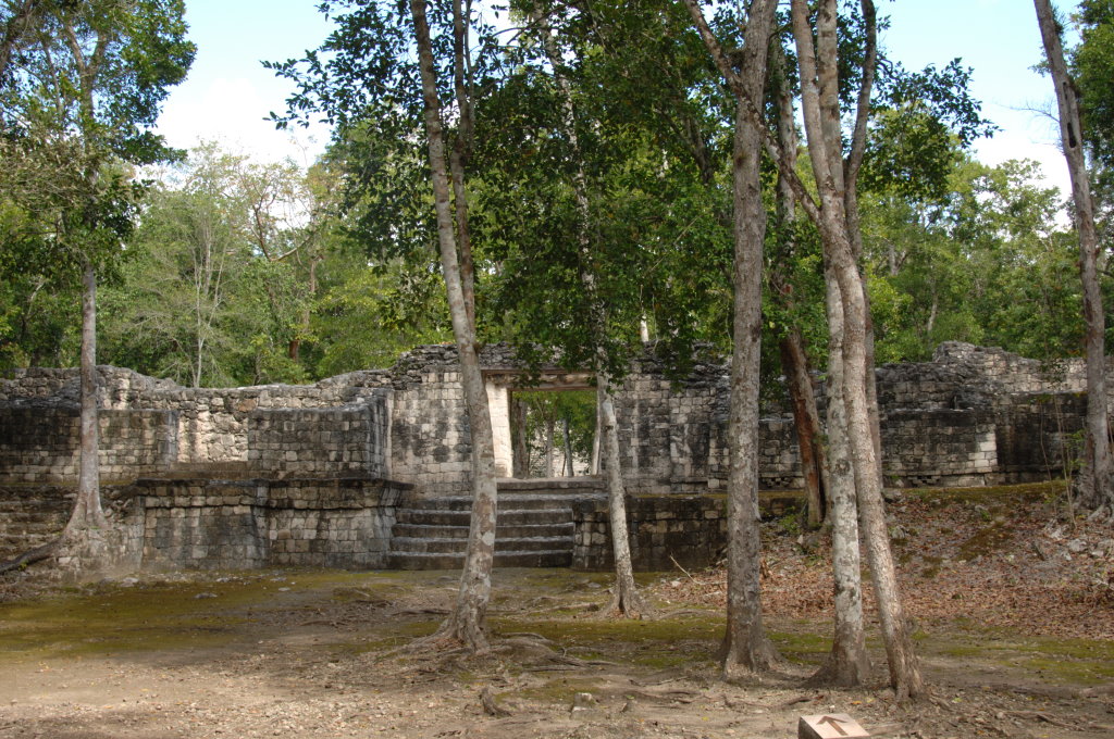 Nach einem halbstündigen Fußmarsch auf einem befestigten Dschungelpfad erreichen wir die Plaza Central mit der Estructura VIII und der gegenüberliegenden alles überragenden Estructura II. Im Gegensatz zur Hauptpyramide von Chichen Itza ist der Aufstieg hier erlaubt. Der Ausblick von der oberen Plattform dieser mit 45 Metern Höhe zweithöchsten Pyramide der Mayas ist die Anstrengung wert. Nur Tikal hat mit einem 65 Meter hohen Bauwerk mehr zu bieten.
