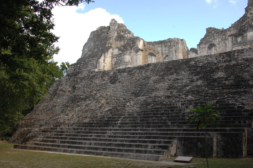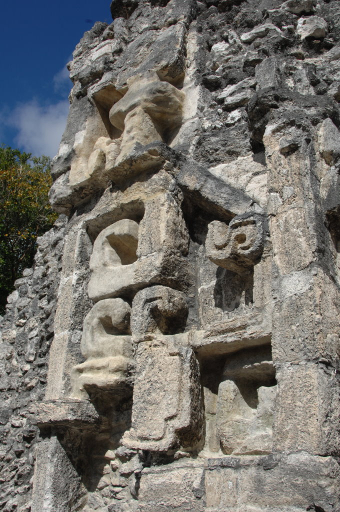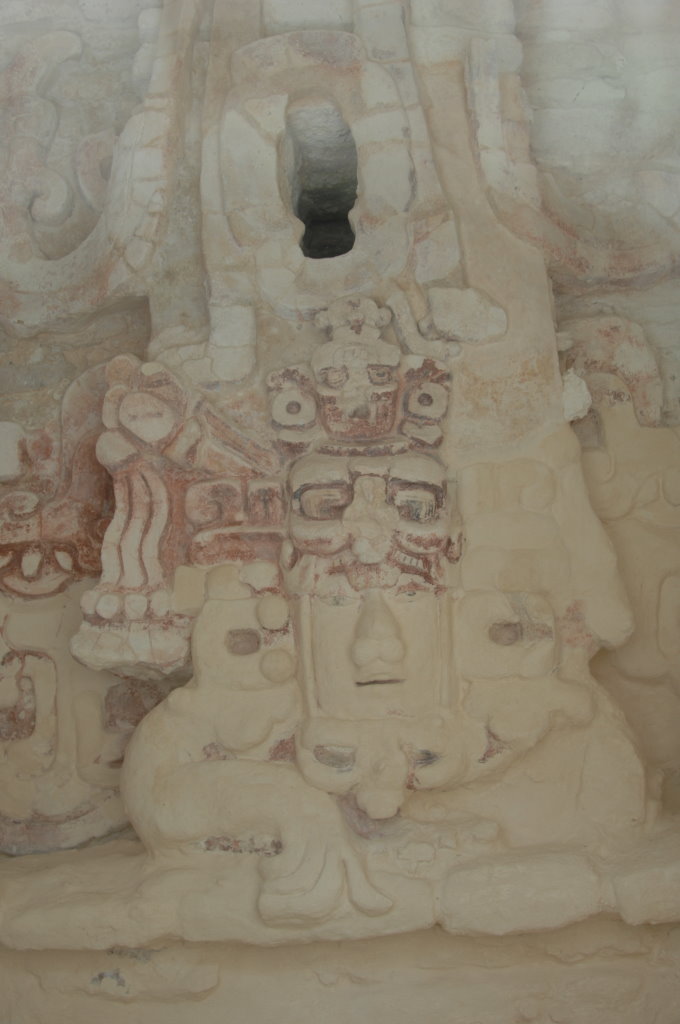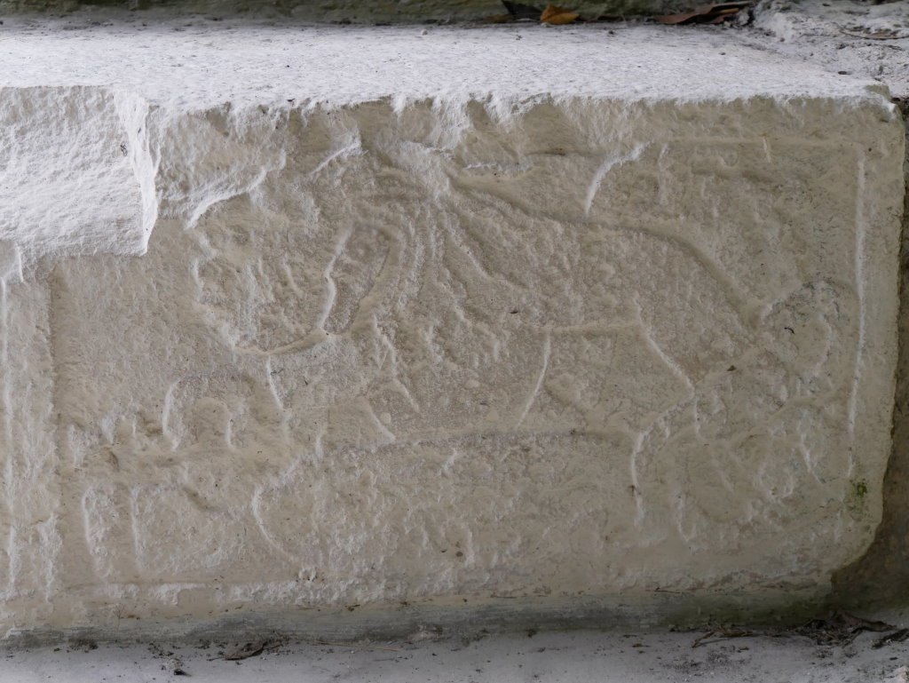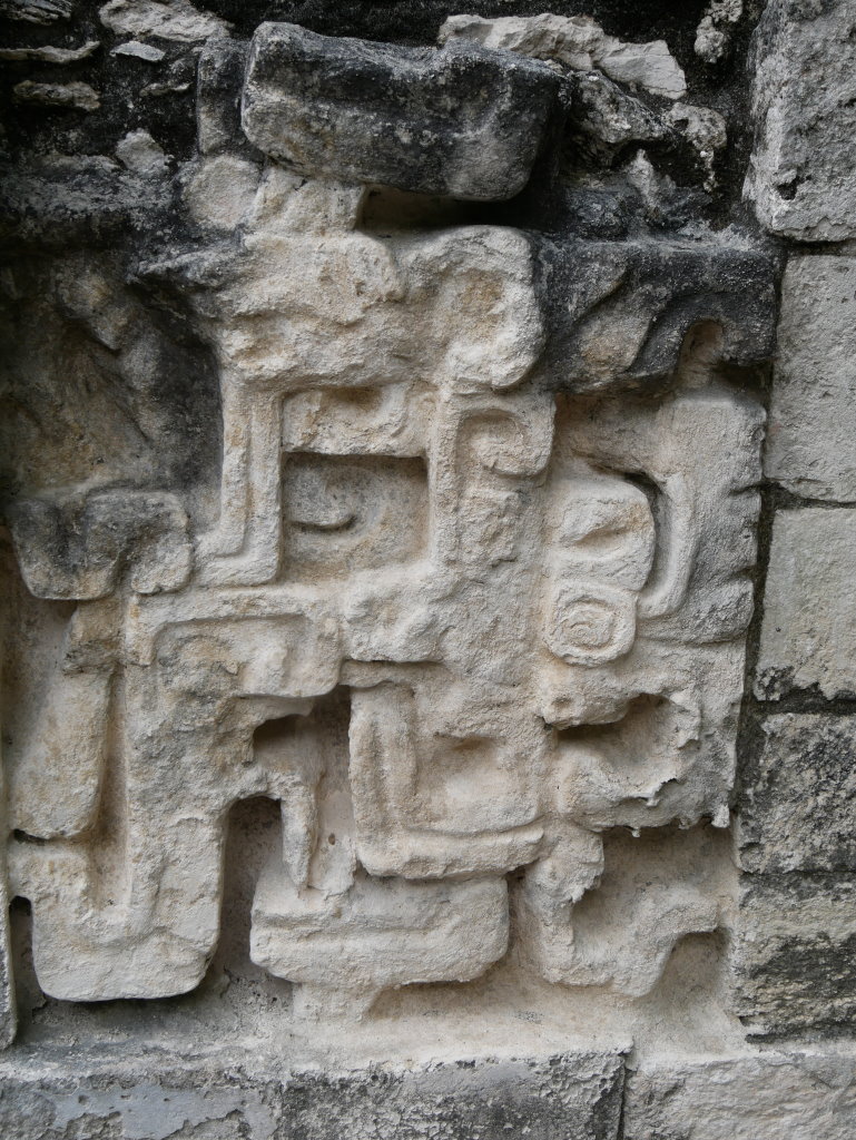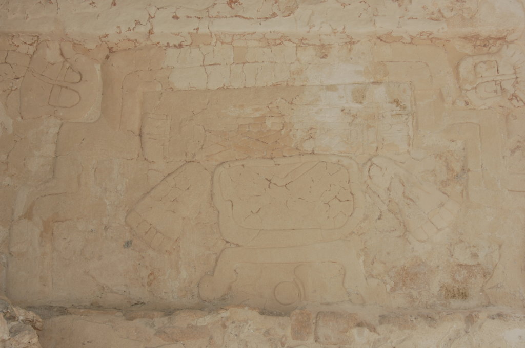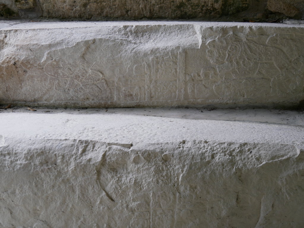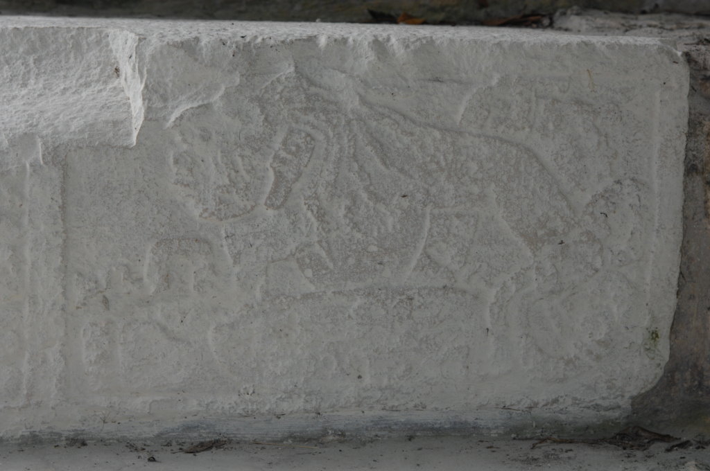 Nach diesem Triple am Vormittag fahren wir zum 87 Kilometer entfernten Dzibanché. Eine Überdachung der Haupttreppe des „Tempels der Gefangenen“ (Edificio 13) weckt unsere Neugier. An zwei der Stufen wurden Stuckreliefs freigelegt, von denen eines an die Umrisse eines Jaguars erinnert.
