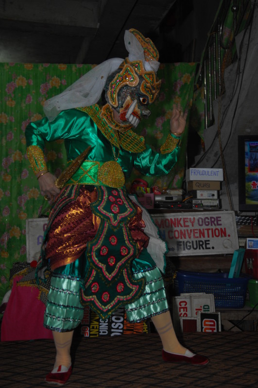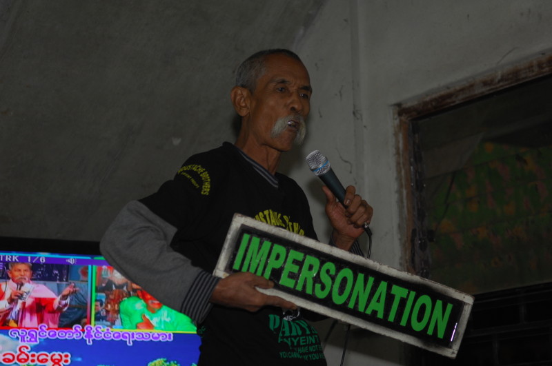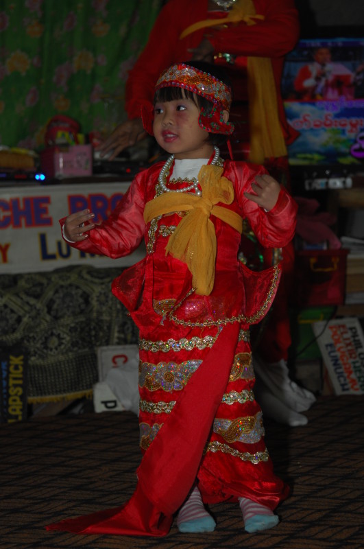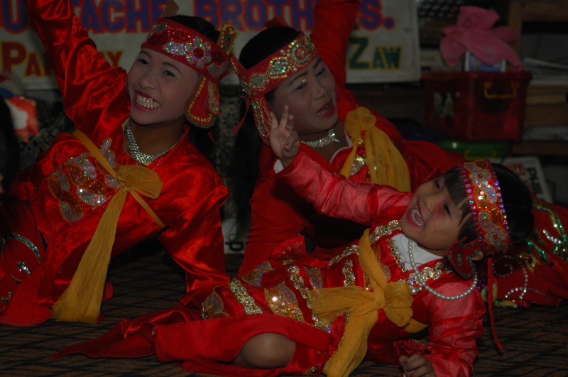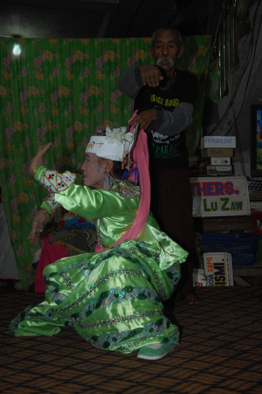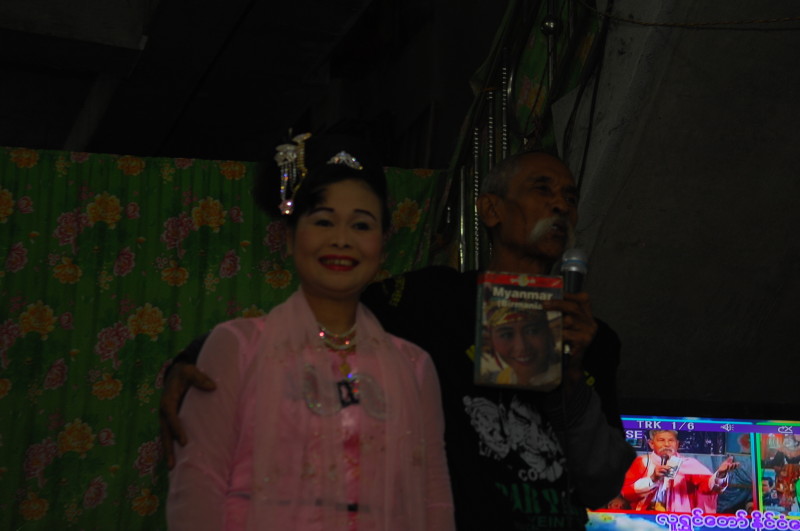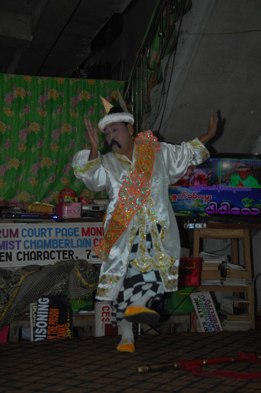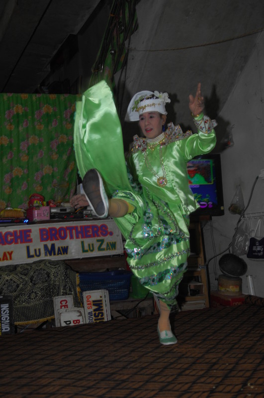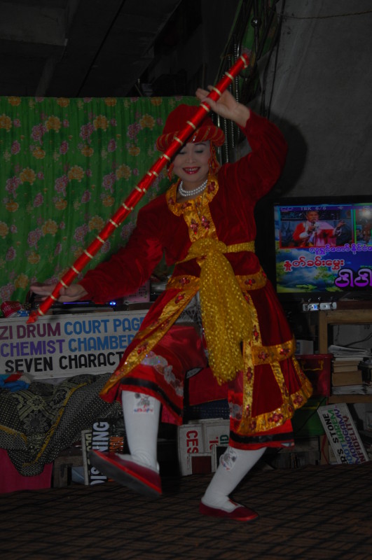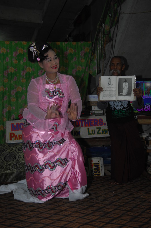 Den Hauptanteil an der Show übernehmen weitere Familienmitglieder. Das Programm besteht nicht wie man meinen könnte aus einer durchgehenden Comedy-Performance. Lu Maw’s Frau, eine Schwester, die Enkeltochter und drei weitere Tänzerinnen präsentieren mit Unterstützung des Cousins klassische birmanische Tänze sowie einen der ethnischen Minderheit der Karen. Die Figuren der Nath-Geschichten kannte ich bereits als Marionettentheater. Der Ogre, der Affe oder der Minister werden lebendig, die hier gezeigten Bewegungen sind das Vorbild für das Spiel der Puppen. Man wäre nicht bei den Moustache Brothers, wenn dies nicht auch mit einem kleinen Augenzwinkern vermittelt wird und der Conférencier Lu Maw im wahrsten Sinne des Wortes die Fäden in der Hand behält, wenn seine Frau zu tanzen beginnt.