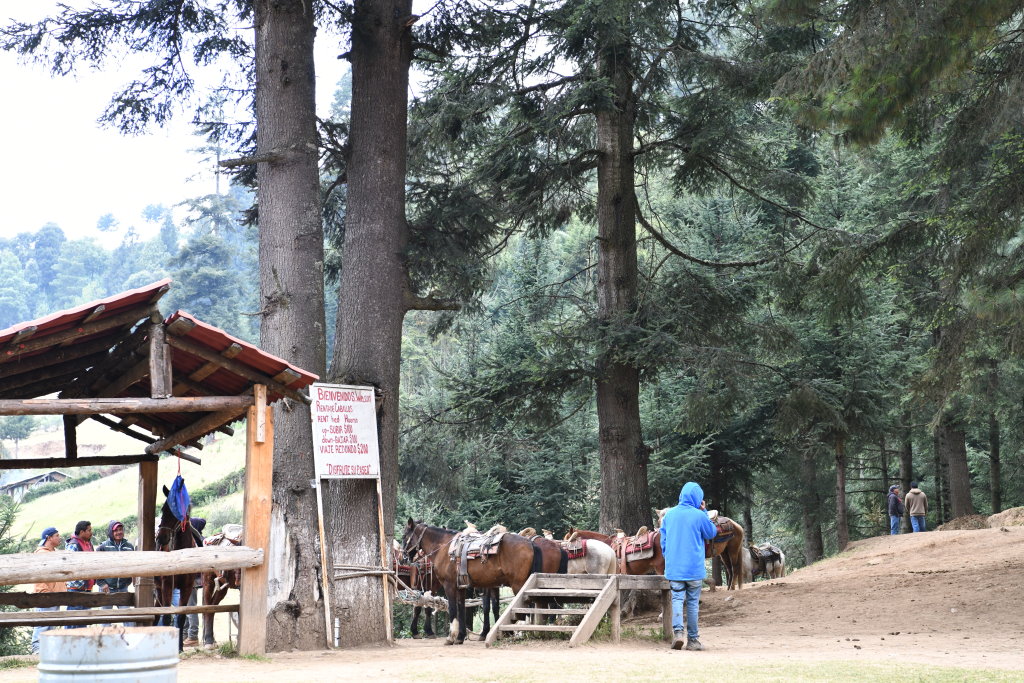 Von hier aus geht es auf einem Waldweg bergauf zu den Schmetterlingen. Zu Fuß müssten die zwei Kilometer in einer dreiviertel Stunde zu schaffen sein, erläutert uns einer der Guides an der Pforte. Das kann auch länger dauern, je nach Kondition. Es geht nämlich zum Teil ziemlich steil bergauf. Natürlich gibt es eine Alternative. Für rund 10 Euro hin und zurück kann man auch zu Pferd die Strecke bezwingen.